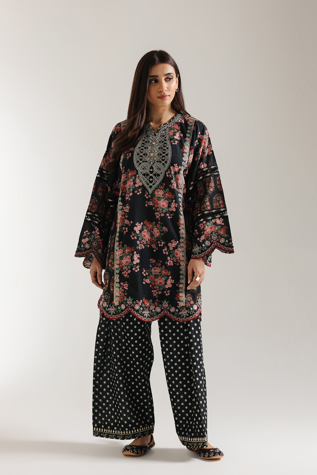 Introducing Rozana Collection chic two piece printed trouser shirt featuring delicate embroideries...