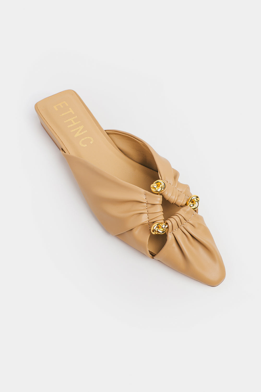 These backless pointed mules feature a sleek silhouette accented by three golden studs arranged in a distinctive triangle shape on the upper, adding a subtle yet striking detail. Designed for effortless elegance, they offer comfort and versatility, making them ideal for both professional settings and stylish casual wear.