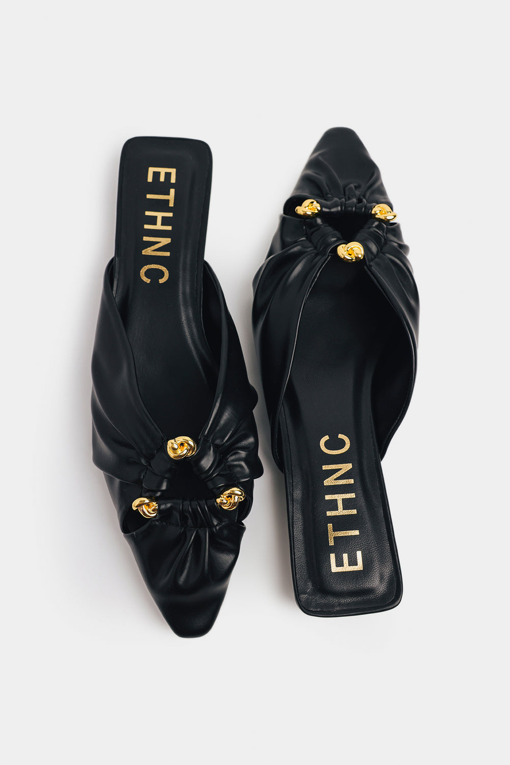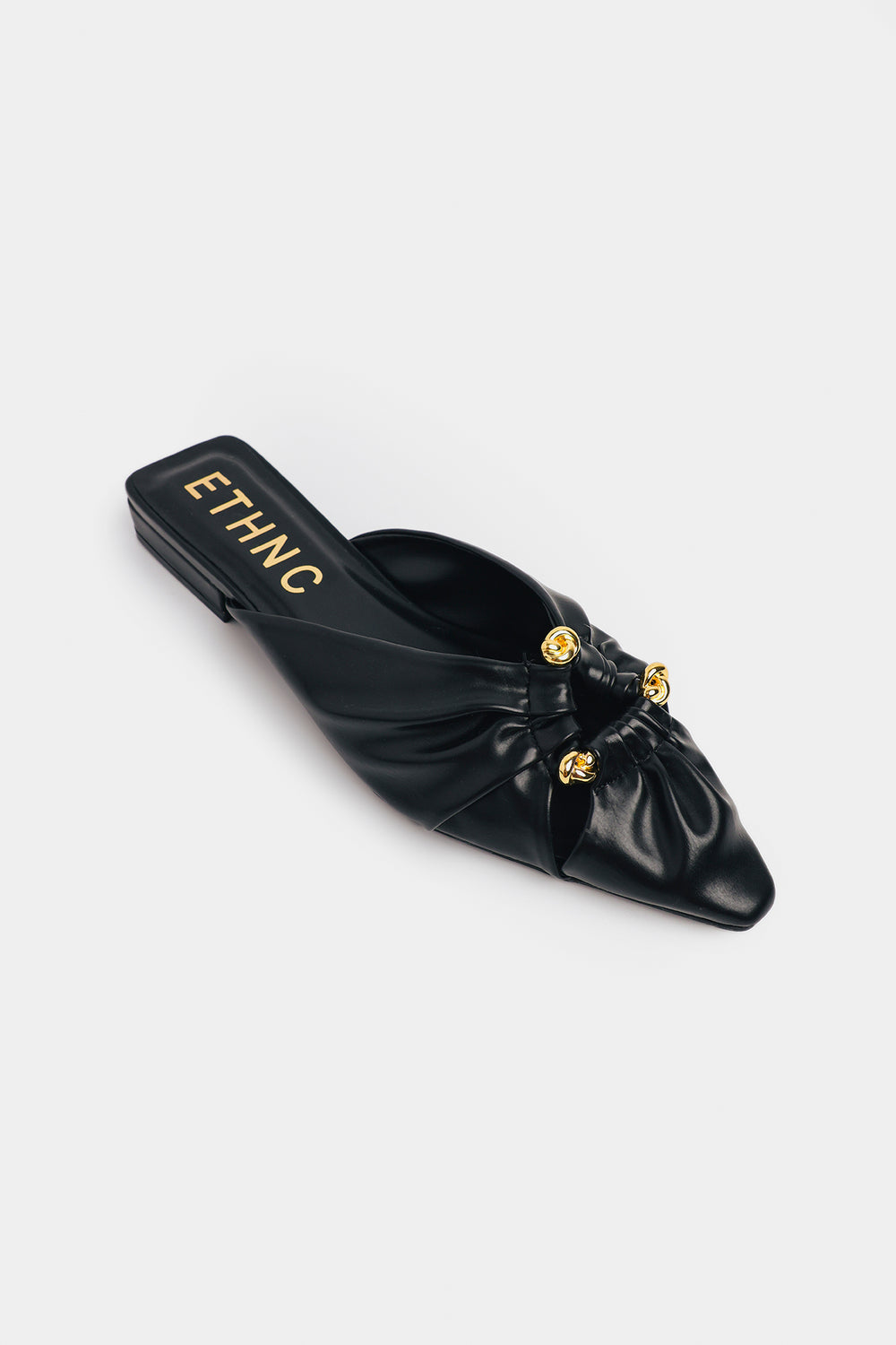 These backless pointed mules feature a sleek silhouette accented by three golden studs arranged in a distinctive triangle shape on the upper, adding a subtle yet striking detail. Designed for effortless elegance, they offer comfort and versatility, making them ideal for both professional settings and stylish casual wear.