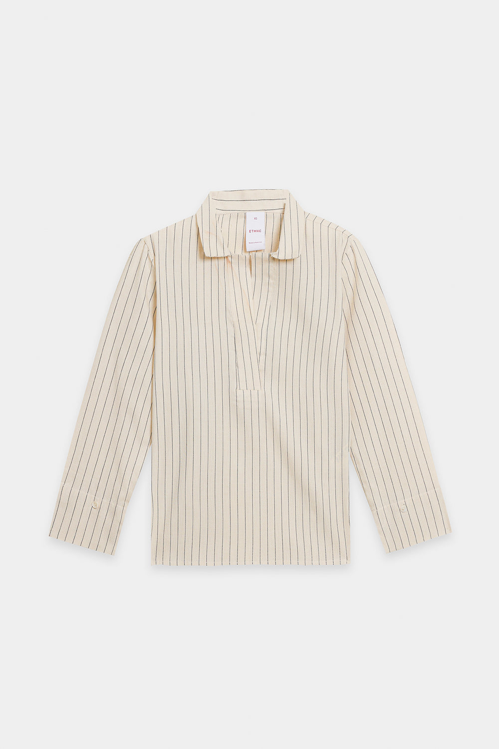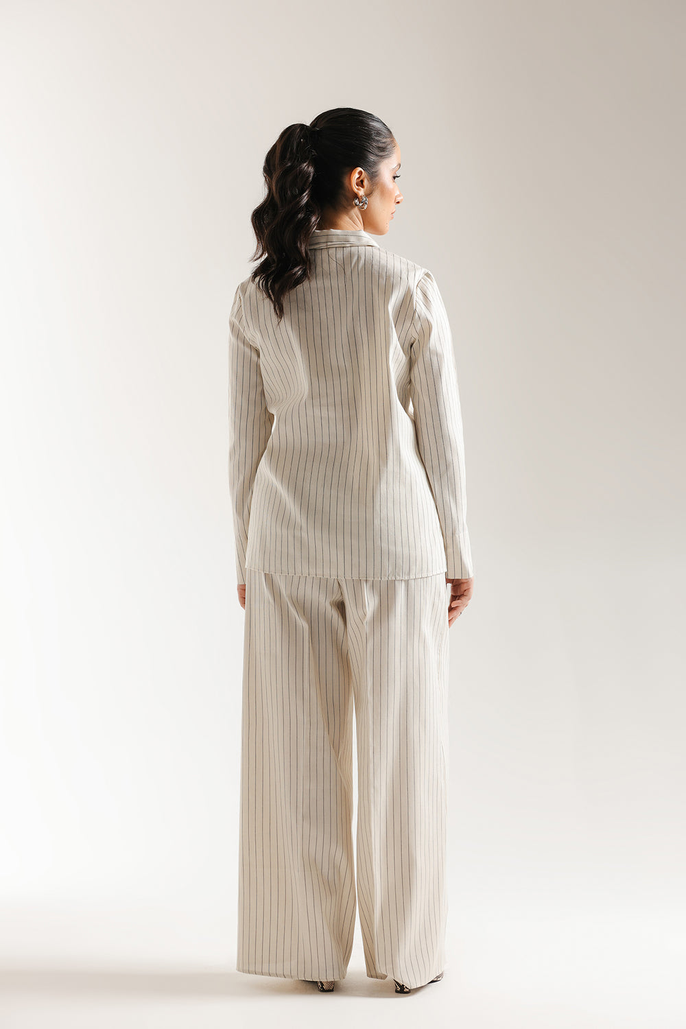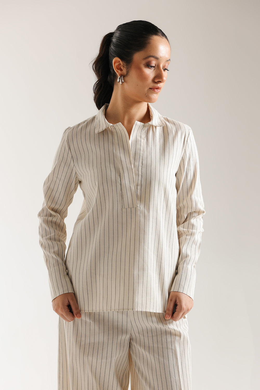 Elevate your wardrobe with this sophisticated off-white collar shirt featuring a striking V-slit neckline adorned with refined black line detailing. The contemporary pattern adds visual interest while maintaining understated elegance. Paired with matching wide-leg trousers, this ensemble delivers a polished, modern silhouette perfect for both professional settings and elevated casual occasions. The relaxed fit of the trousers balances the structured shirt, creating a harmonious look that flatters various body types. Crafted for those who appreciate quality tailoring and timeless style.