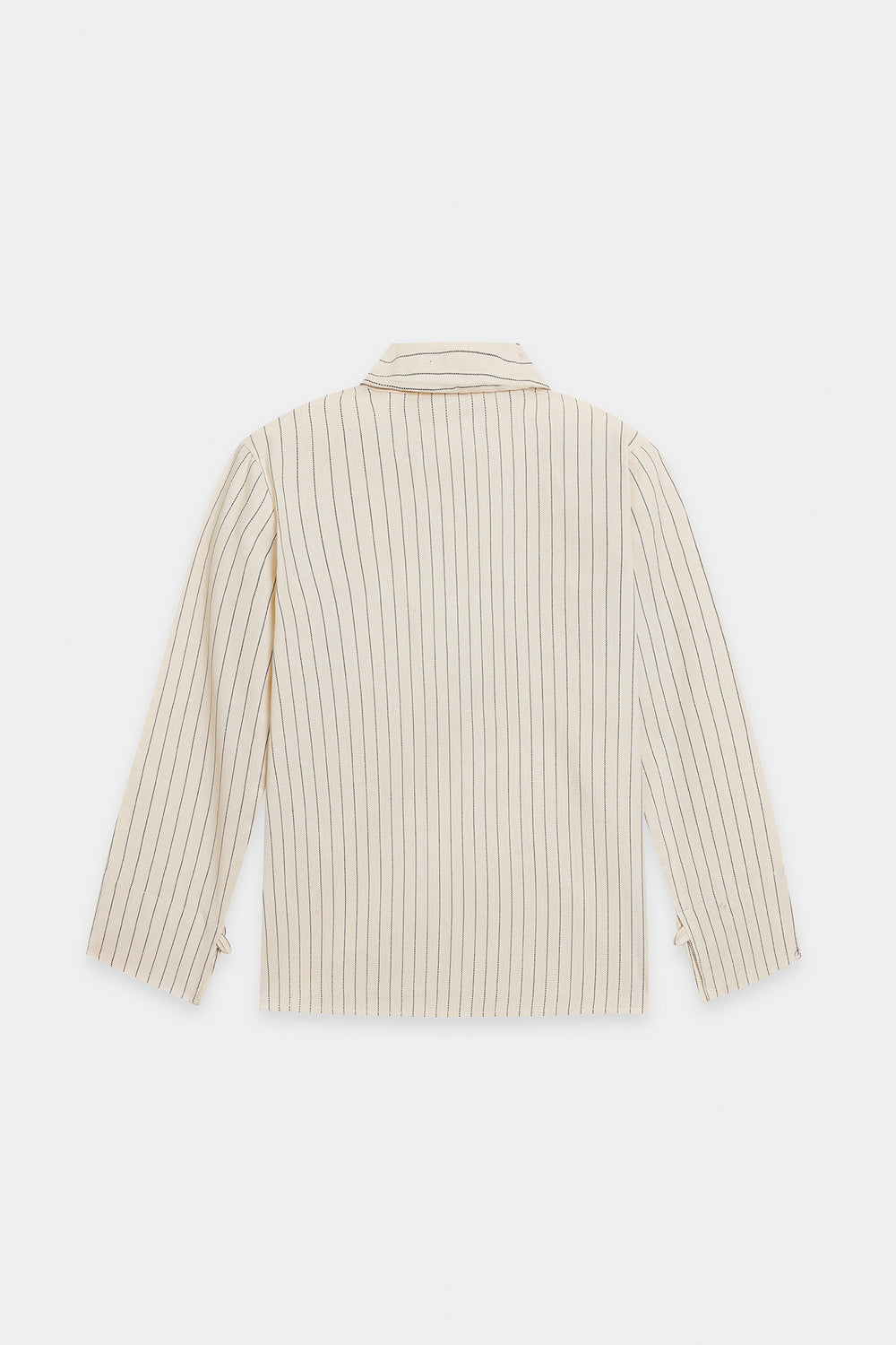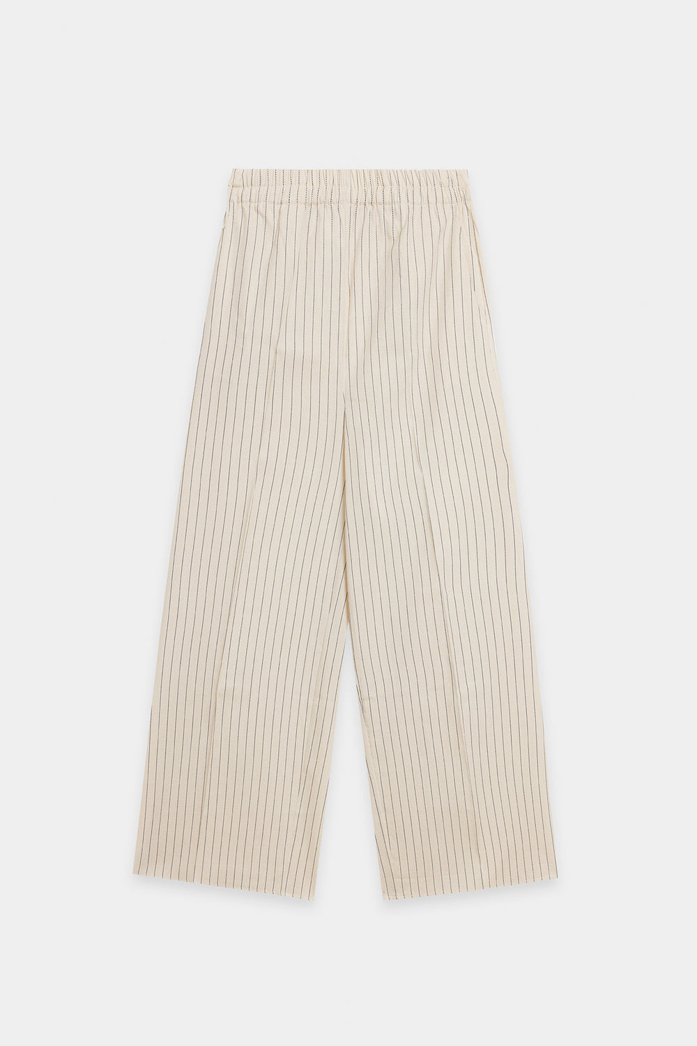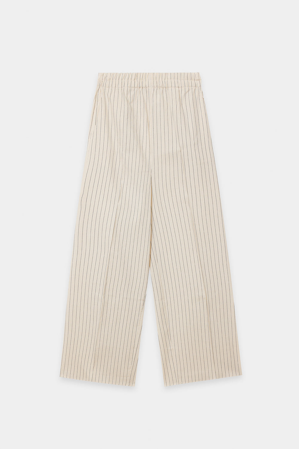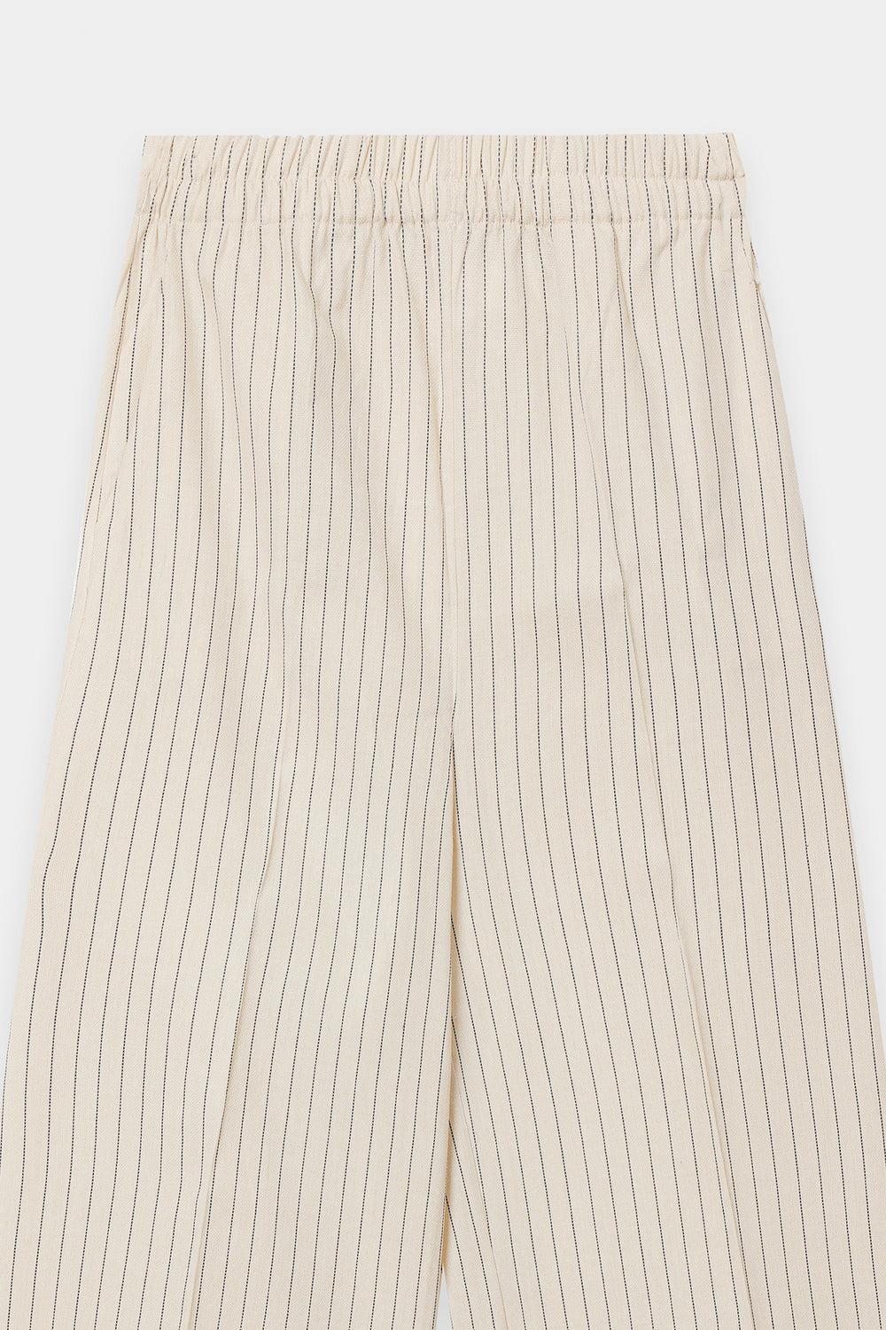 Elevate your wardrobe with this sophisticated off-white collar shirt featuring a striking V-slit neckline adorned with refined black line detailing. The contemporary pattern adds visual interest while maintaining understated elegance. Paired with matching wide-leg trousers, this ensemble delivers a polished, modern silhouette perfect for both professional settings and elevated casual occasions. The relaxed fit of the trousers balances the structured shirt, creating a harmonious look that flatters various body types. Crafted for those who appreciate quality tailoring and timeless style.