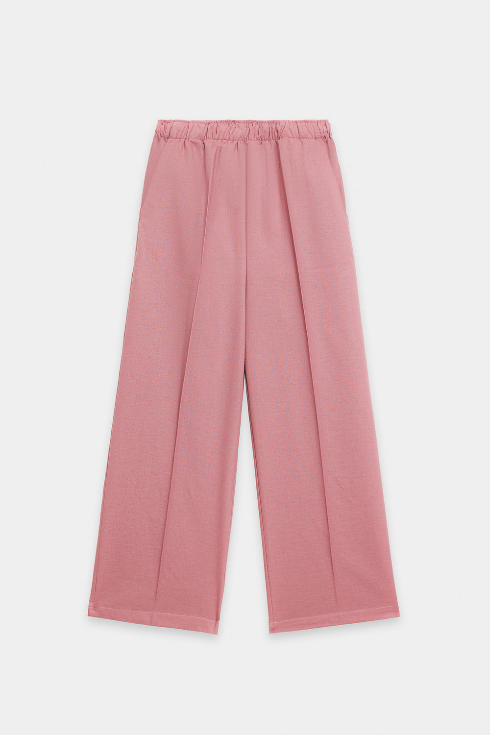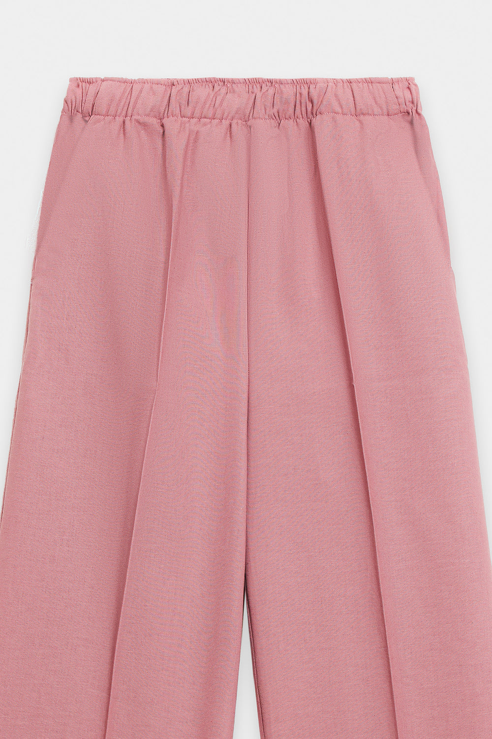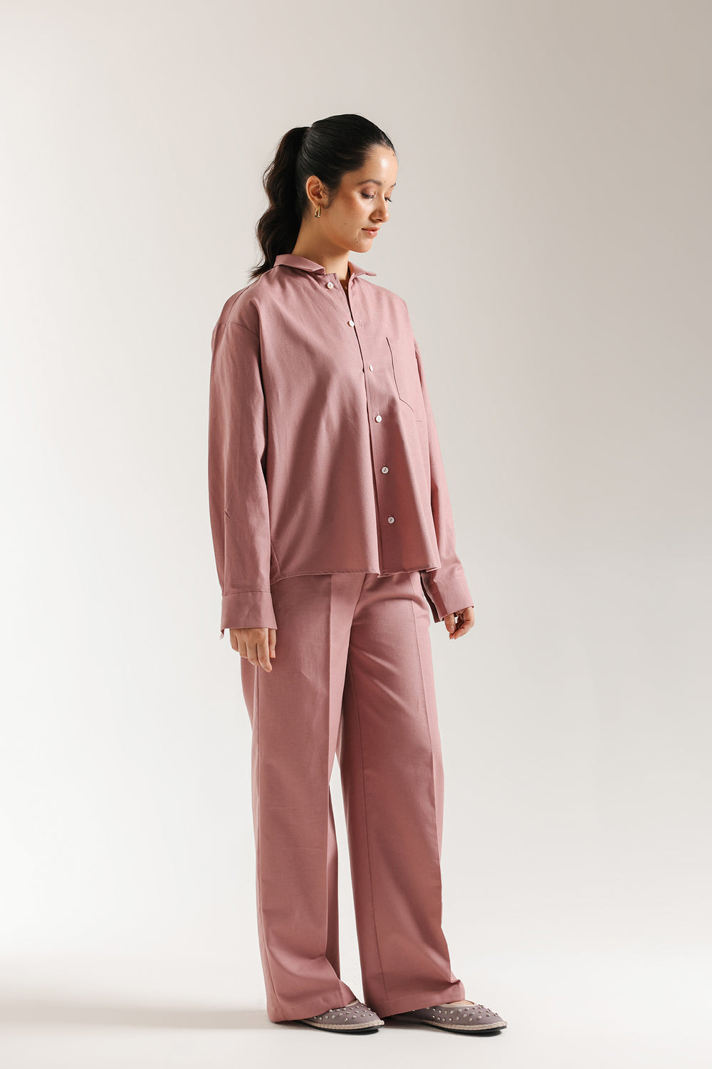 This sophisticated ensemble showcases a captivating design in a tea pink color. The fashionable top boasts a refined button-down style with a pointed collar and rounded hem, while the flared trousers finish off the look. Versatile enough for formal occasions and relaxed outings alike this season.