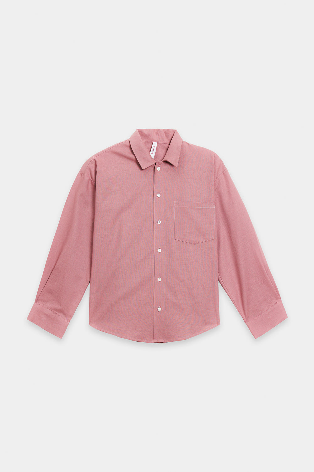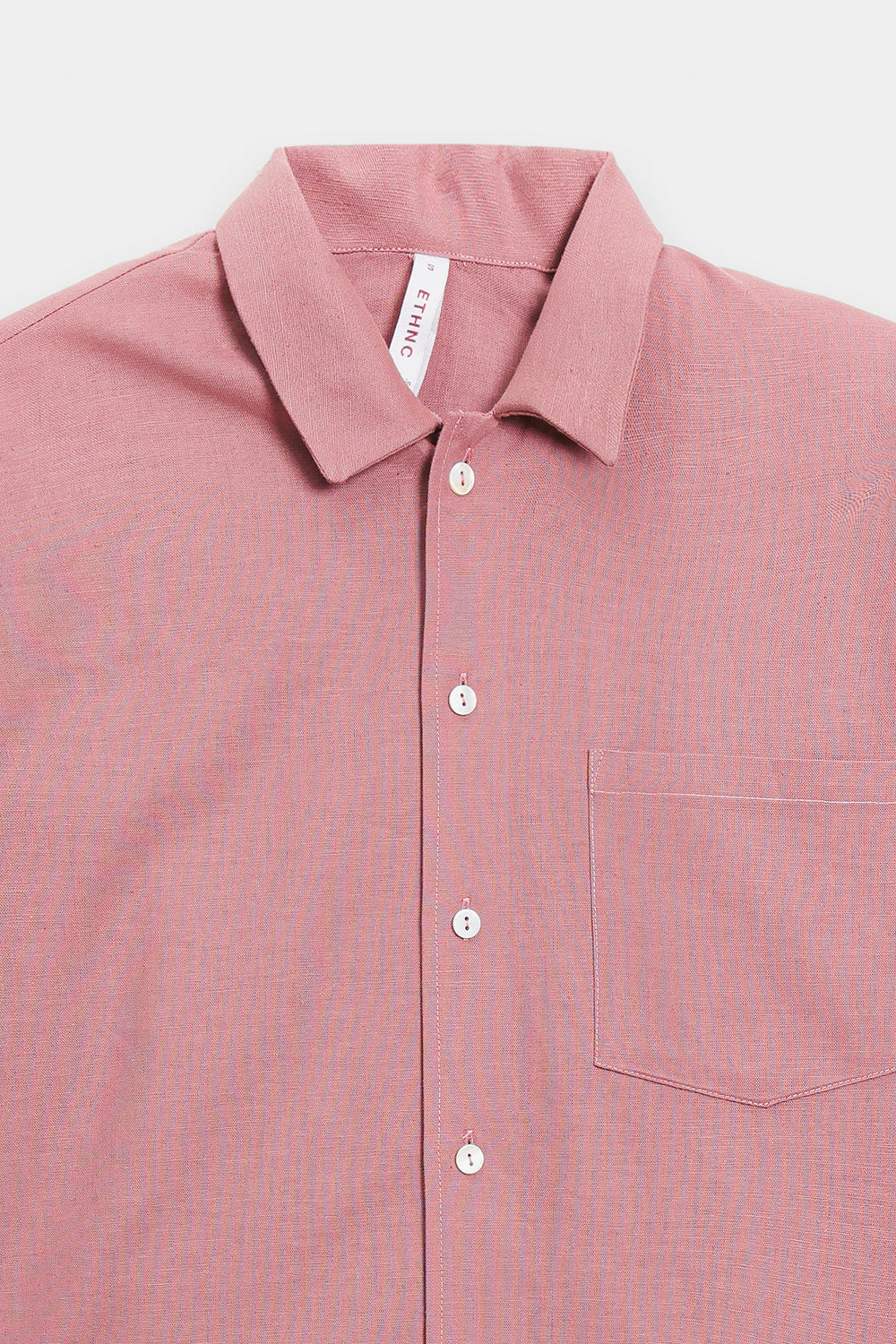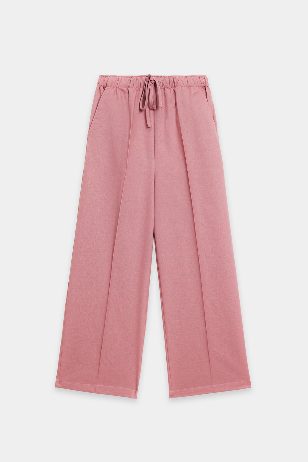 This sophisticated ensemble showcases a captivating design in a tea pink color. The fashionable top boasts a refined button-down style with a pointed collar and rounded hem, while the flared trousers finish off the look. Versatile enough for formal occasions and relaxed outings alike this season.