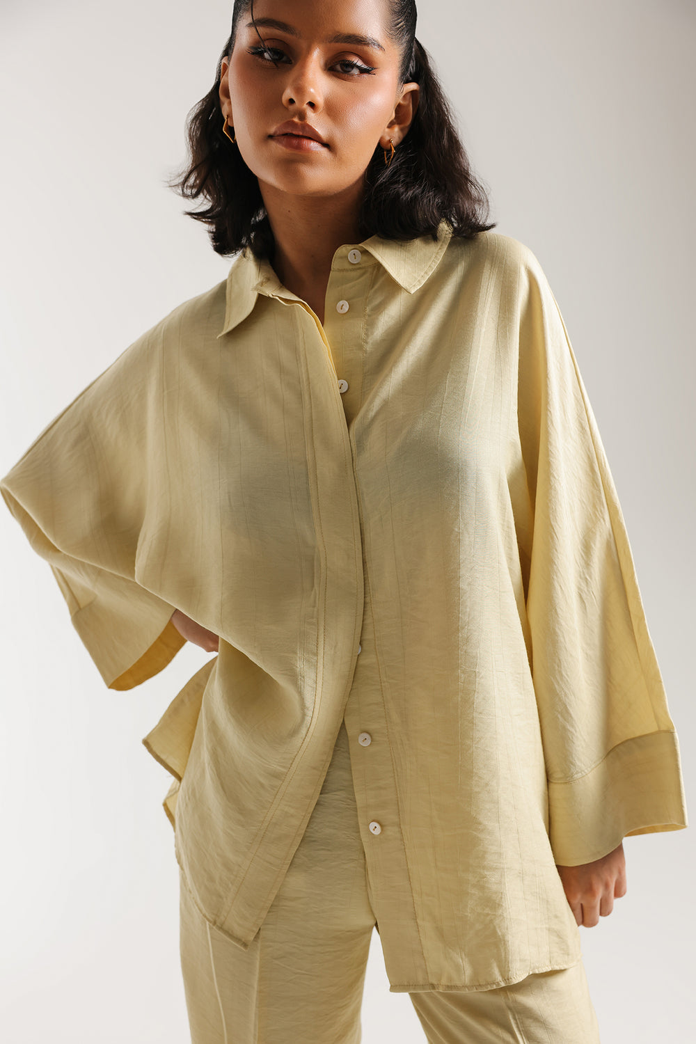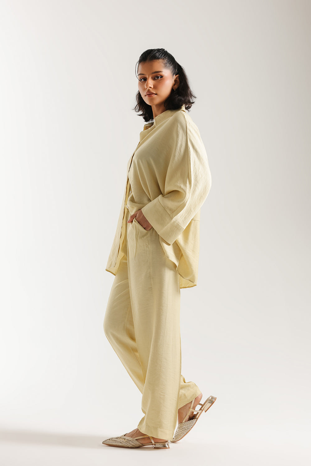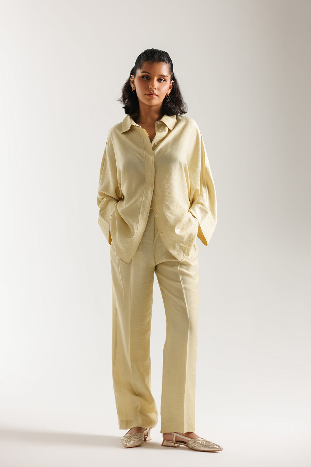 Elevate your wardrobe with this sophisticated butter-yellow ensemble that effortlessly blends comfort and elegance. The oversized shirt features a relaxed, dropped-shoulder silhouette with a classic button-down front and flowing, elongated sleeves—perfect for layering or wearing loosely as a light outer piece. The hem sits below the hip, allowing for versatile styling options including a chic half-tuck. Paired with tailored straight-leg trousers, this set delivers a polished contrast. Ideal for both professional settings and elevated casual occasions.