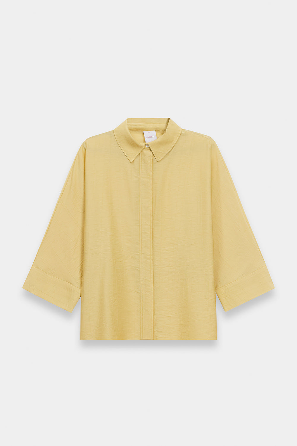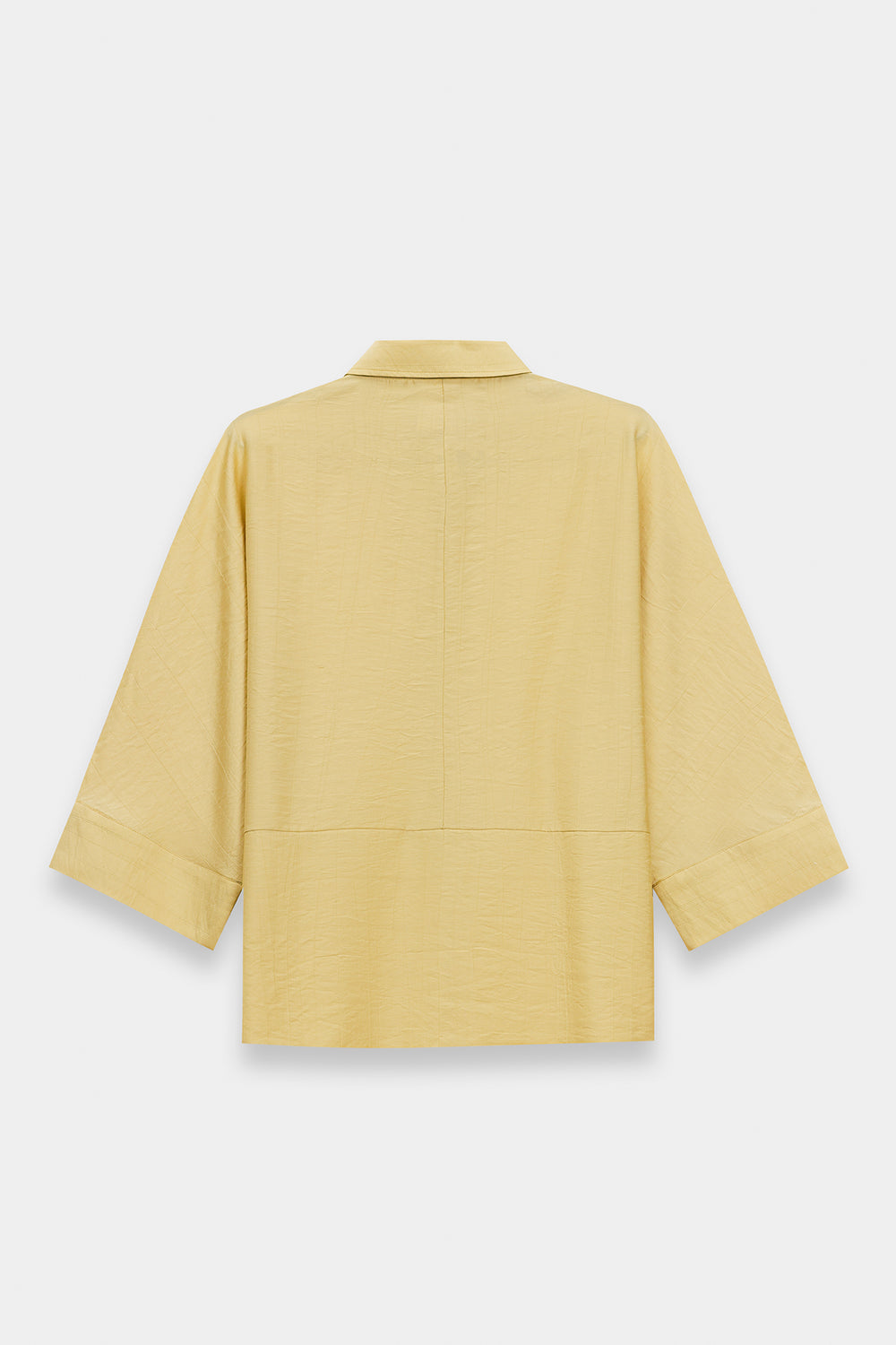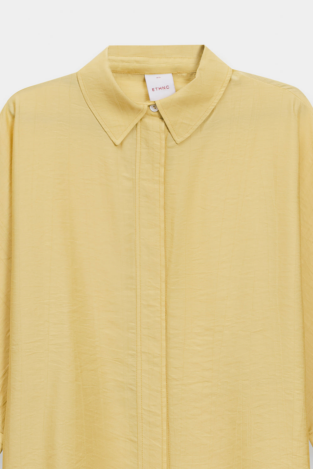 Elevate your wardrobe with this sophisticated butter-yellow ensemble that effortlessly blends comfort and elegance. The oversized shirt features a relaxed, dropped-shoulder silhouette with a classic button-down front and flowing, elongated sleeves—perfect for layering or wearing loosely as a light outer piece. The hem sits below the hip, allowing for versatile styling options including a chic half-tuck. Paired with tailored straight-leg trousers, this set delivers a polished contrast. Ideal for both professional settings and elevated casual occasions.