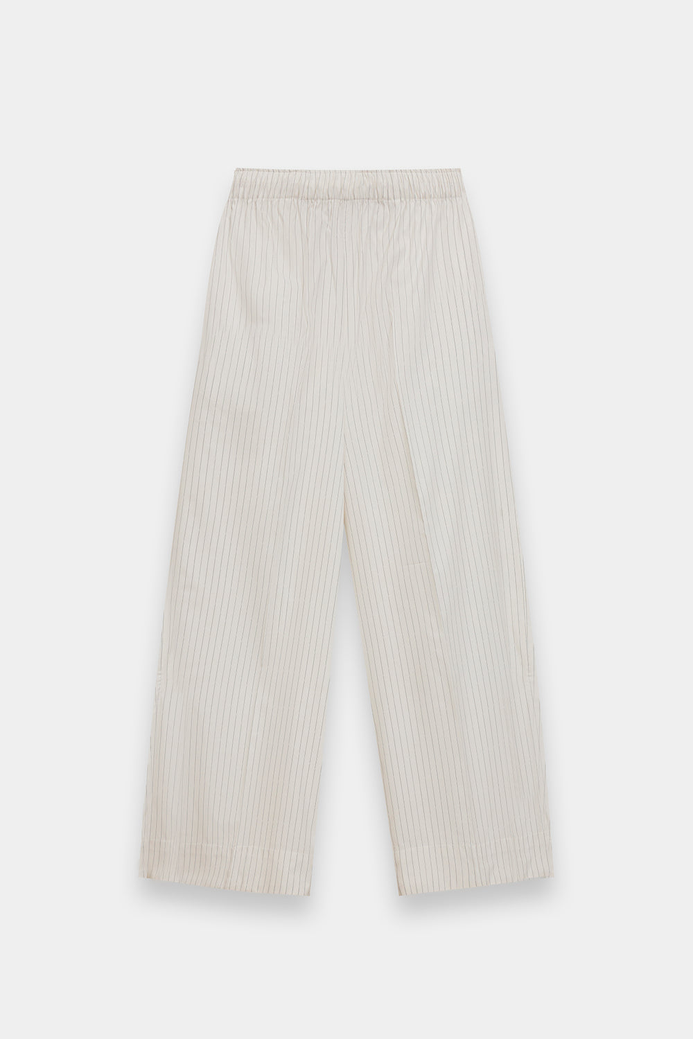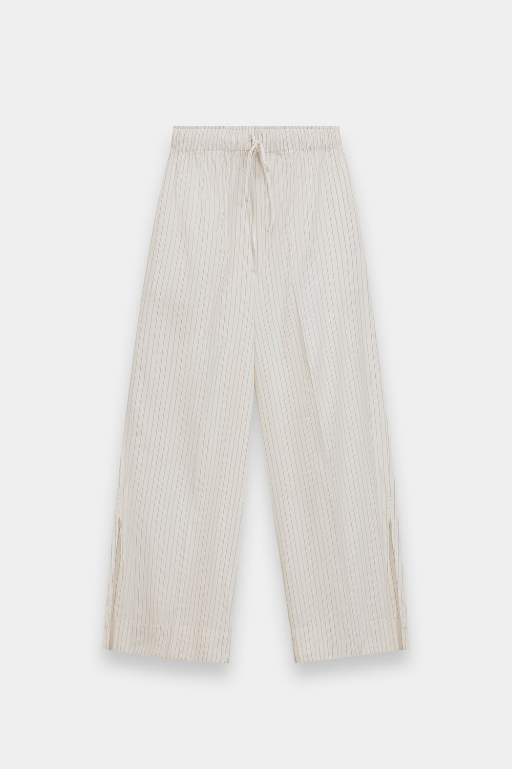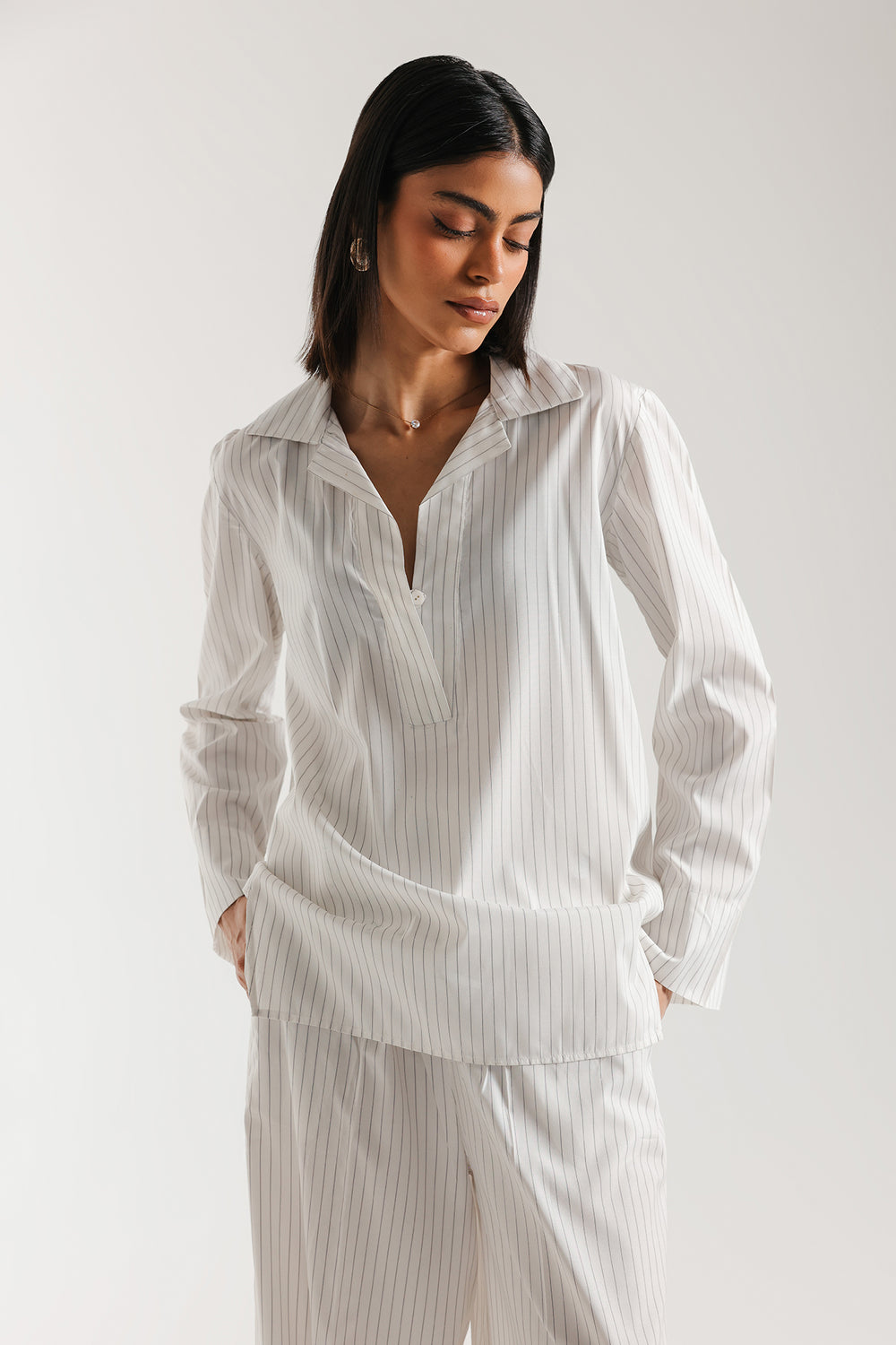 Experience a look of effortless grace in this ivory-toned solid suit, featuring a long-line tunic with a contemporary split-neckline and a classic pointed collar. The shirt is designed with a relaxed, straight-cut silhouette that promotes a clean and sophisticated aesthetic. Subtle vertical texturing within the fabric adds a layer of refined detail to the monochromatic palette. The ensemble is perfectly coordinated with matching wide-leg trouser that flow elegantly, creating a streamlined and polished appearance.