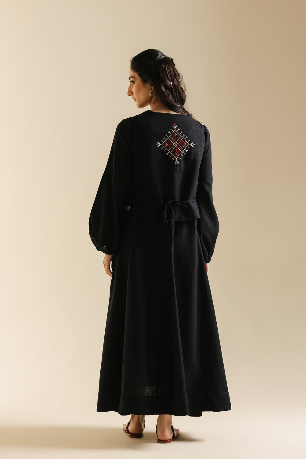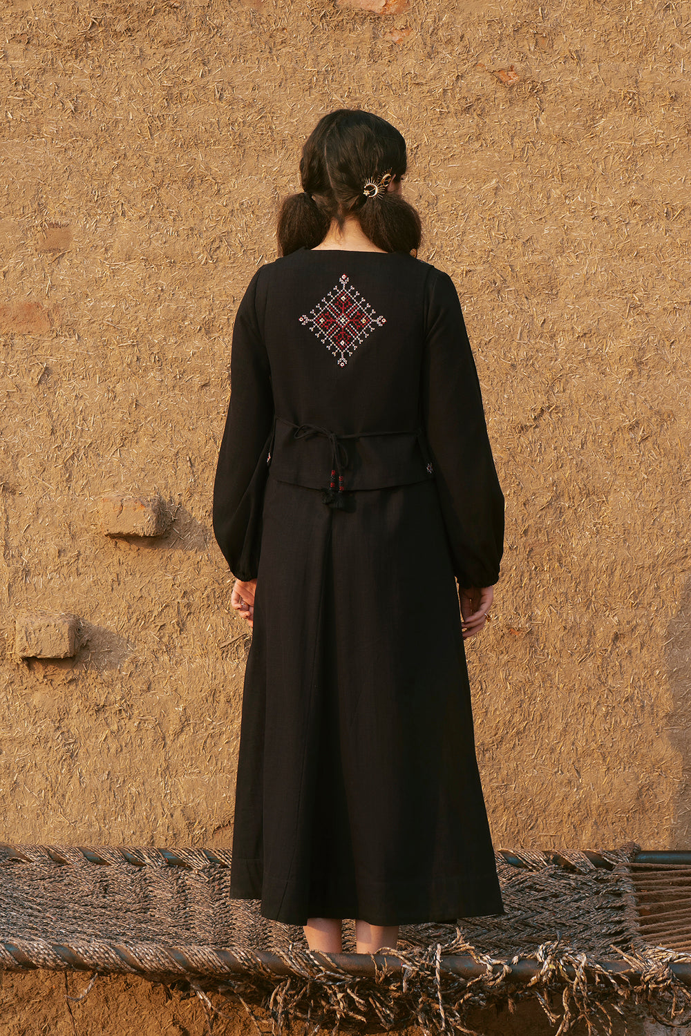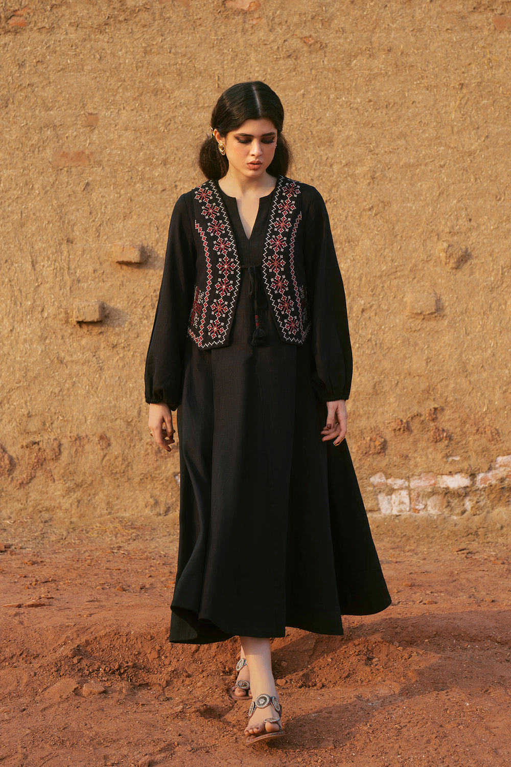 Embrace dramatic elegance with this stunning black embroidered dress and waistcoat set. This sophisticated two-piece ensemble features a flowing black maxi dress crafted from a rich, textured fabric. The dress itself offers a relaxed, graceful silhouette with voluminous balloon-style sleeves that cinch neatly at the wrist. The look is elevated by the integrated waistcoat detailing attached over the bodice, which is intricately adorned with rich red, white, and black geometric embroidery. This piece seamlessly combines traditional artistry with a contemporary, high-fashion aesthetic, making it perfect for a memorable occasion.