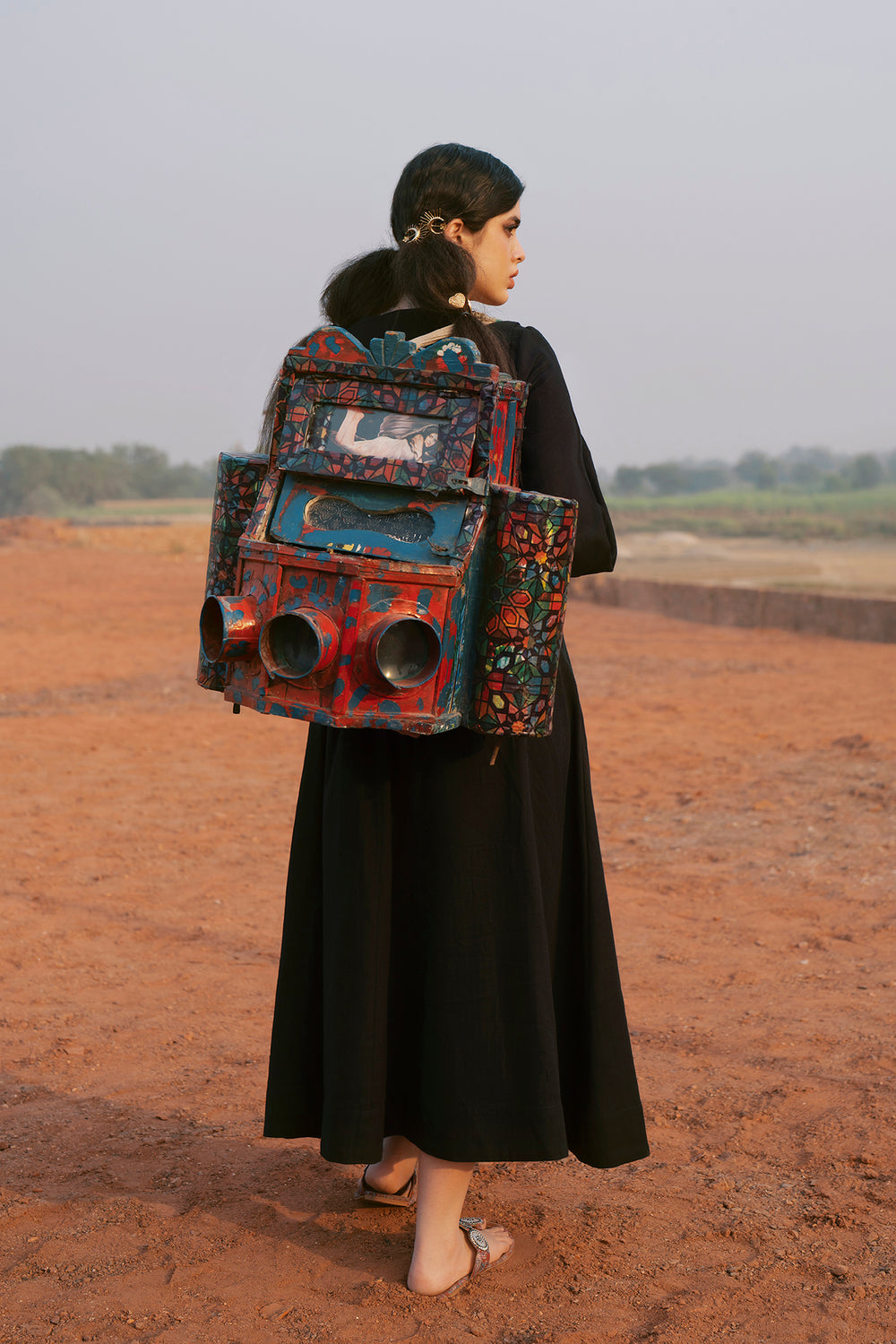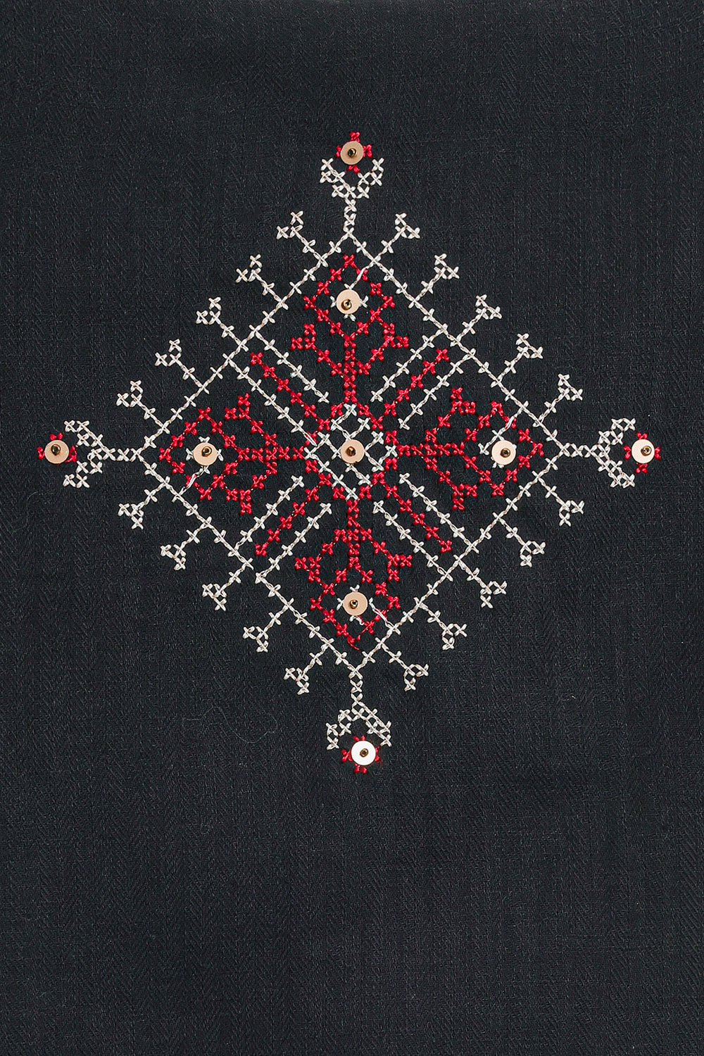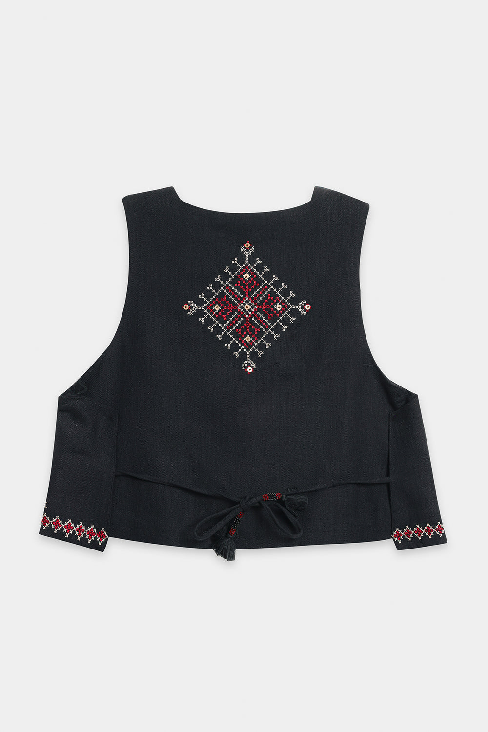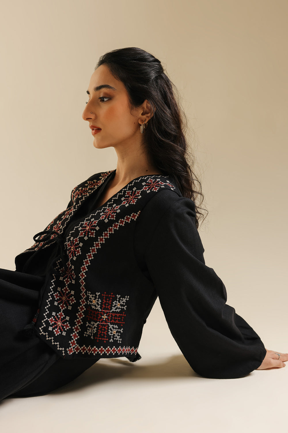 Embrace dramatic elegance with this stunning black embroidered dress and waistcoat set. This sophisticated two-piece ensemble features a flowing black maxi dress crafted from a rich, textured fabric. The dress itself offers a relaxed, graceful silhouette with voluminous balloon-style sleeves that cinch neatly at the wrist. The look is elevated by the integrated waistcoat detailing attached over the bodice, which is intricately adorned with rich red, white, and black geometric embroidery. This piece seamlessly combines traditional artistry with a contemporary, high-fashion aesthetic, making it perfect for a memorable occasion.