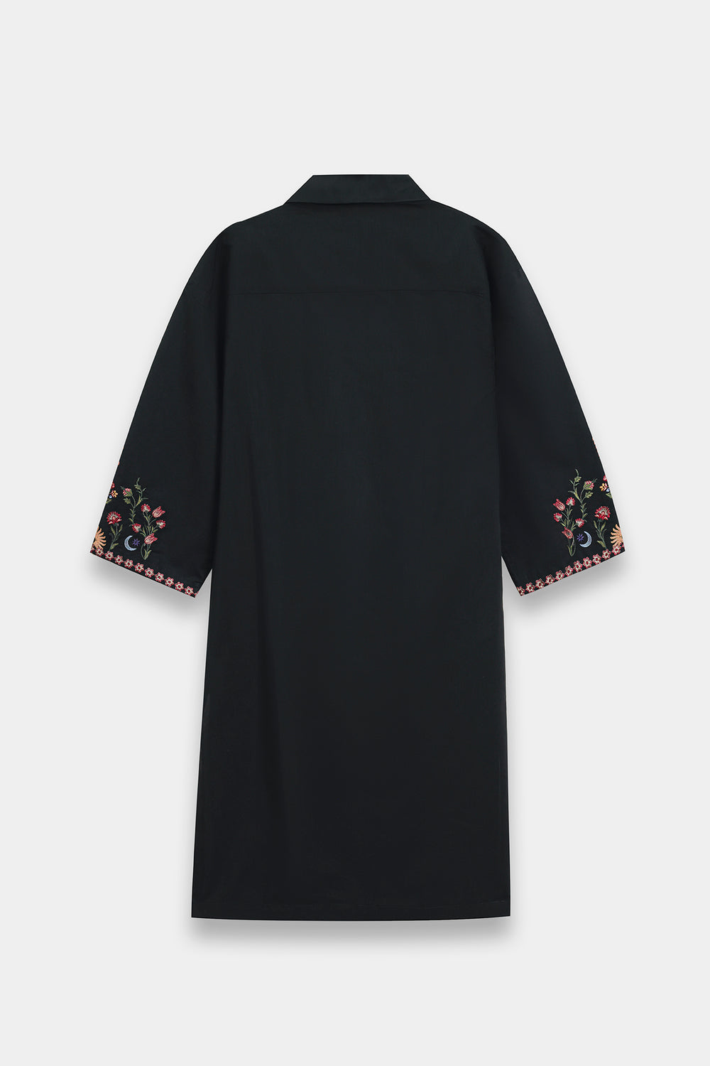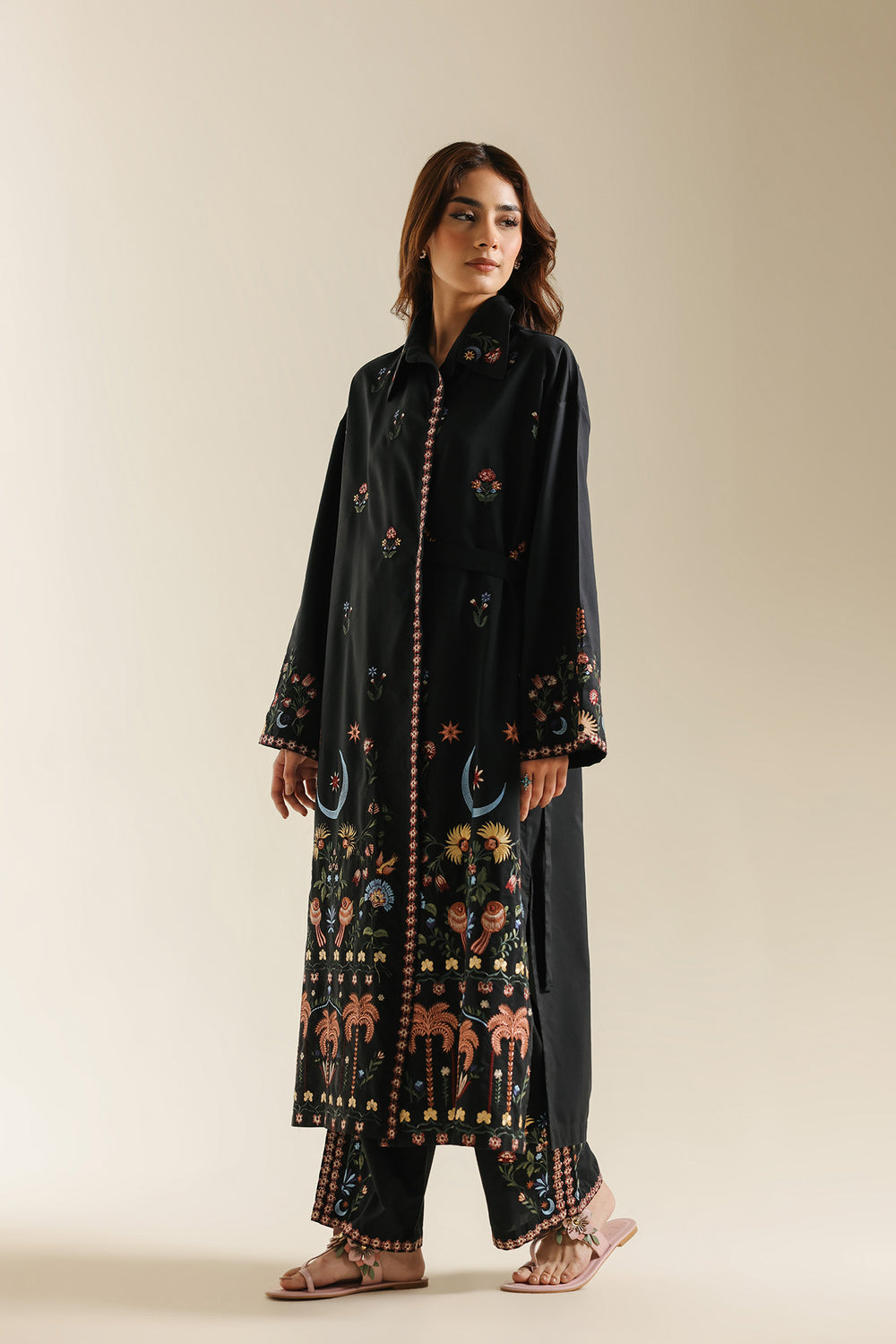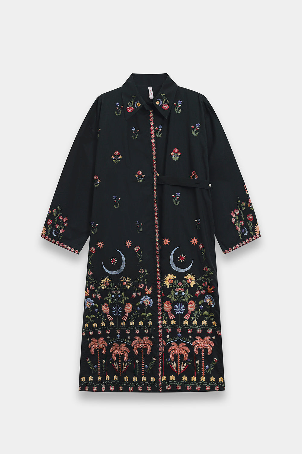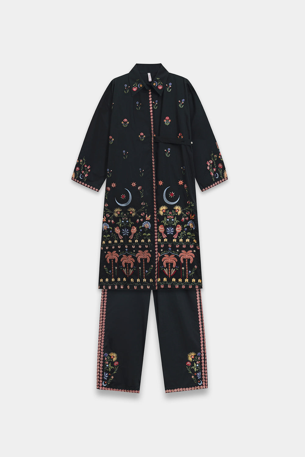 Make a mystical and enchanting statement in this floor-length black ensemble, designed with a sophisticated collared button-down silhouette. The piece features a rich, celestial-inspired tapestry of embroidery, including crescent moons, radiant suns, and twinkling stars scattered across the fabric. Detailed nature motifs such as palm trees, perched birds, and vibrant floral vines in shades of terracotta, cornflower blue, and mustard yellow bloom along the hemline and sleeves. Finished with an intricate patterned border running down the center and along the cuffs, this ensemble offers a perfect blend of whimsical storytelling and high-fashion elegance. Paired with matching trouser to complete the look.