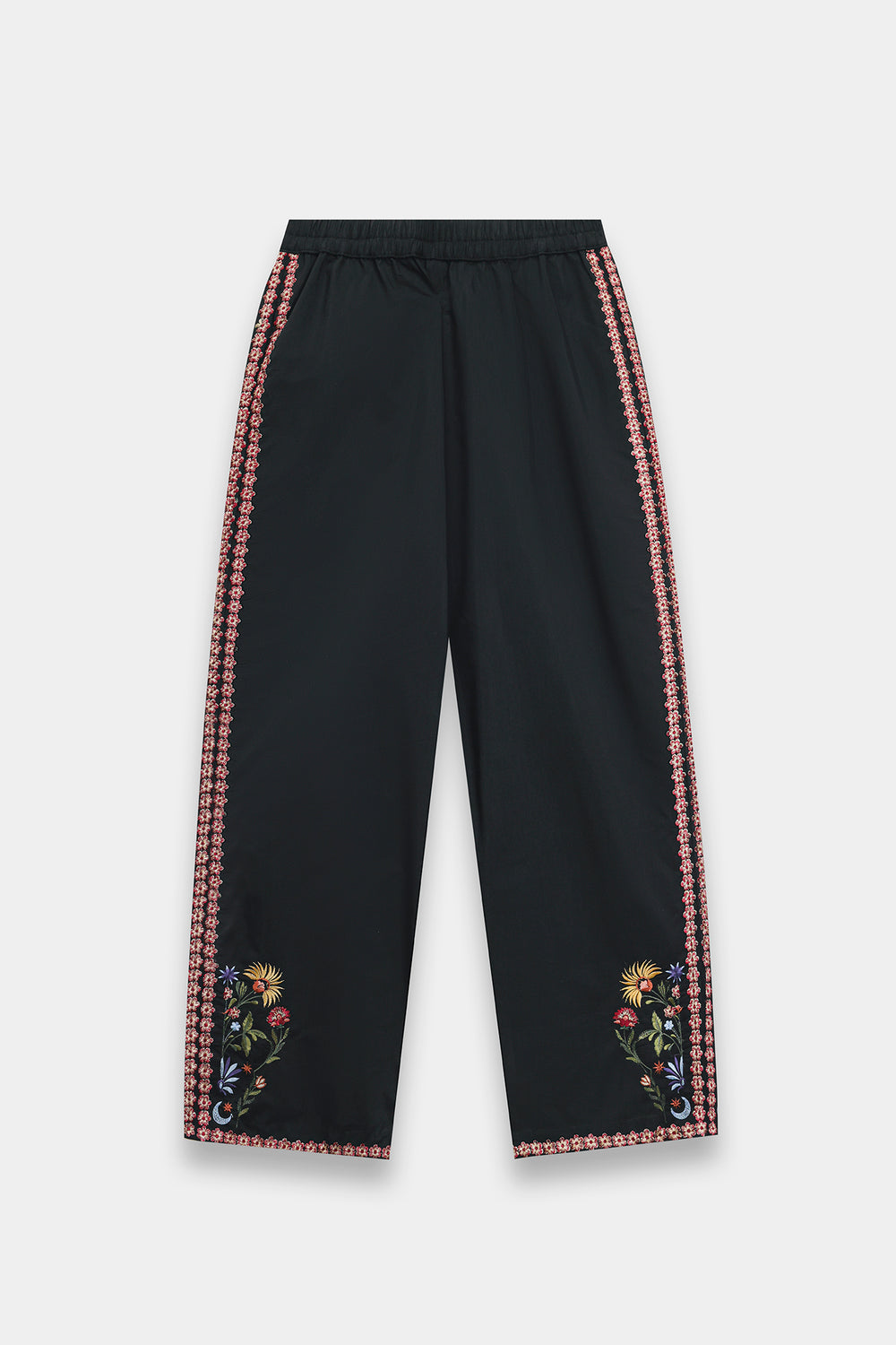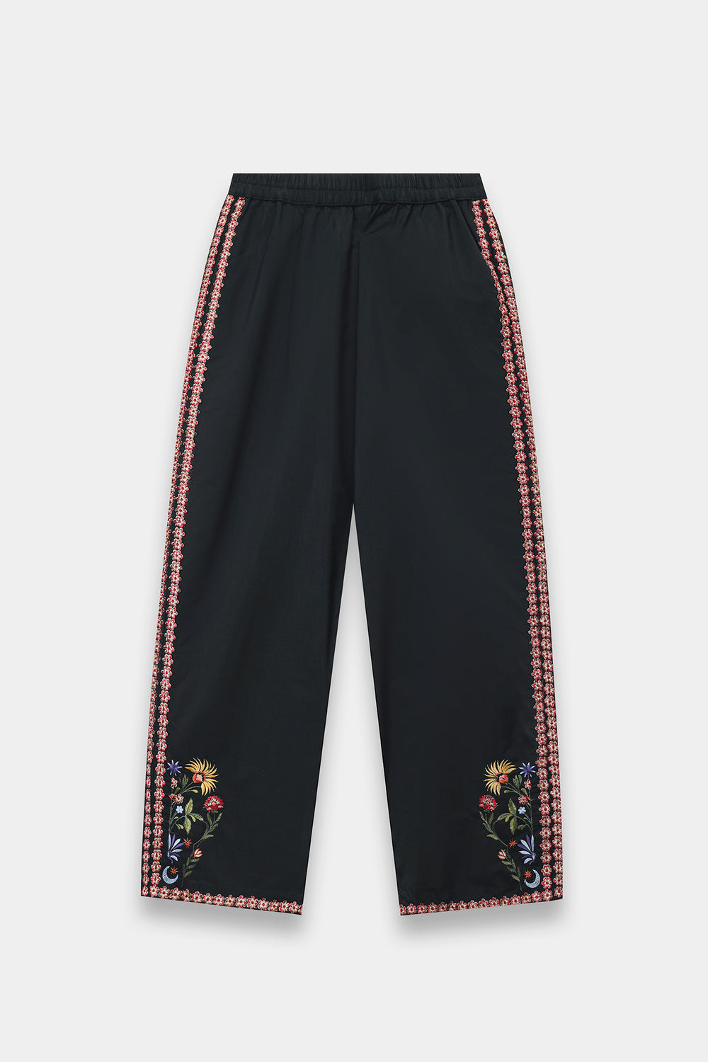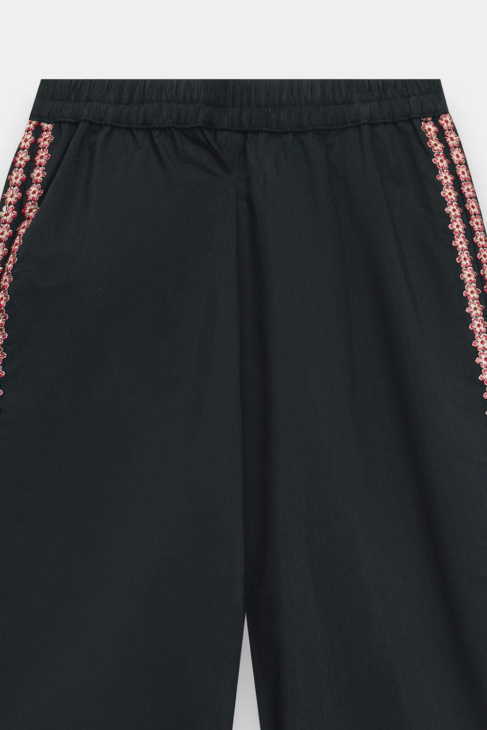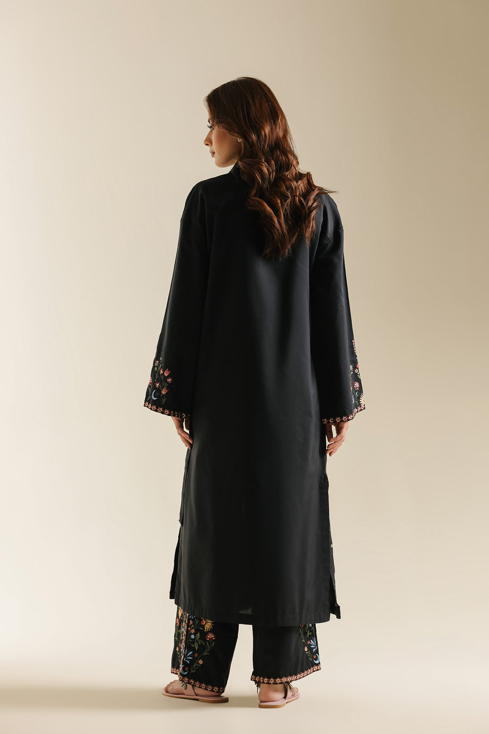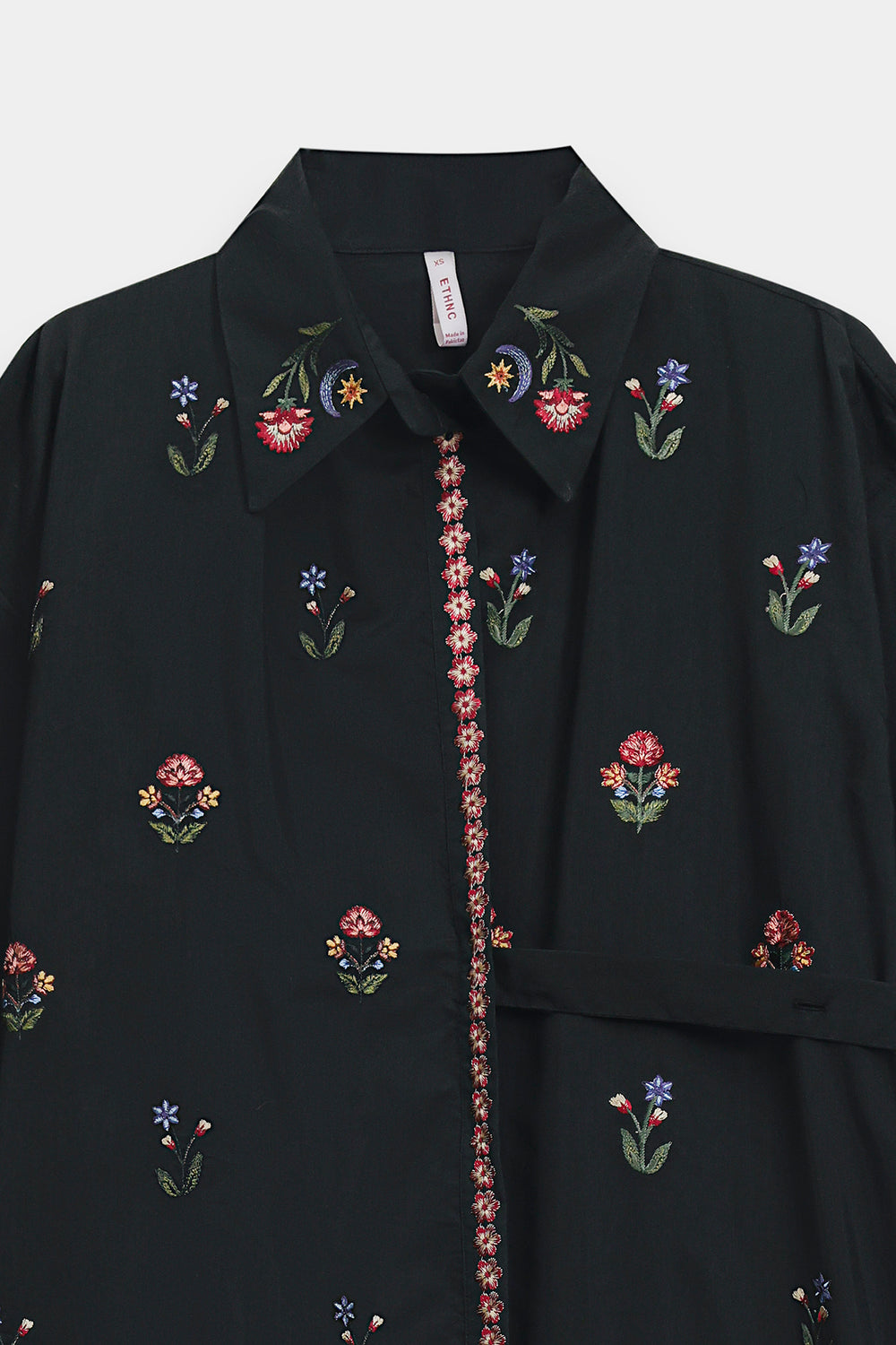 Make a mystical and enchanting statement in this floor-length black ensemble, designed with a sophisticated collared button-down silhouette. The piece features a rich, celestial-inspired tapestry of embroidery, including crescent moons, radiant suns, and twinkling stars scattered across the fabric. Detailed nature motifs such as palm trees, perched birds, and vibrant floral vines in shades of terracotta, cornflower blue, and mustard yellow bloom along the hemline and sleeves. Finished with an intricate patterned border running down the center and along the cuffs, this ensemble offers a perfect blend of whimsical storytelling and high-fashion elegance. Paired with matching trouser to complete the look.