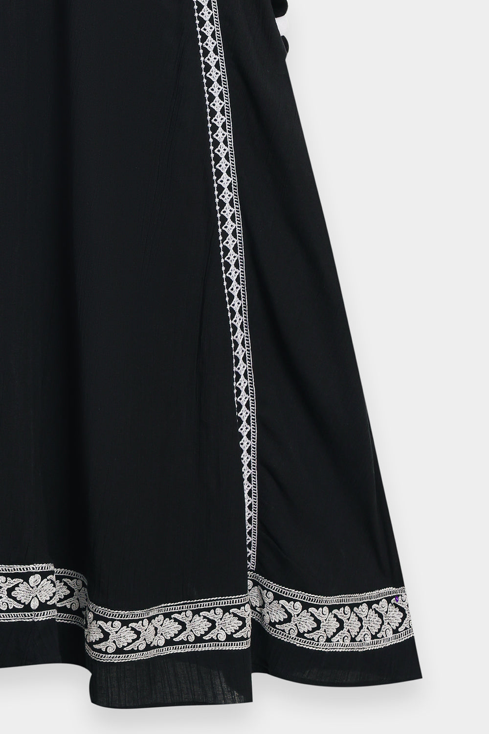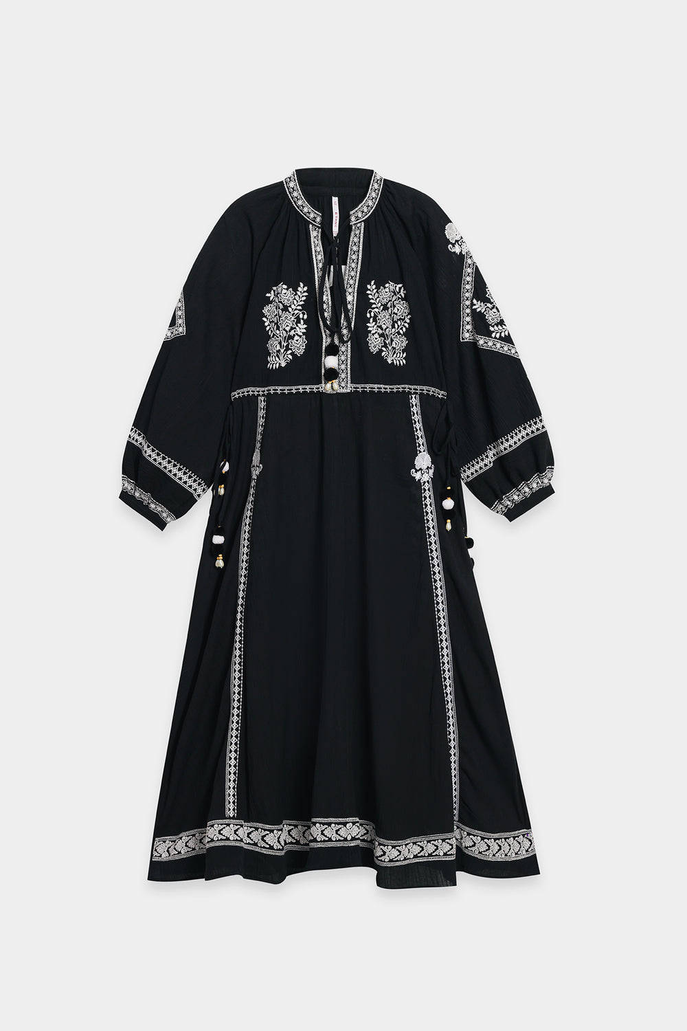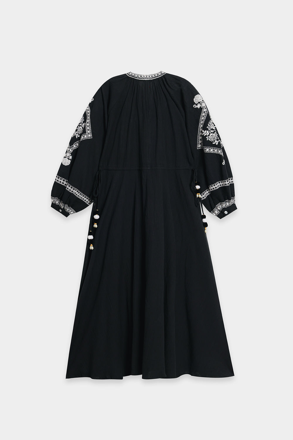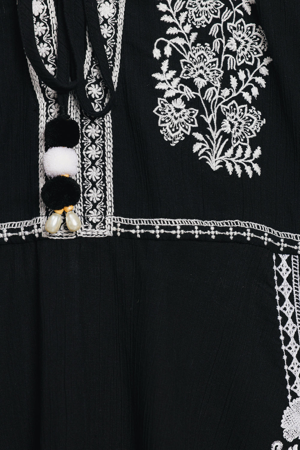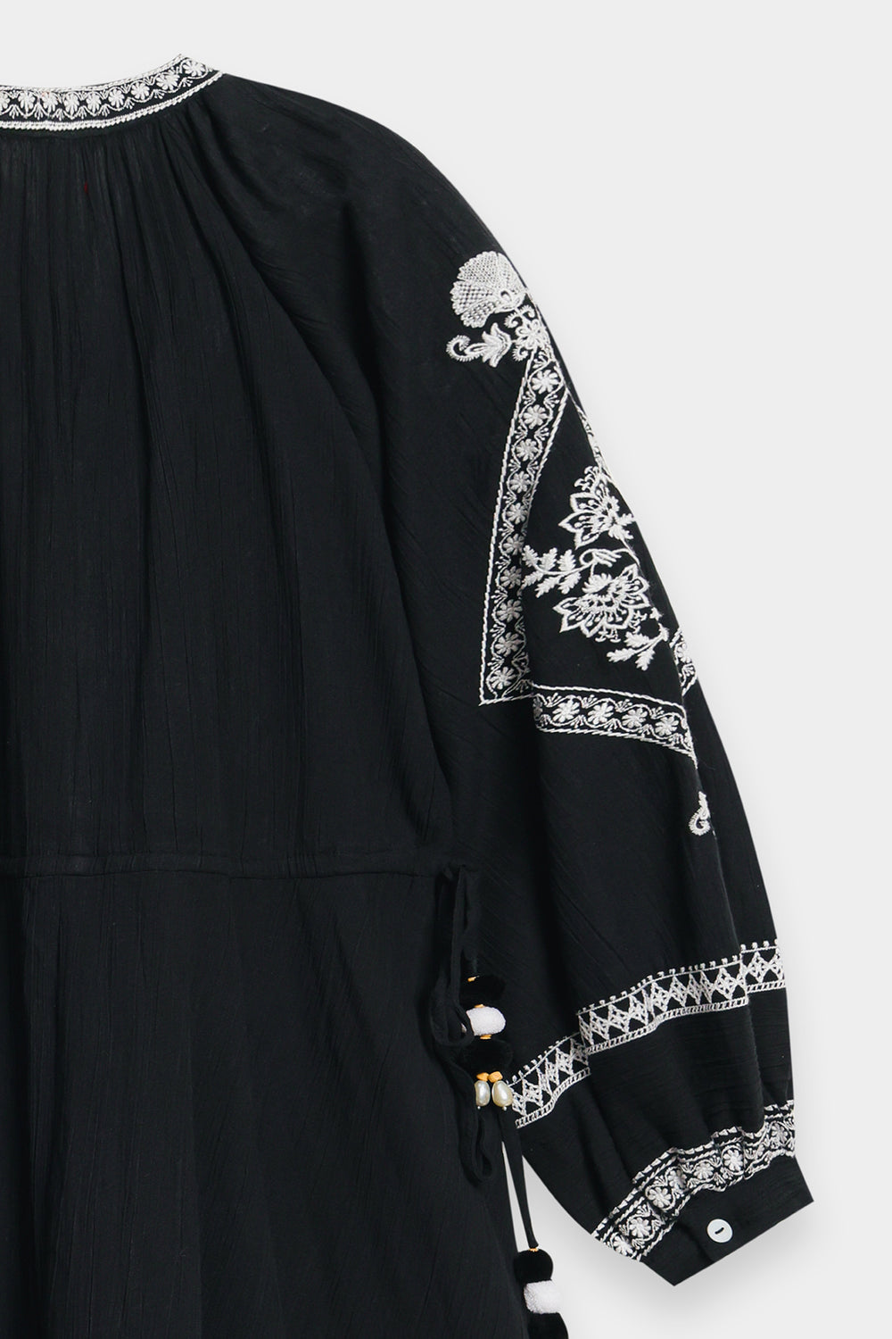 Float in dramatic bohemian elegance with this gorgeous black embroidered dress. This maxi-length dress is crafted from a comfortable black fabric with a flowing, voluminous silhouette and long, puffed sleeves. The fabric is beautifully textured, and the dress is lavishly adorned with heavy white thread embroidery in ornate floral and geometric patterns across the yoke, sleeves, and hemline. Tassels at the neckline and along the skirt add a playful, handcrafted touch. This stunning piece is perfect for making a bold yet effortless statement at any semi-formal or festive gathering.