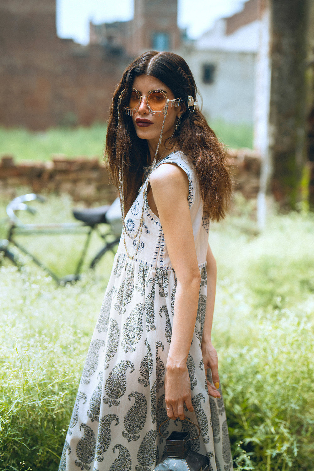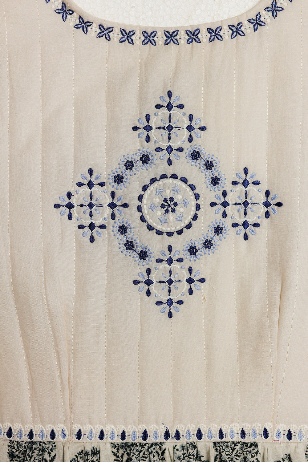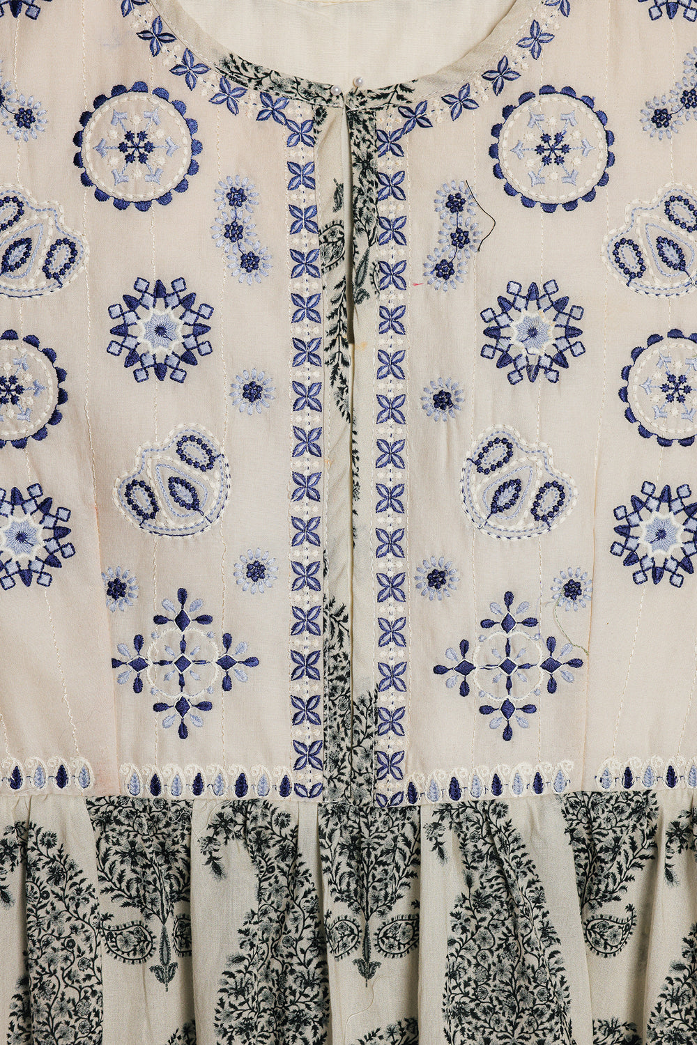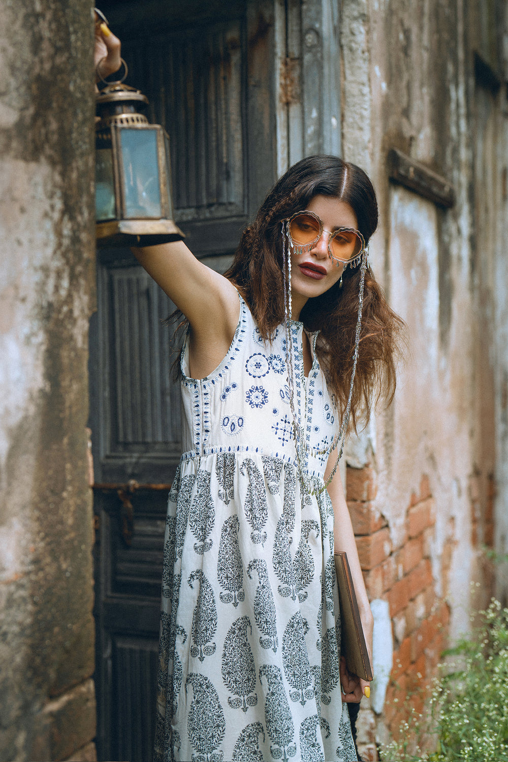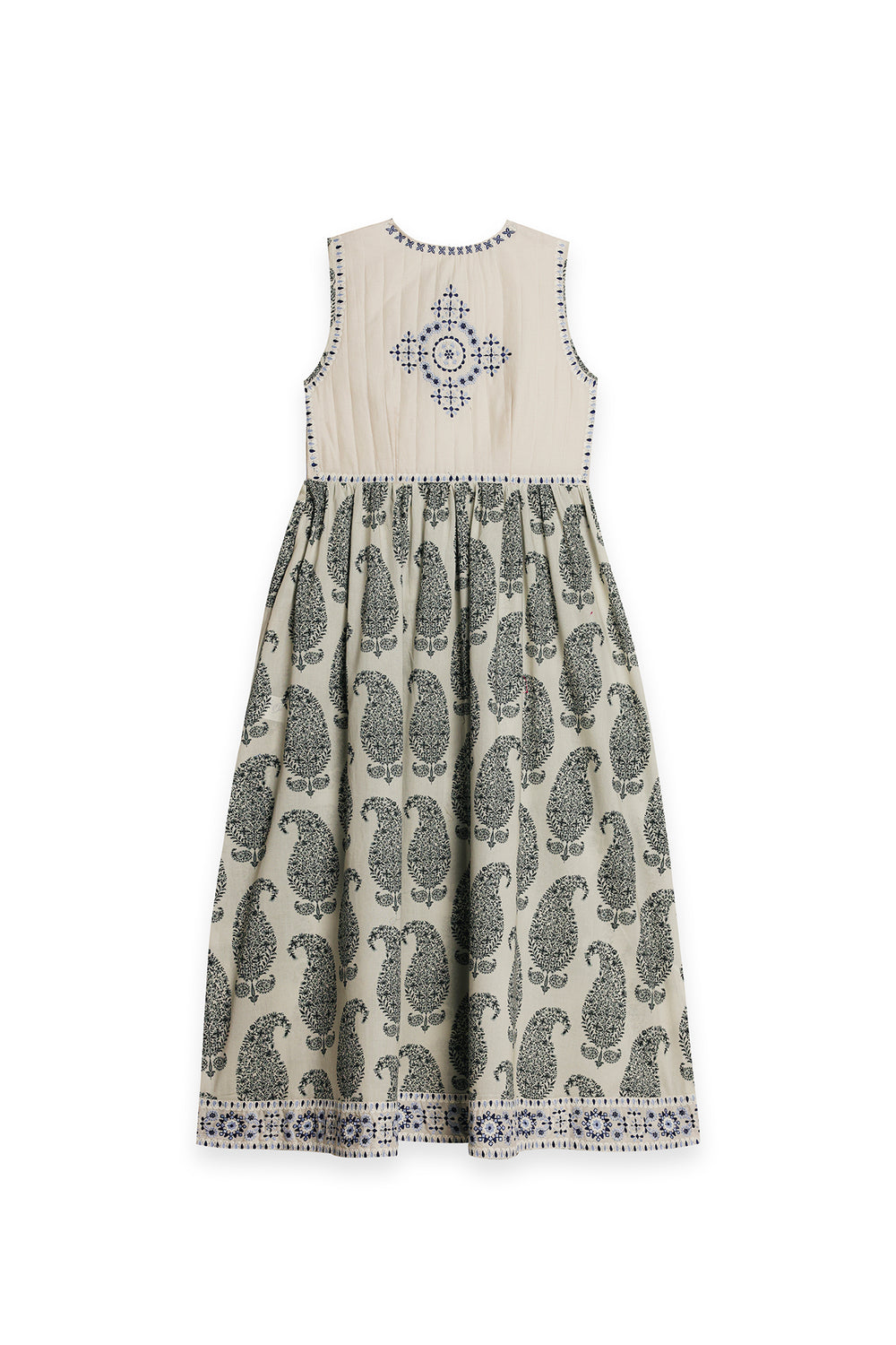 Wrap yourself in bohemian beauty with this elegant white and blue sleeveless dress. The dress features a flattering A-line silhouette with a beautiful bodice adorned with a geometric and floral pattern in shades of blue. The flowing skirt is detailed with a large paisley print, giving it a unique, artistic feel. Perfect for a day out or a special occasion where you want to look effortlessly chic.