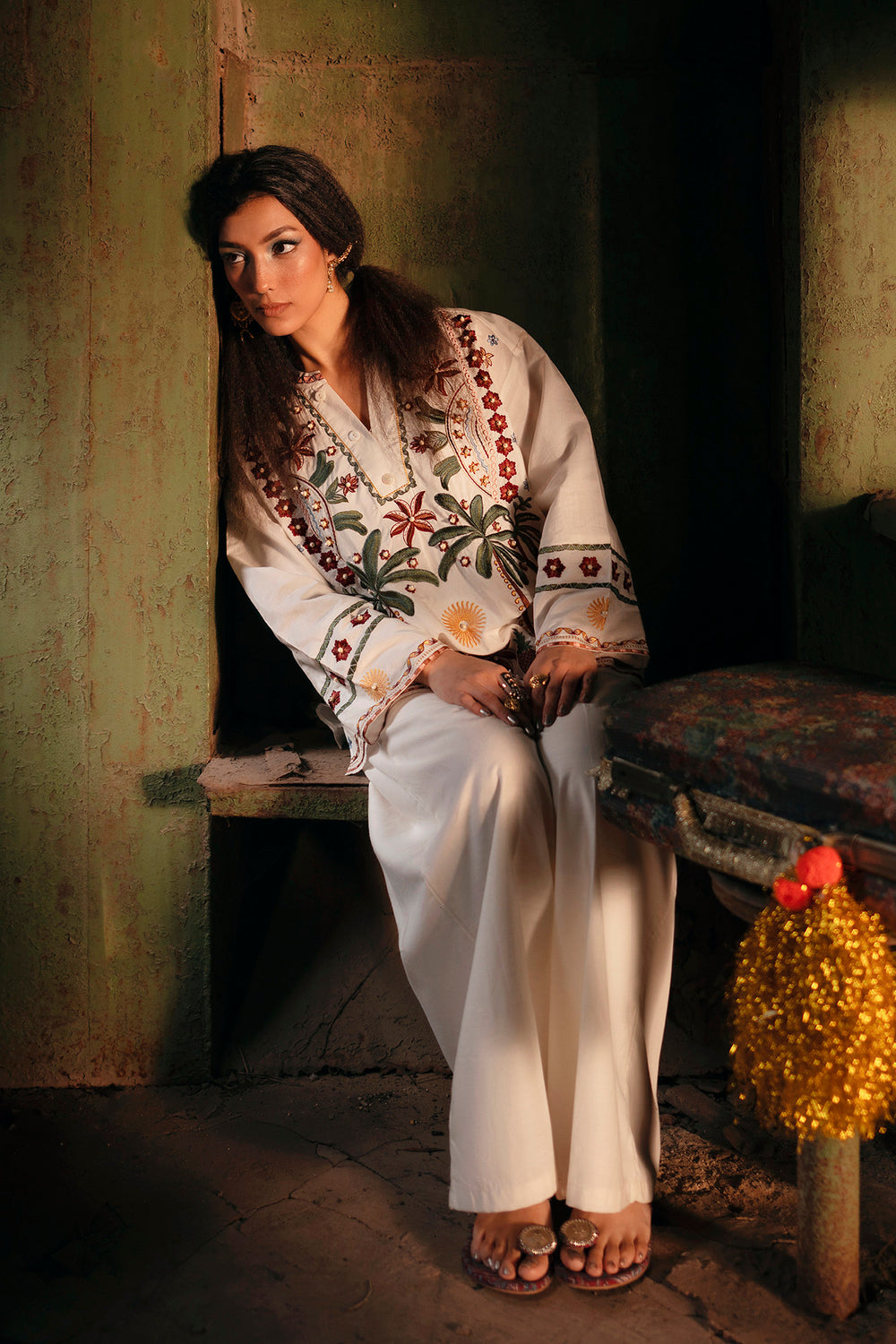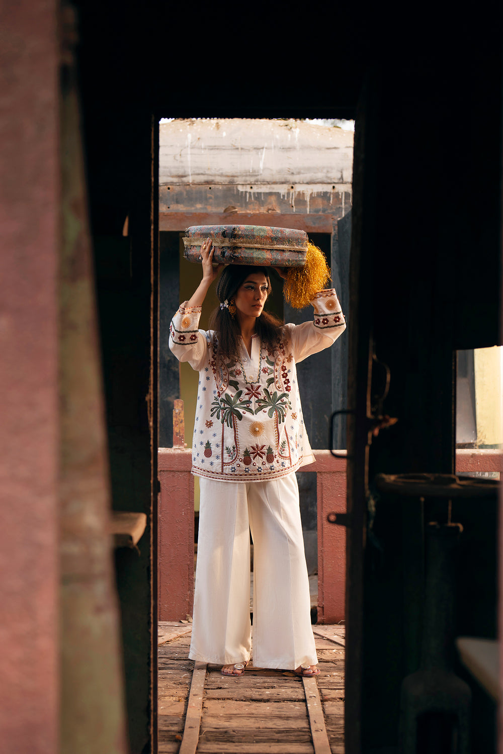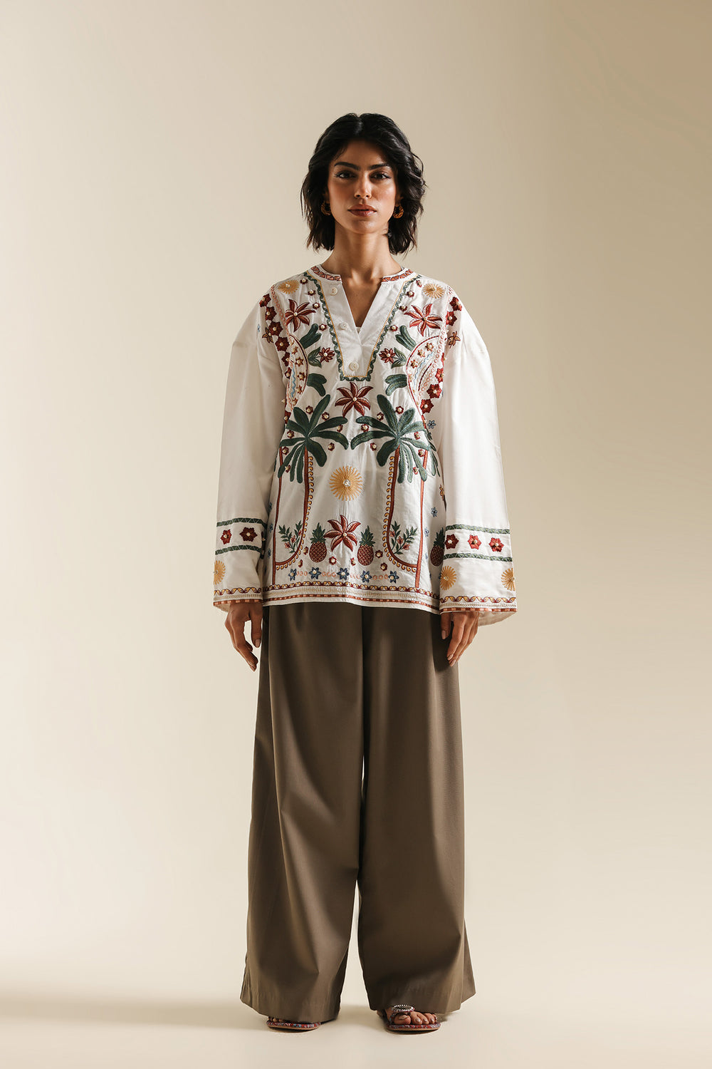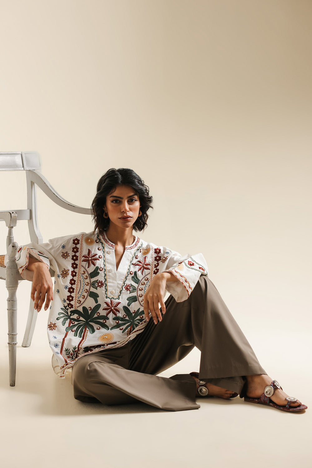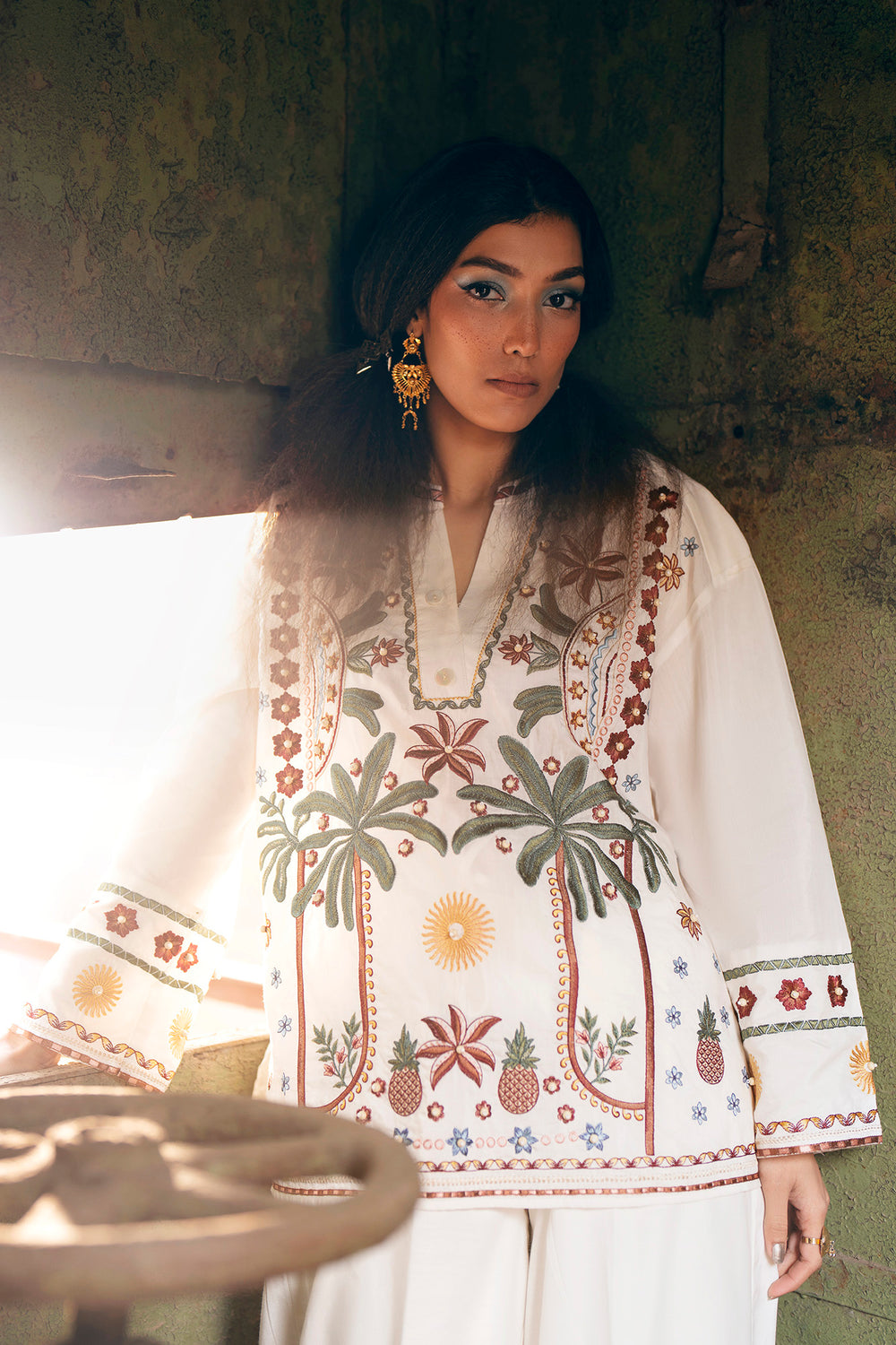 Exude tropical charm in this crisp white embroidered shirt, designed with a relaxed, oversized silhouette. The piece features a sophisticated split neckline with button detailing and is lavishly adorned with vibrant embroidery showcasing palm trees, pineapples, and sun motifs. Rich tones of terracotta, forest green, and mustard create a playful yet refined aesthetic, further elevated by delicate pearl-like embellishments scattered throughout the design. With its intricate borders on the cuffs and hem, this shirt is a perfect blend of artisanal craftsmanship and contemporary summer style.