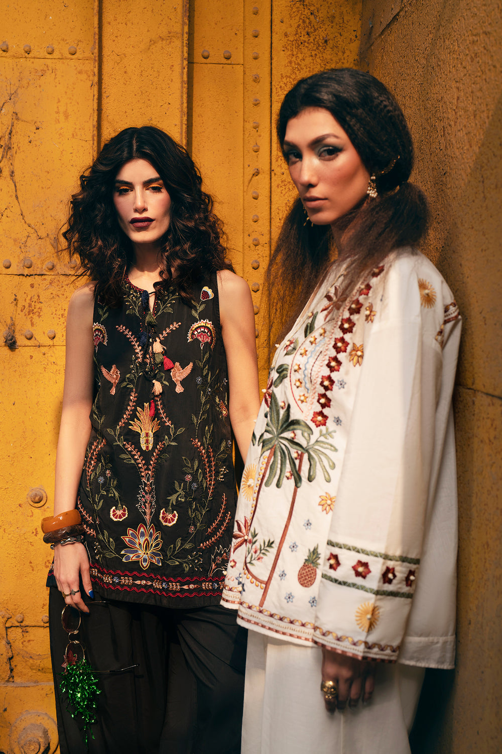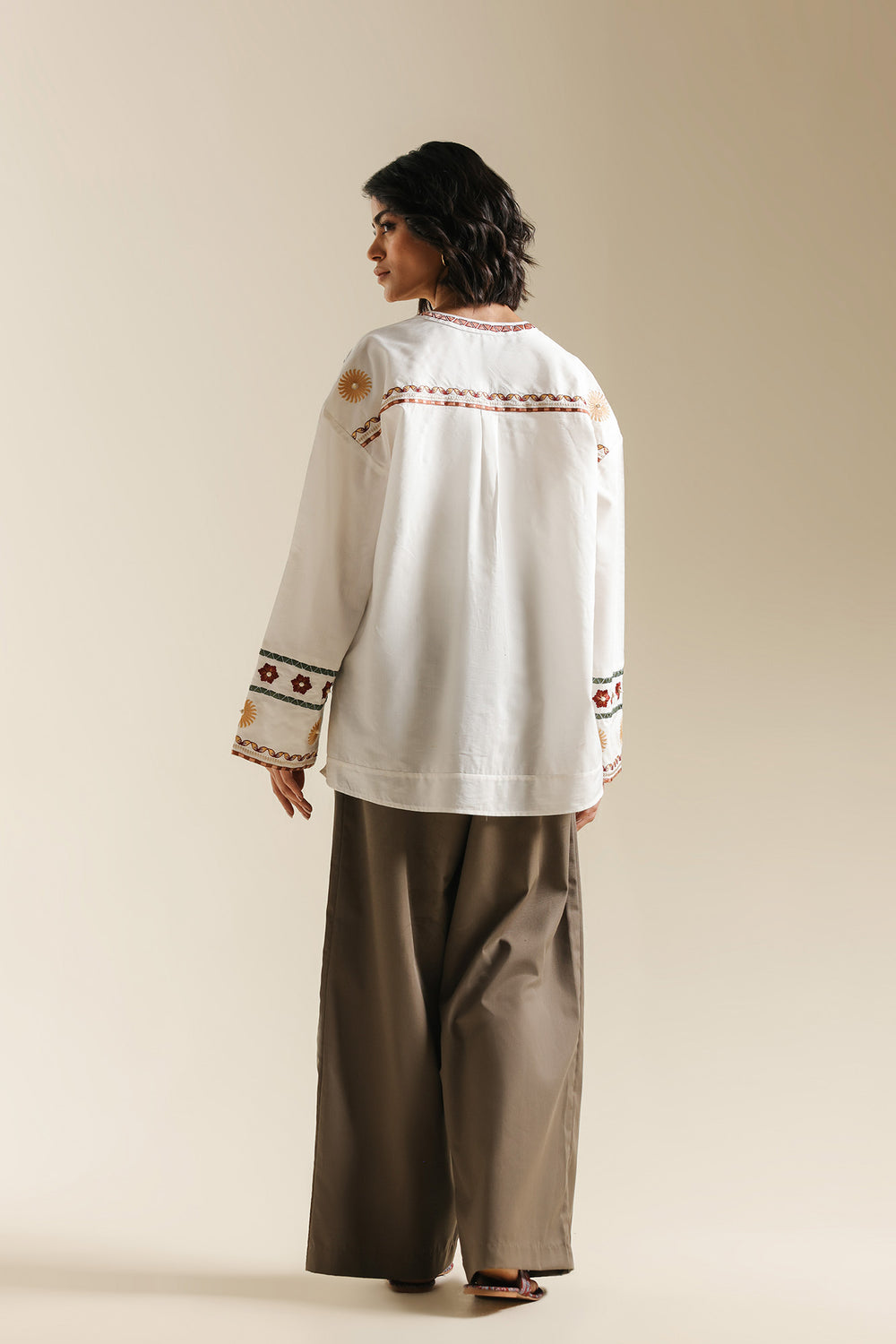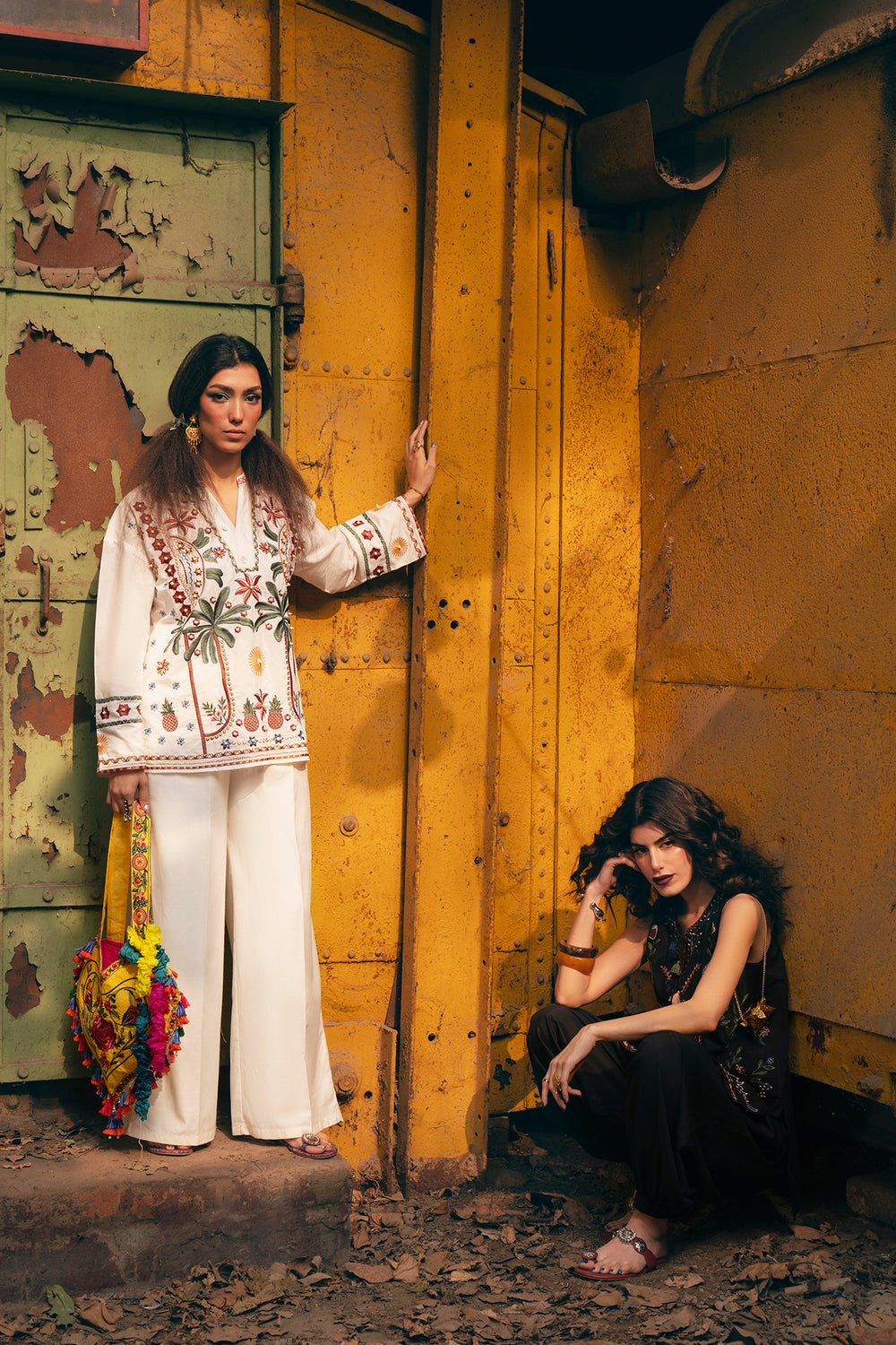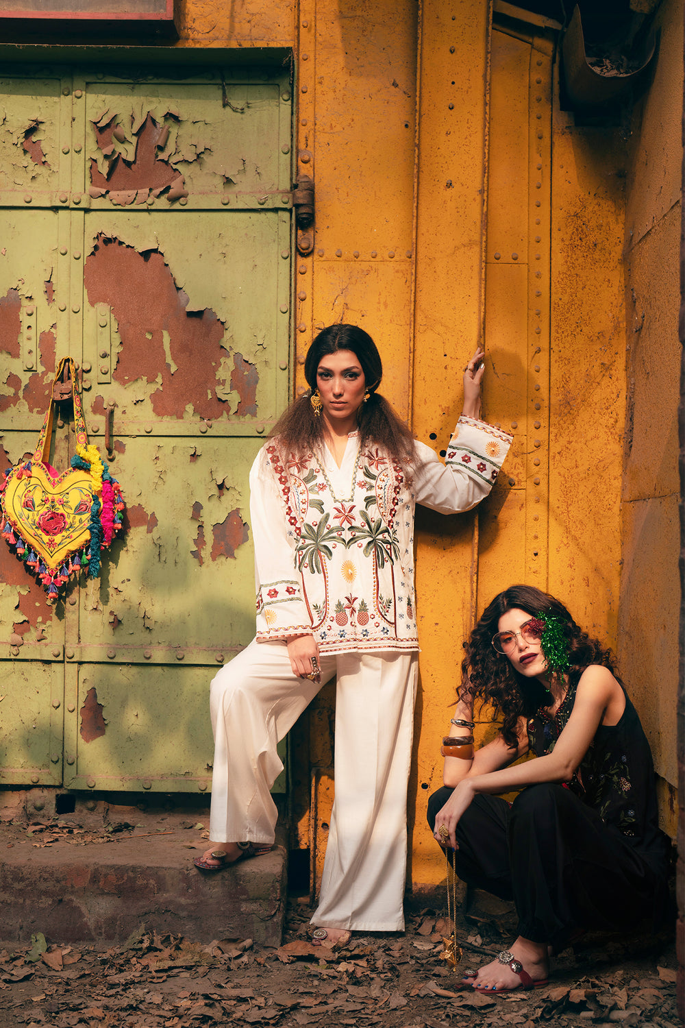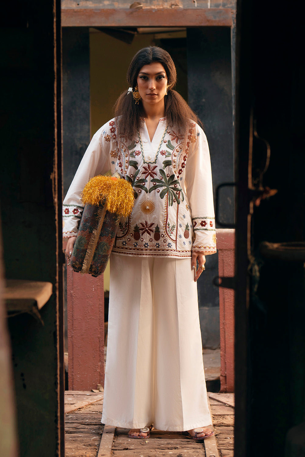 Exude tropical charm in this crisp white embroidered shirt, designed with a relaxed, oversized silhouette. The piece features a sophisticated split neckline with button detailing and is lavishly adorned with vibrant embroidery showcasing palm trees, pineapples, and sun motifs. Rich tones of terracotta, forest green, and mustard create a playful yet refined aesthetic, further elevated by delicate pearl-like embellishments scattered throughout the design. With its intricate borders on the cuffs and hem, this shirt is a perfect blend of artisanal craftsmanship and contemporary summer style.