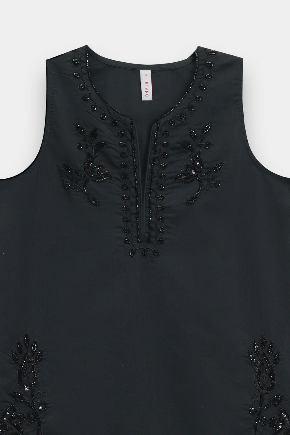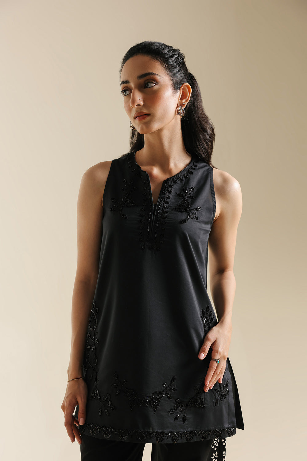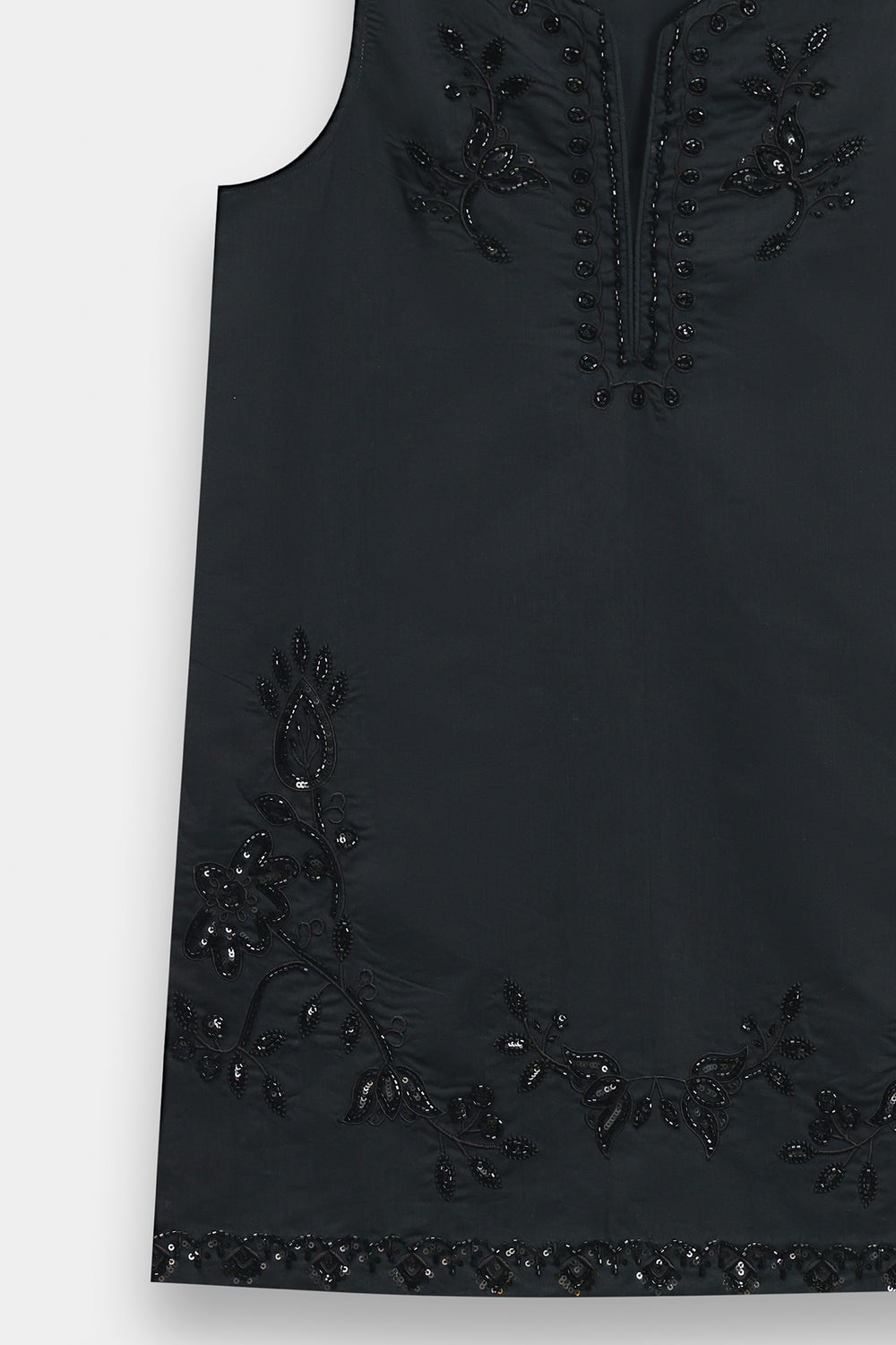 Exude a sophisticated, dark-toned charm with this sleeveless black kurti, designed with a clean-cut straight silhouette. The kurti features a sharp split V-neckline, framed by tonal black-on-black beaded embroidery in a traditional scrolling vine pattern. This intricate hand-worked detailing continues across the lower hemline with elaborate floral medallions and botanical sprays, adding a subtle texture and shimmering finish to the solid black fabric.