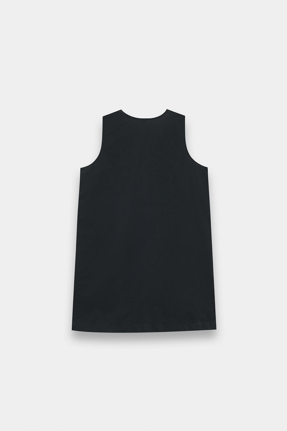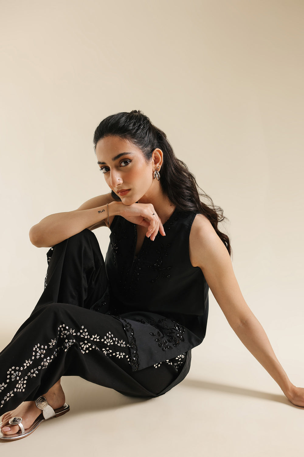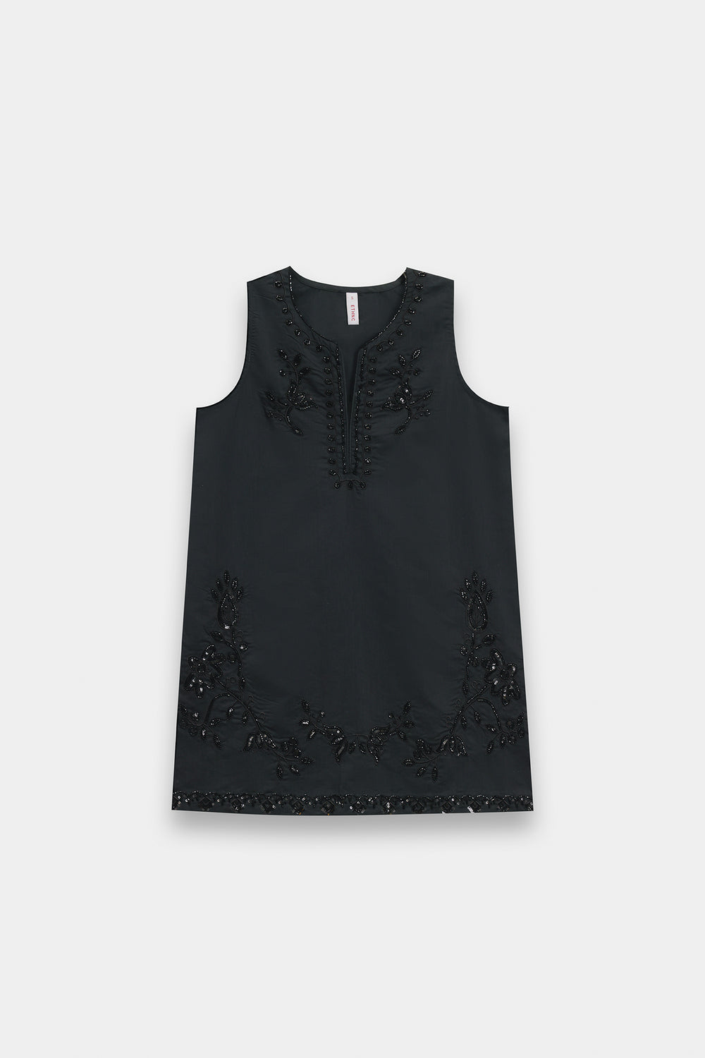Exude a sophisticated, dark-toned charm with this sleeveless black kurti, designed with a clean-cut straight silhouette. The kurti features a sharp split V-neckline, framed by tonal black-on-black beaded embroidery in a traditional scrolling vine pattern. This intricate hand-worked detailing continues across the lower hemline with elaborate floral medallions and botanical sprays, adding a subtle texture and shimmering finish to the solid black fabric.