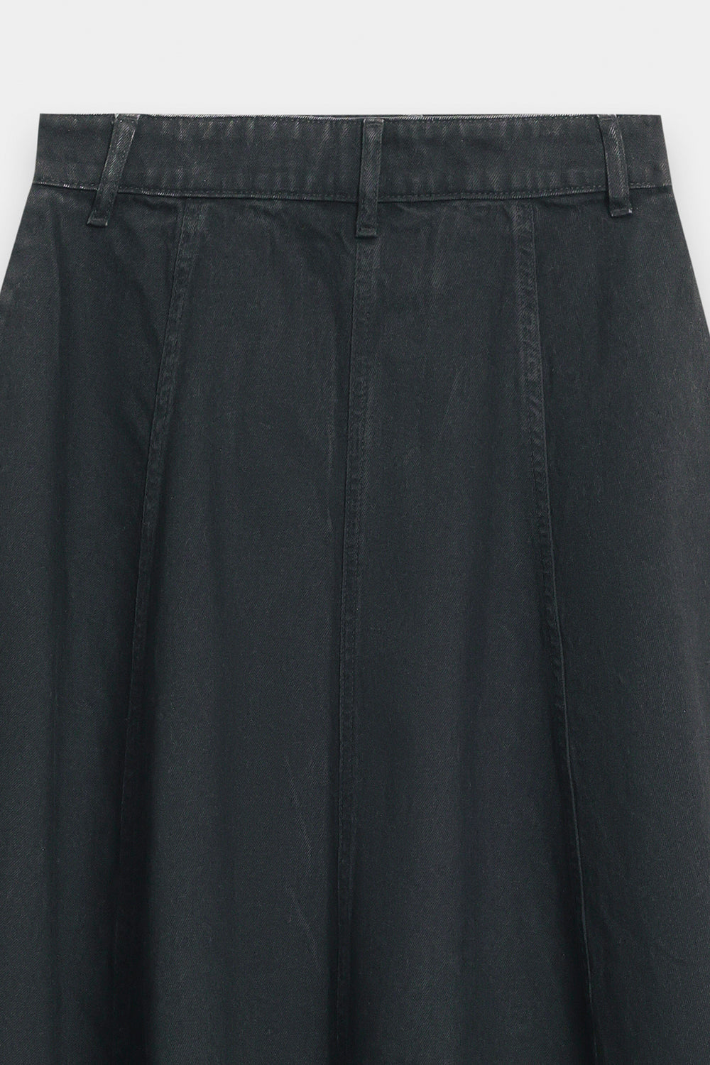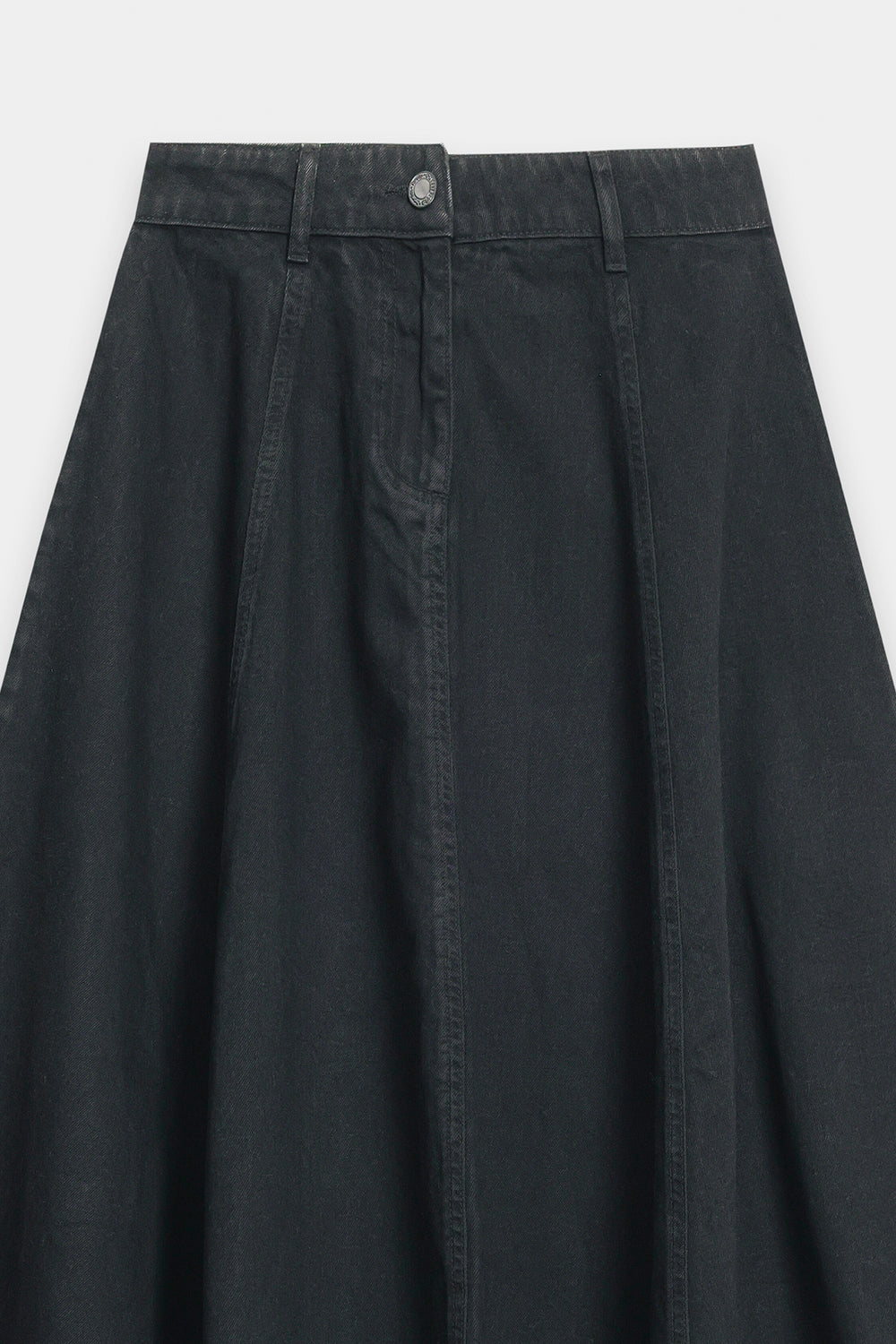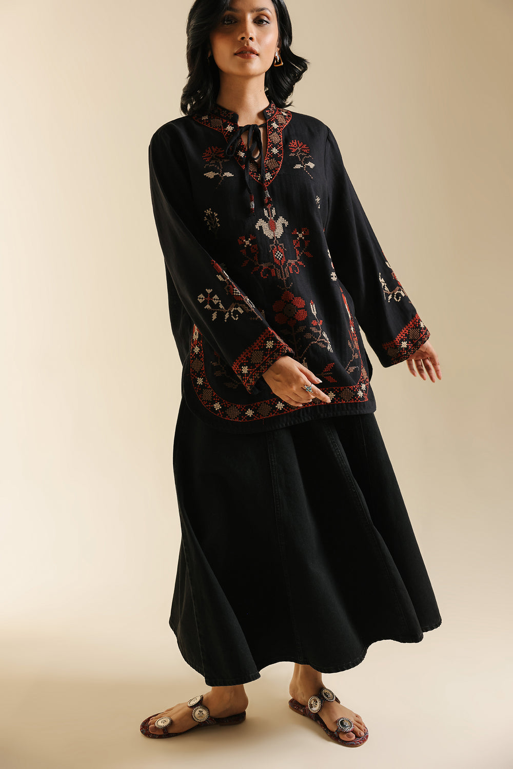 Define sophistication with this timeless black embroidered midi skirt. This elegant skirt is crafted from a rich, structured black jean fabric, offering a beautiful drape and shape. It features a flattering midi length and a comfortable wide-fit silhouette that allows for graceful movement.