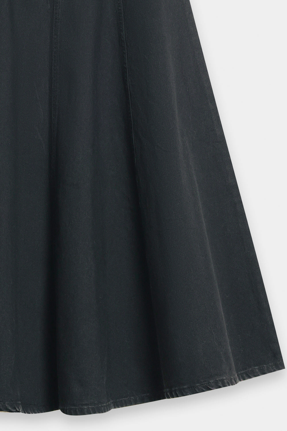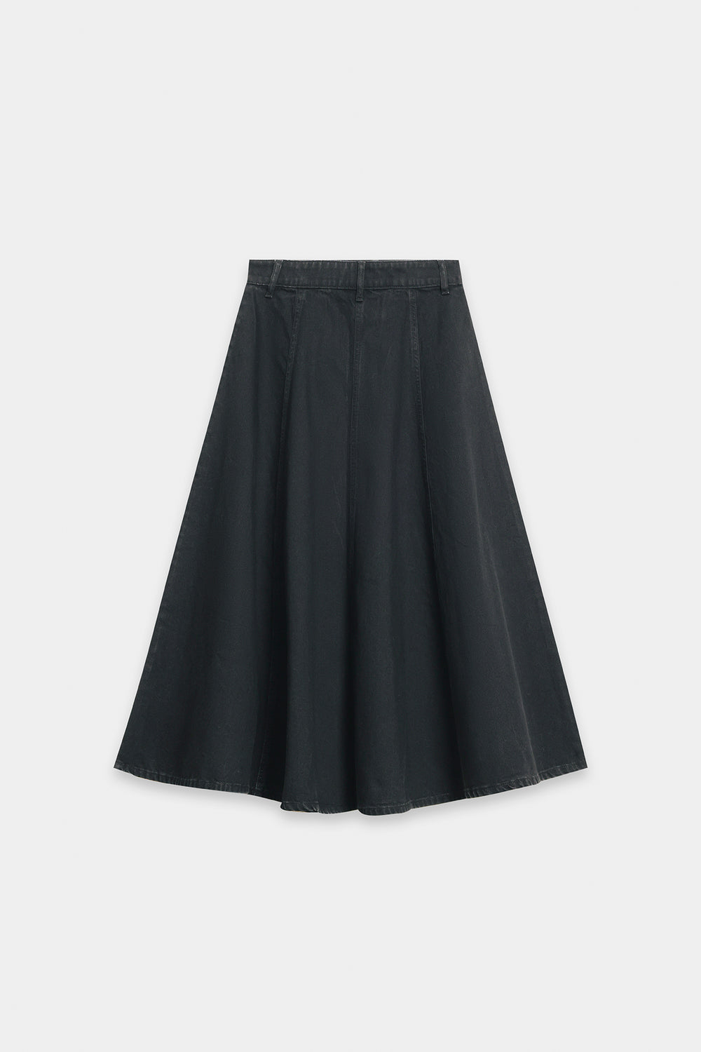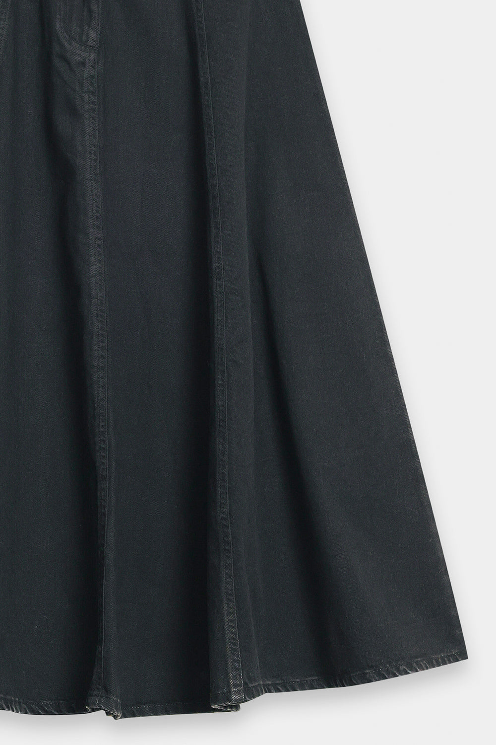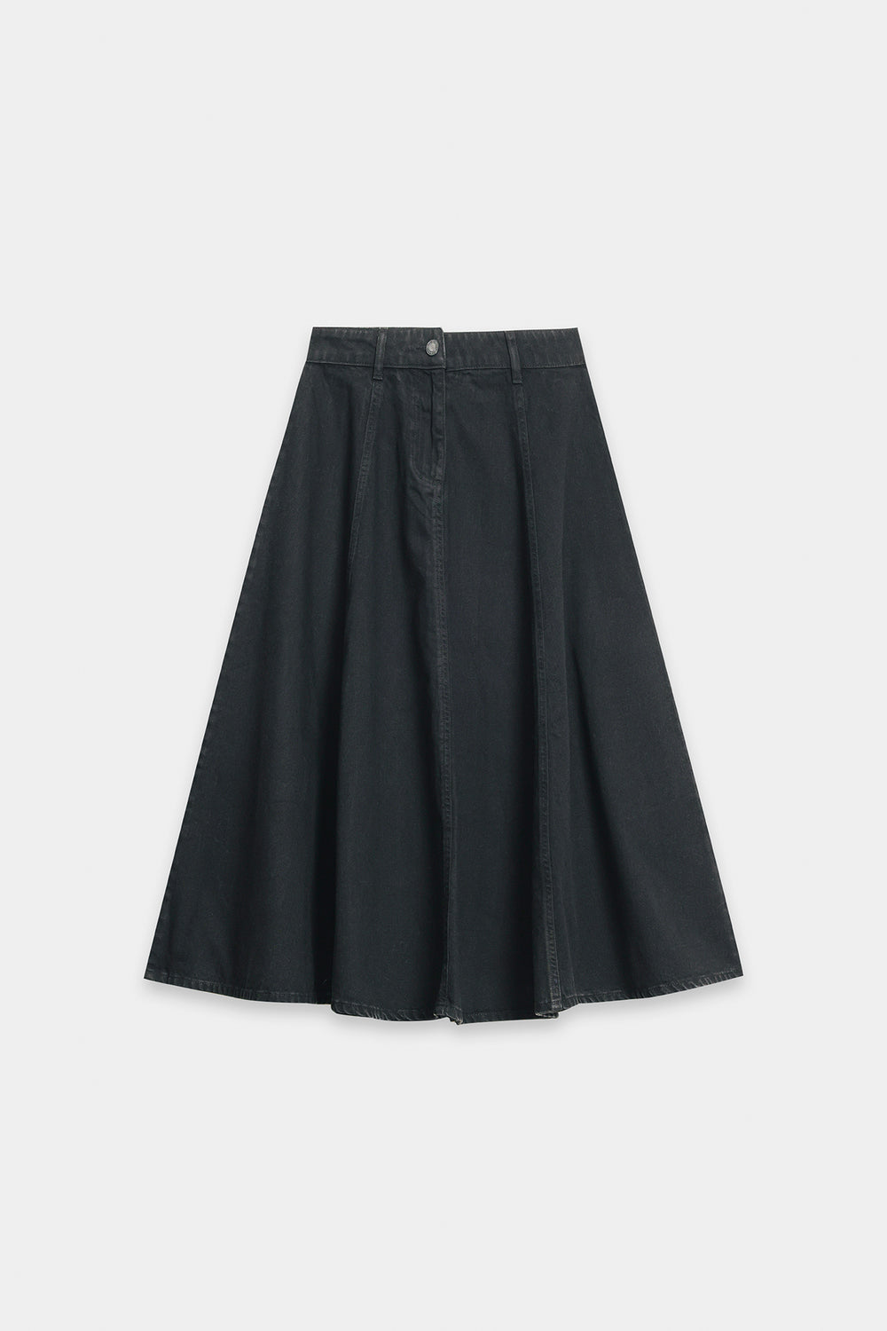 Define sophistication with this timeless black embroidered midi skirt. This elegant skirt is crafted from a rich, structured black jean fabric, offering a beautiful drape and shape. It features a flattering midi length and a comfortable wide-fit silhouette that allows for graceful movement.