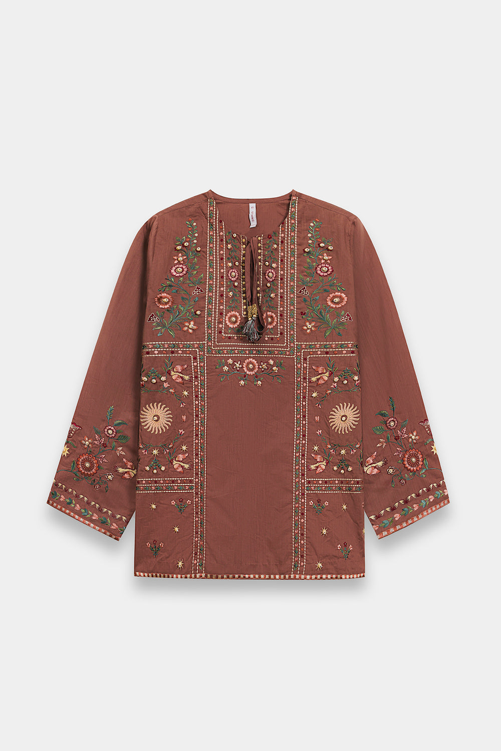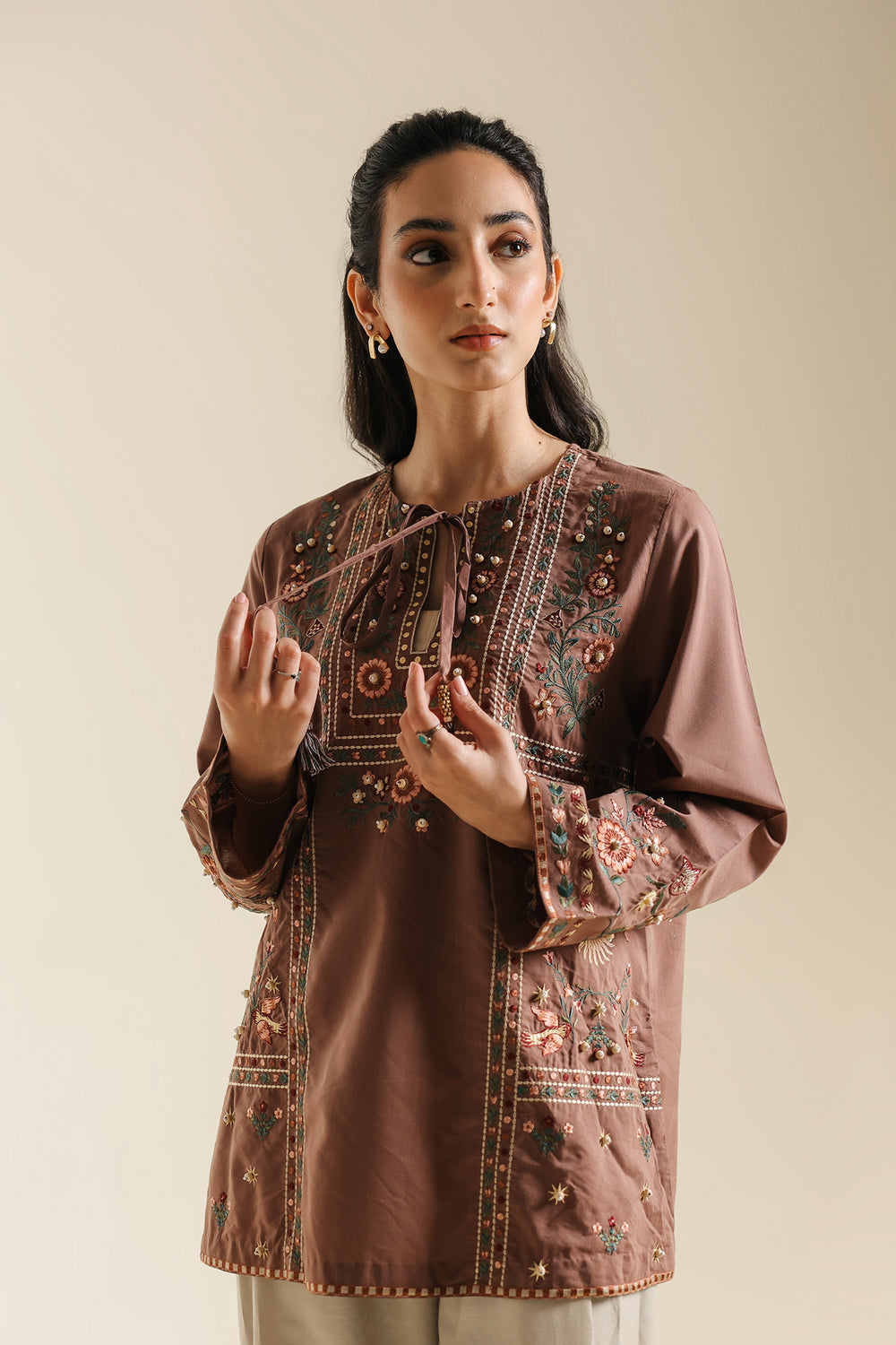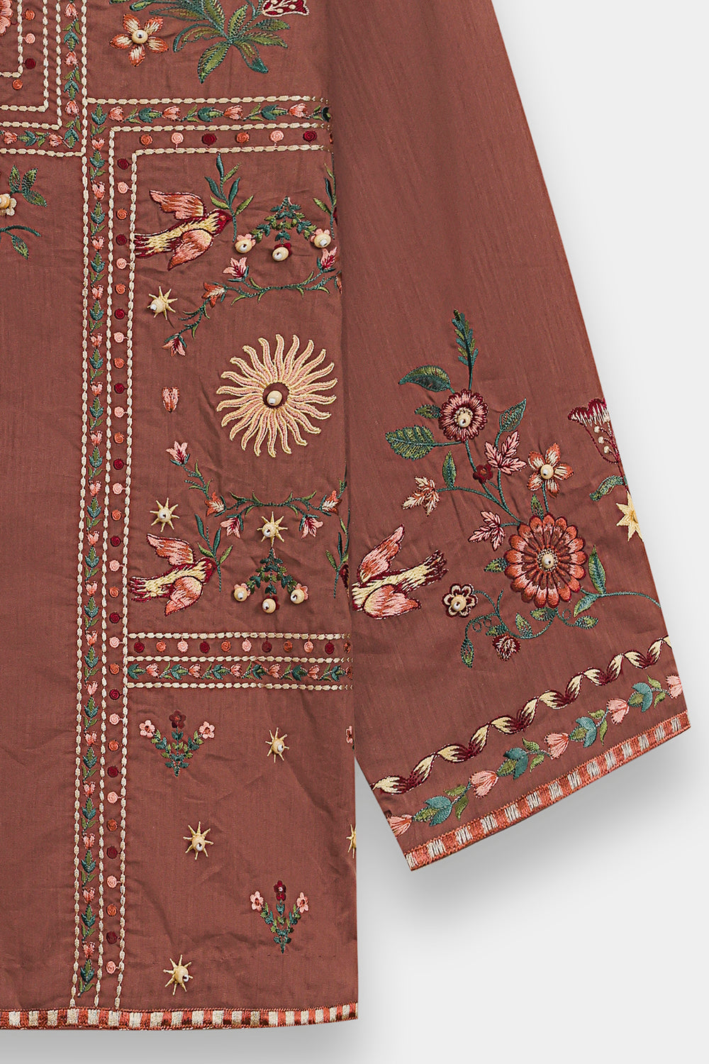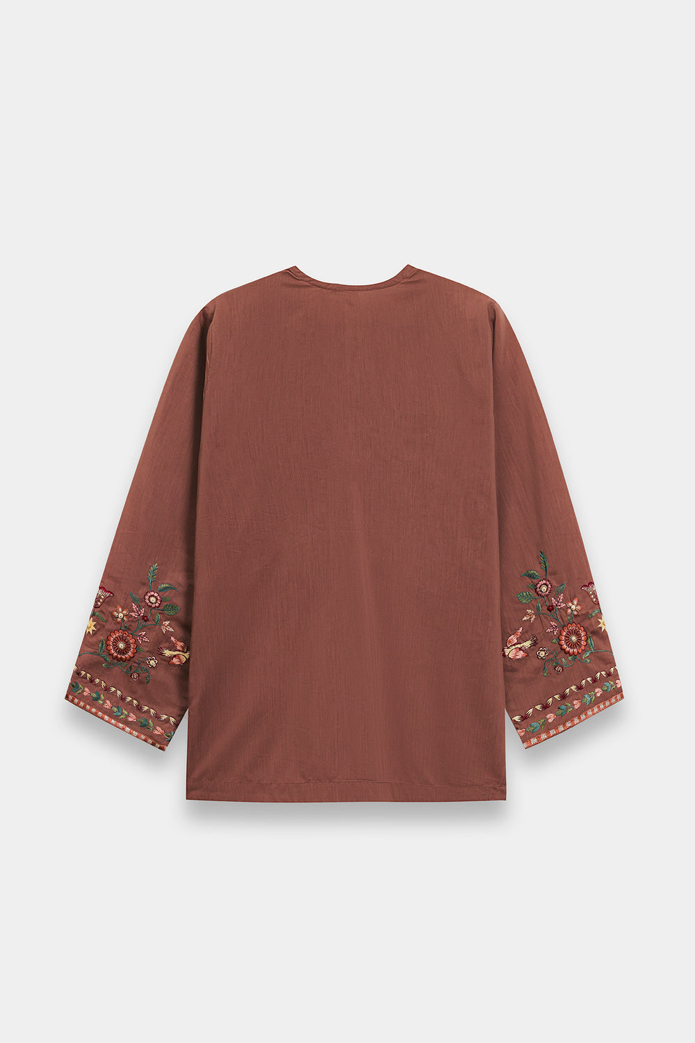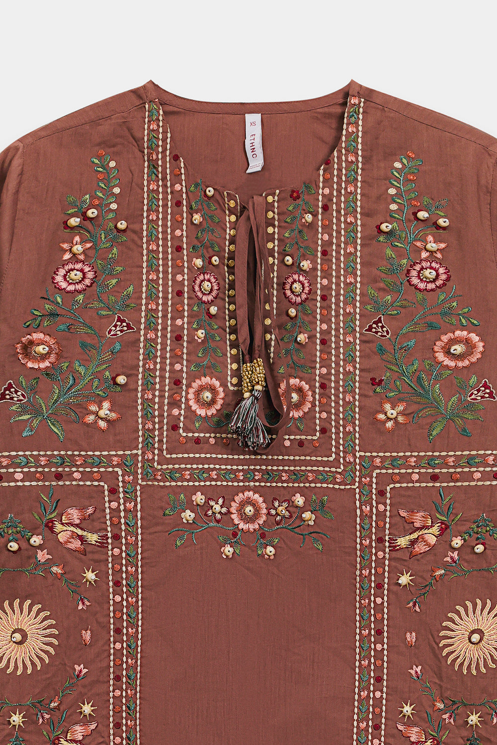 Embrace a refined and earthy aesthetic in this warm brown kurti, designed with a classic straight silhouette that offers both comfort and grace. The piece features a sophisticated split neckline accented by delicate tie-front tassels and is beautifully framed by intricate vertical embroidery. The kurti is adorned with a rich tapestry of nature-inspired motifs, including stylized floral sprays and celestial sunbursts in shades of forest green, terracotta, and soft ochre. Delicate beadwork and shimmering accents are artfully scattered across the bodice, while a series of geometric embroidered borders anchor the hem and sleeves. -Chocolate Brown Color