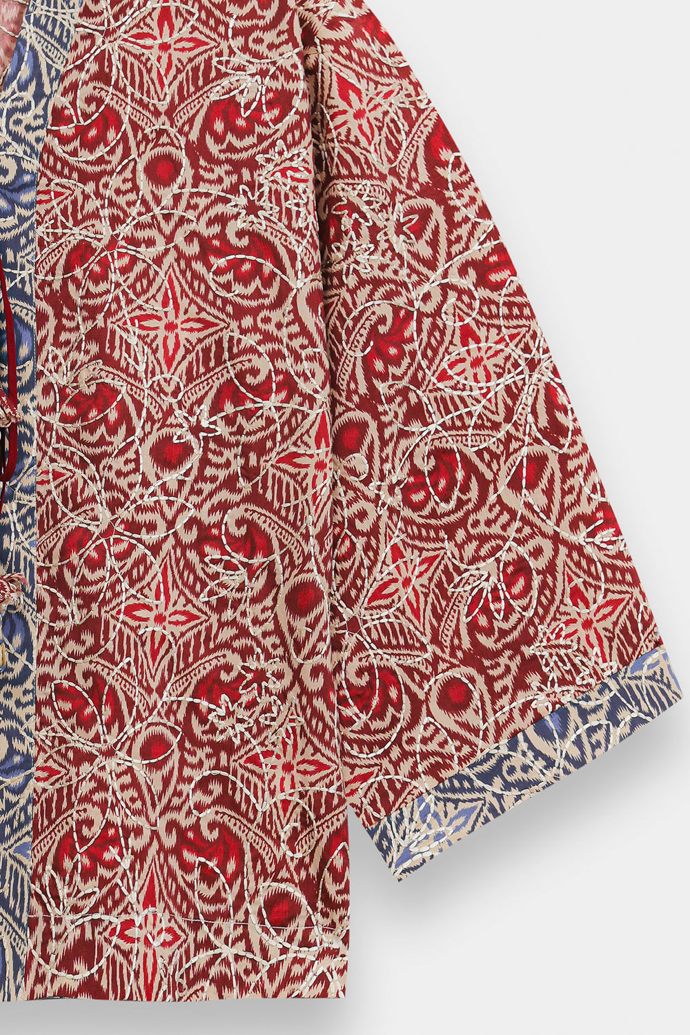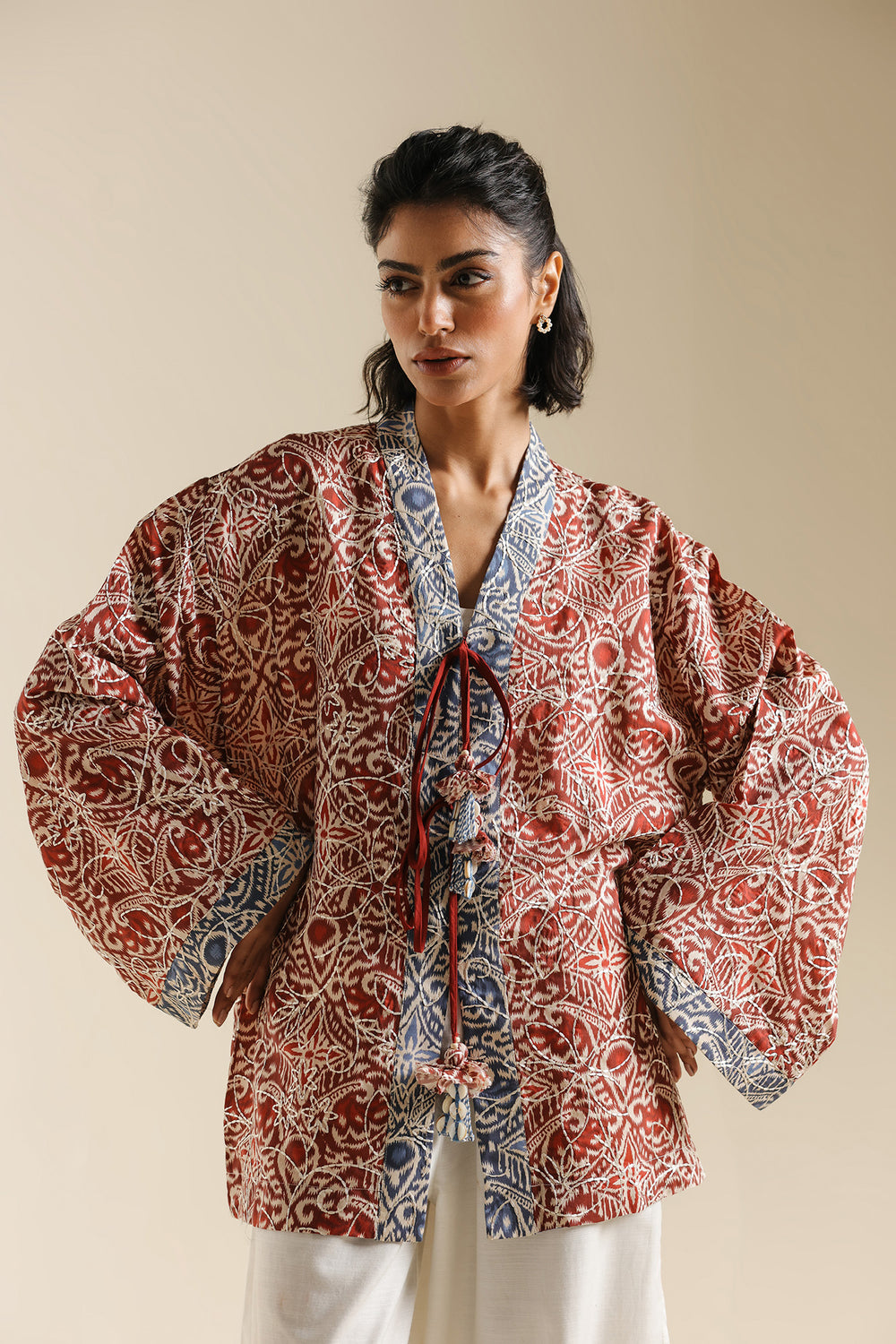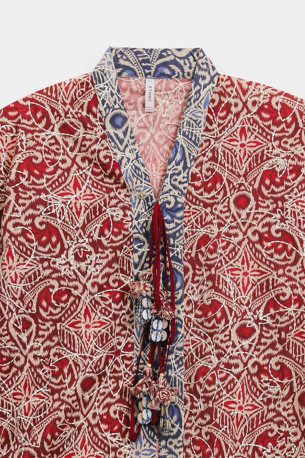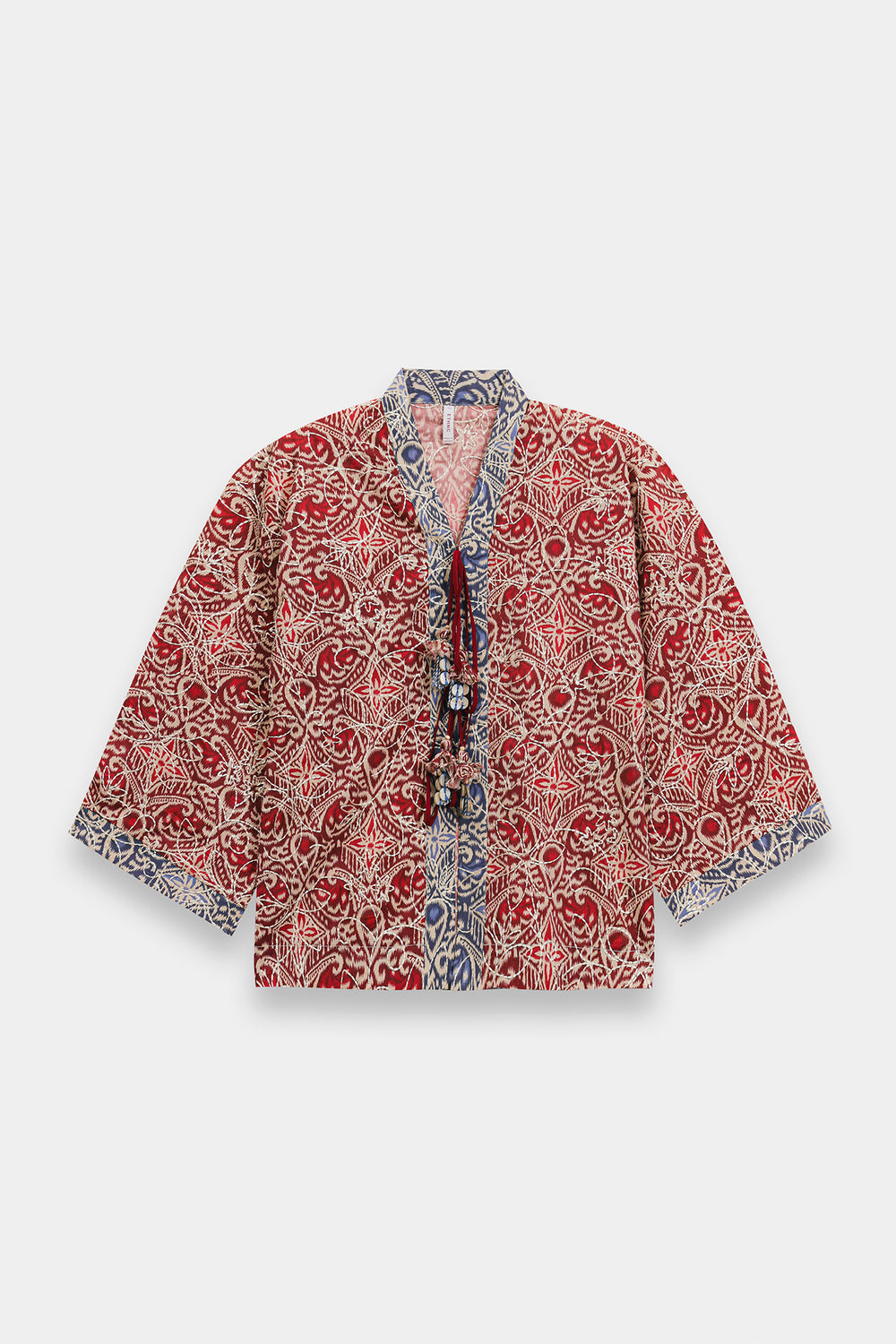 Infuse your seasonal wardrobe with a burst of color and intricate patterns with this cherry red top. Crafted from a lightweight, breathable fabric, it features a rich all-over kaleidoscope print in deep red and cream tones, accented with traditional blue and white borders at the collar and cuffs. The design is defined by its sophisticated wrap-style V-neckline, which is elevated by a striking tie-up closure featuring oversized, multi-colored fabric tassels and beadwork. With its relaxed, wide-cut sleeves and a comfortable, boxy silhouette, this one-piece tunic offers a perfect blend of bohemian flair and traditional elegance.