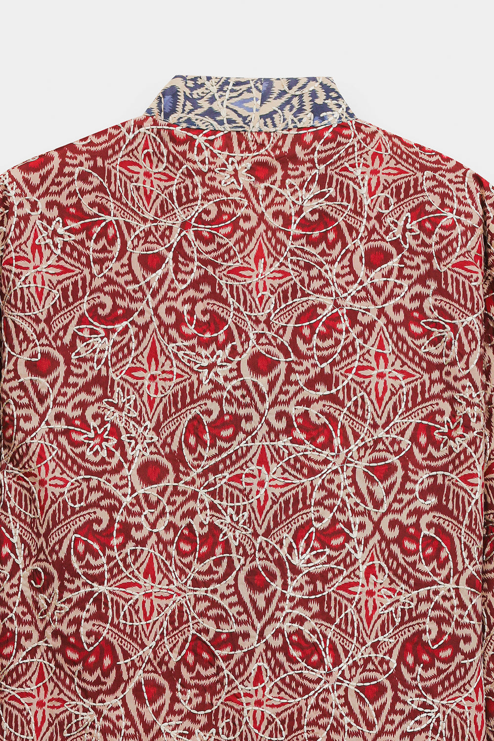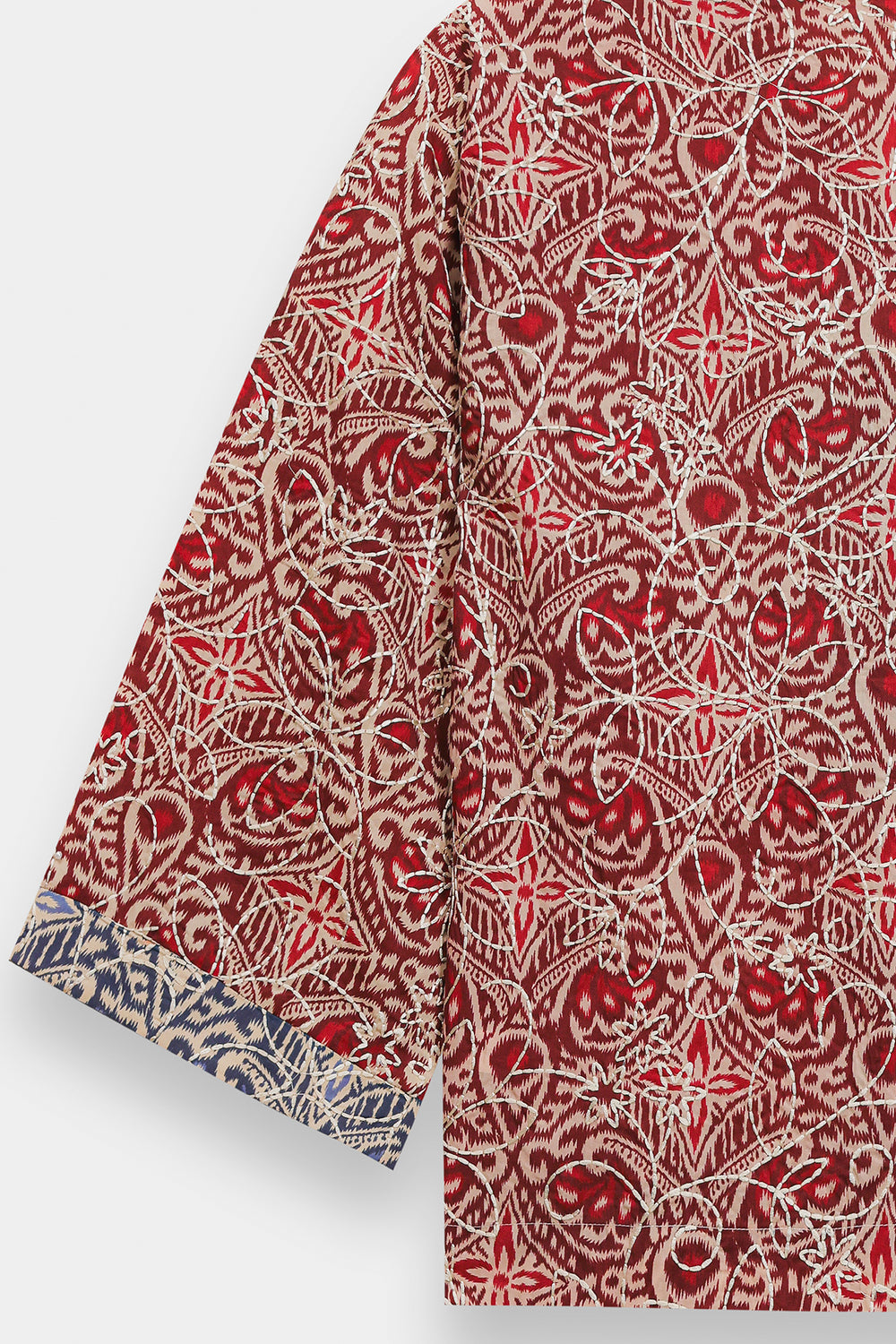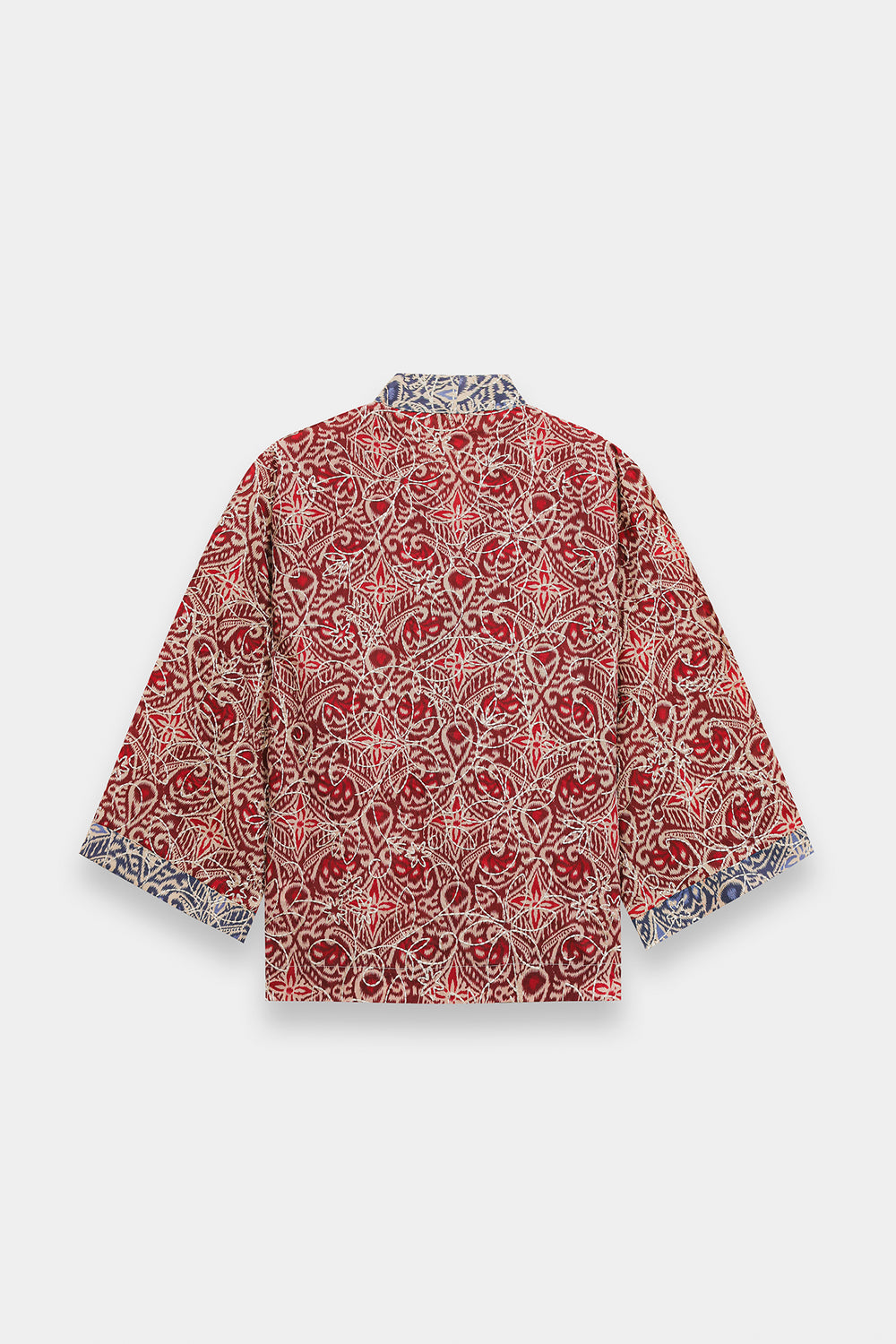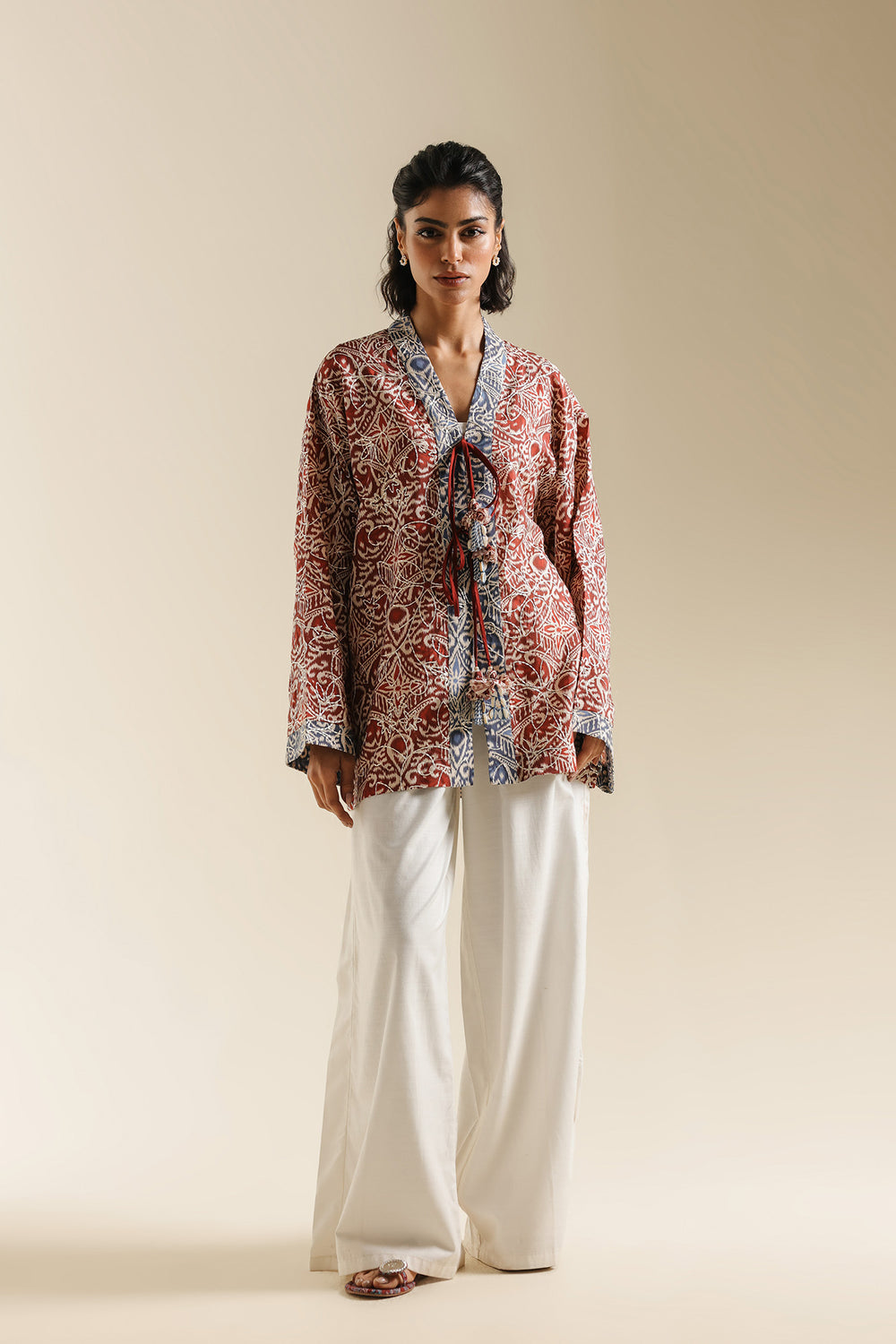 Infuse your seasonal wardrobe with a burst of color and intricate patterns with this cherry red top. Crafted from a lightweight, breathable fabric, it features a rich all-over kaleidoscope print in deep red and cream tones, accented with traditional blue and white borders at the collar and cuffs. The design is defined by its sophisticated wrap-style V-neckline, which is elevated by a striking tie-up closure featuring oversized, multi-colored fabric tassels and beadwork. With its relaxed, wide-cut sleeves and a comfortable, boxy silhouette, this one-piece tunic offers a perfect blend of bohemian flair and traditional elegance.