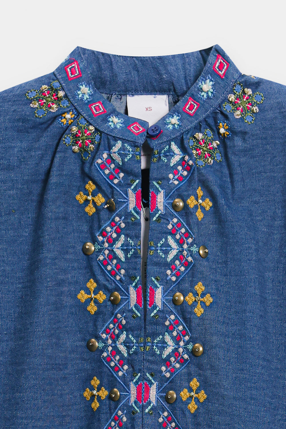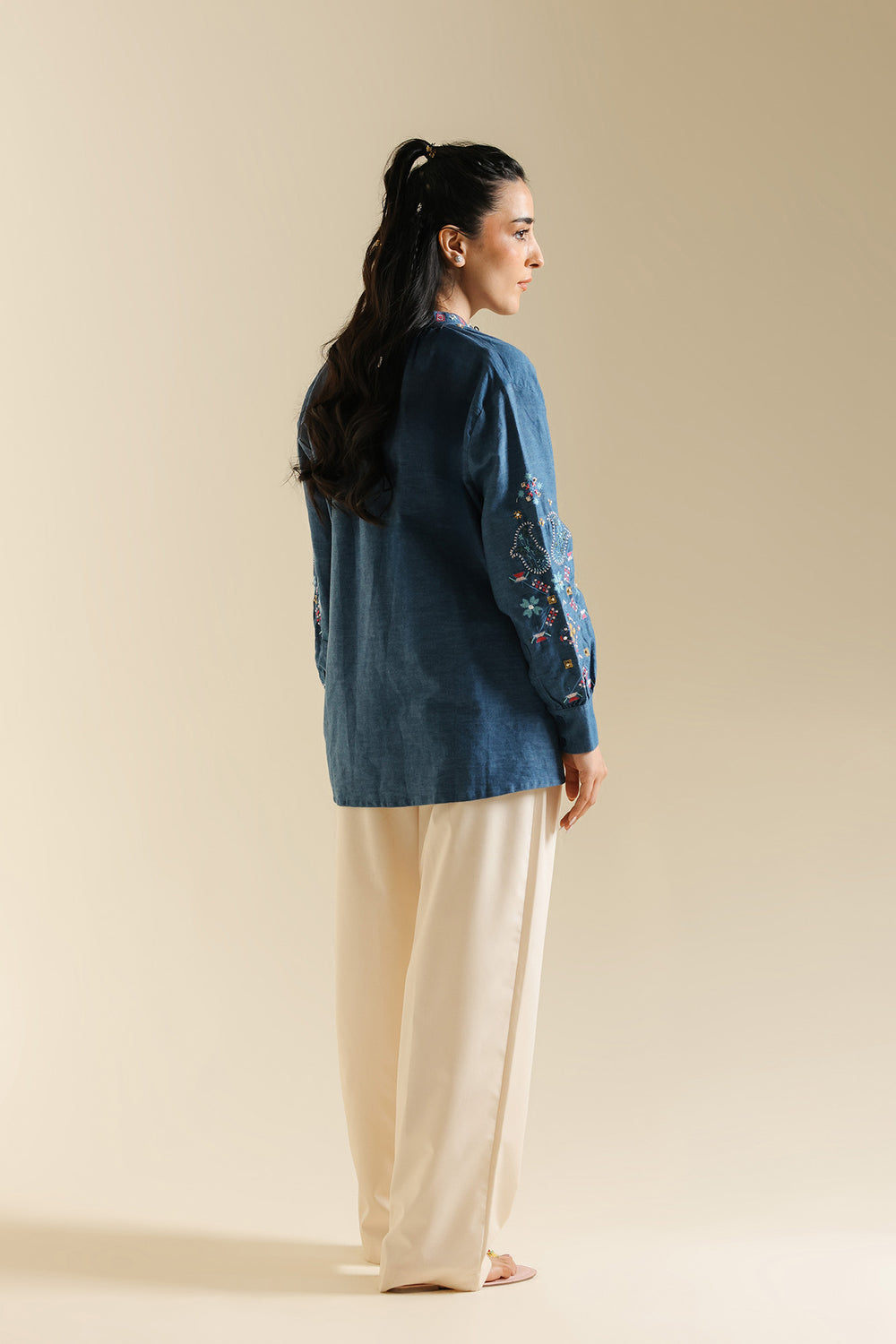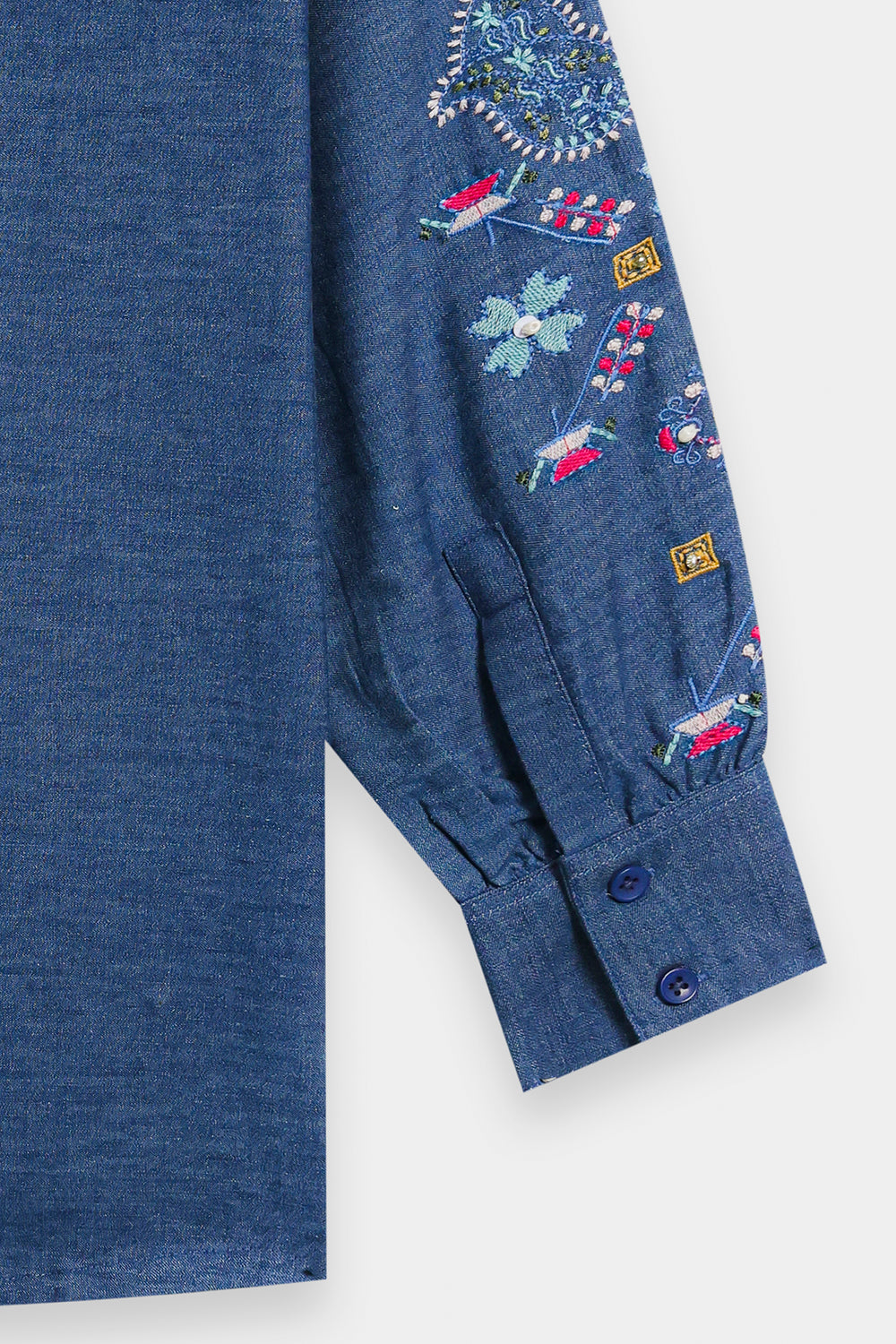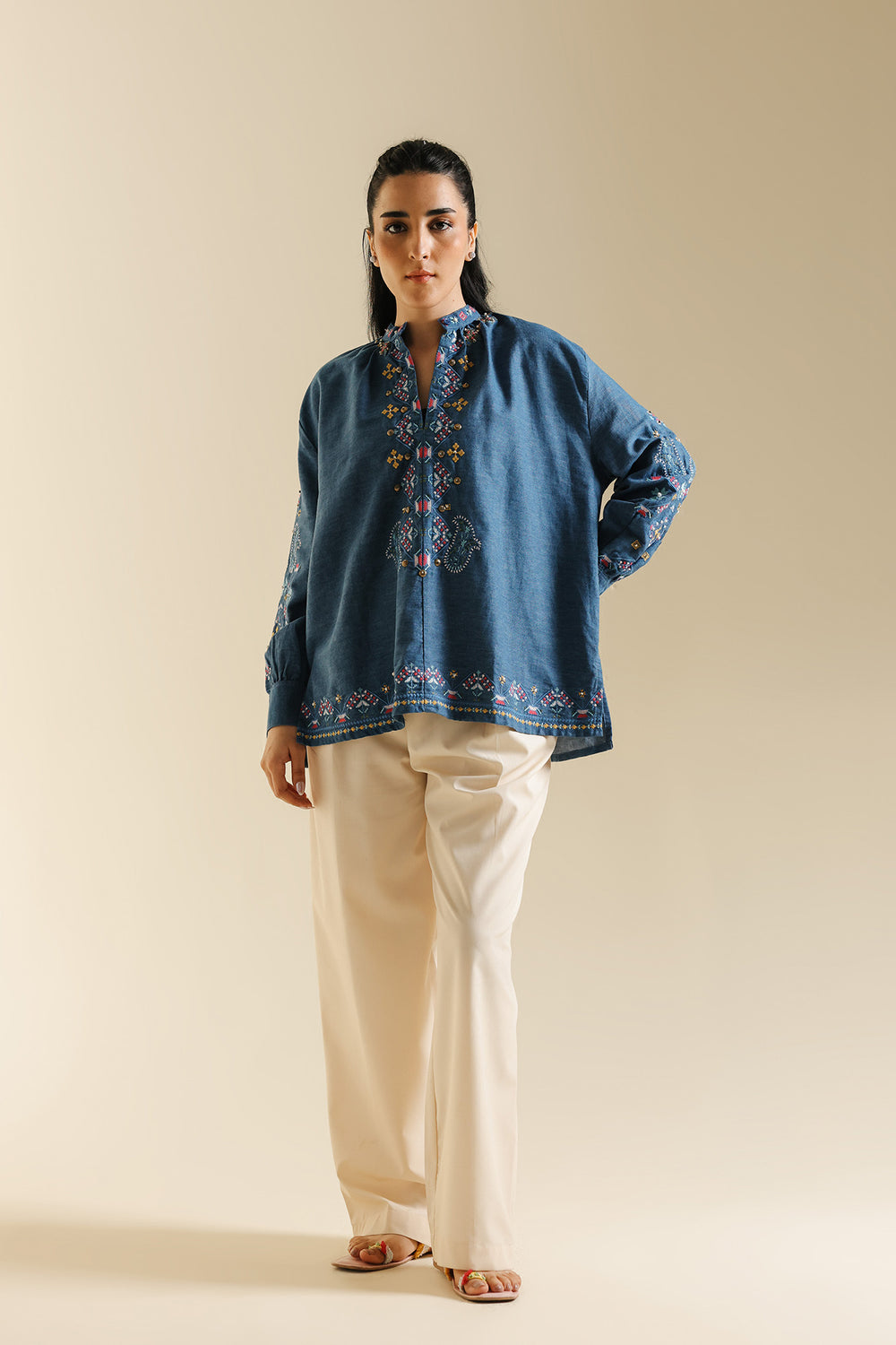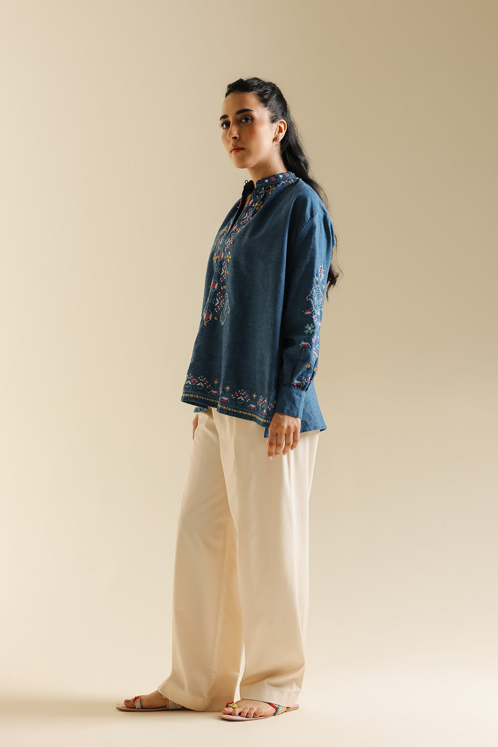 Dive into everyday chic with this stylish indigo blue Kurti. Crafted from a comfortable textured denim-like fabric, this kurti features a relaxed, comfortable silhouette and a band collar with a slit V-neckline. The front is adorned with beautiful colorful thread embroidery in floral and geometric patterns, primarily using pink, red, yellow, and blue hues. The long sleeves also feature delicate, coordinating embroidery details. Pair this richly textured top with crisp white or cream trousers for a balanced and effortless look.