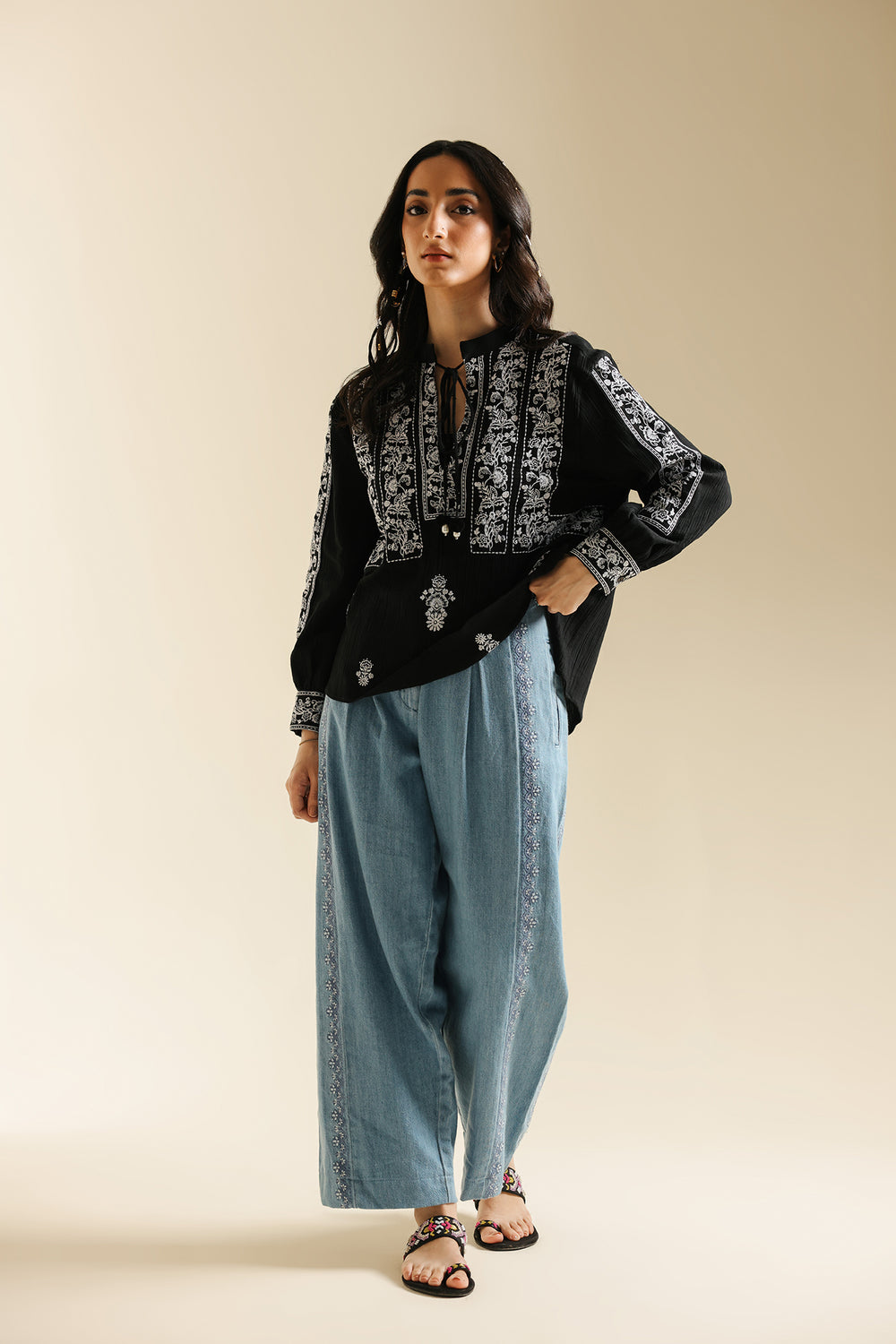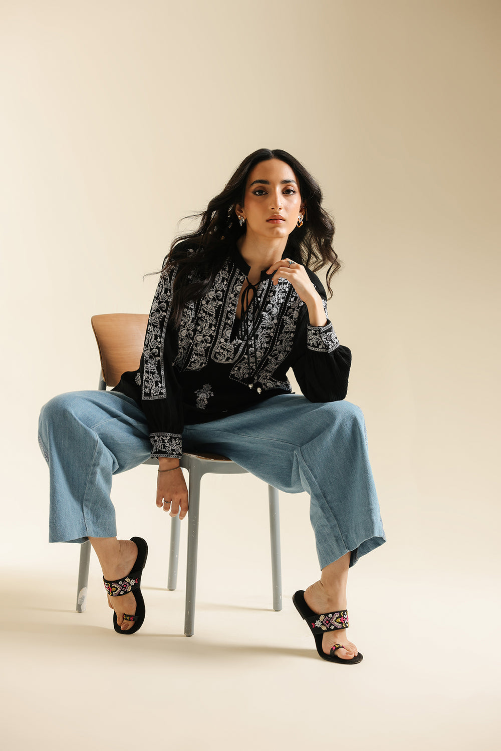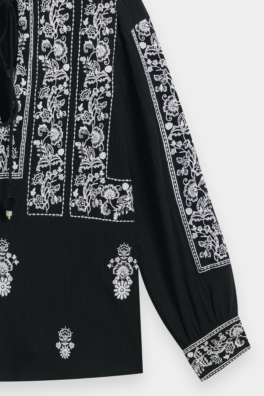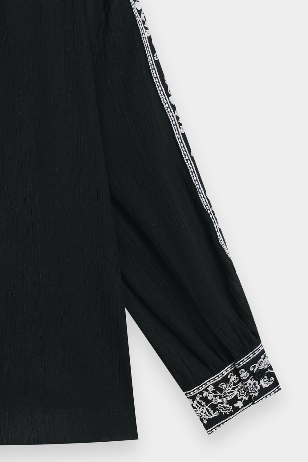 Wrap yourself in classic elegance with this sophisticated black and white embroidered kurti. This beautiful top features intricate white embroidery that creates a striking contrast against the dark fabric. The detailed floral patterns cover the chest and sleeves, and the tassel ties at the neckline add a touch of traditional charm. Perfect for a special occasion or a stylish day out, this kurti offers a blend of timeless style and modern comfort.