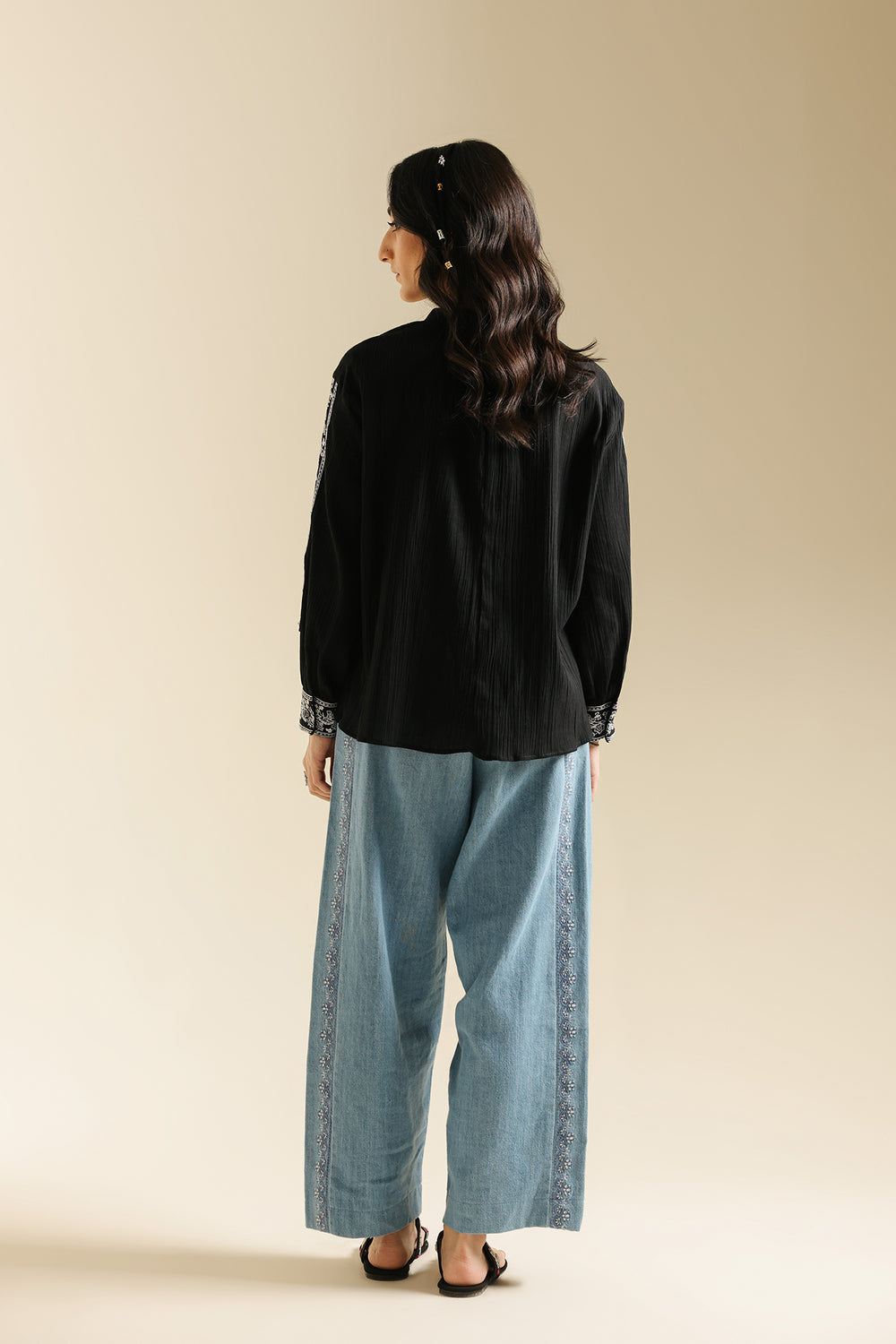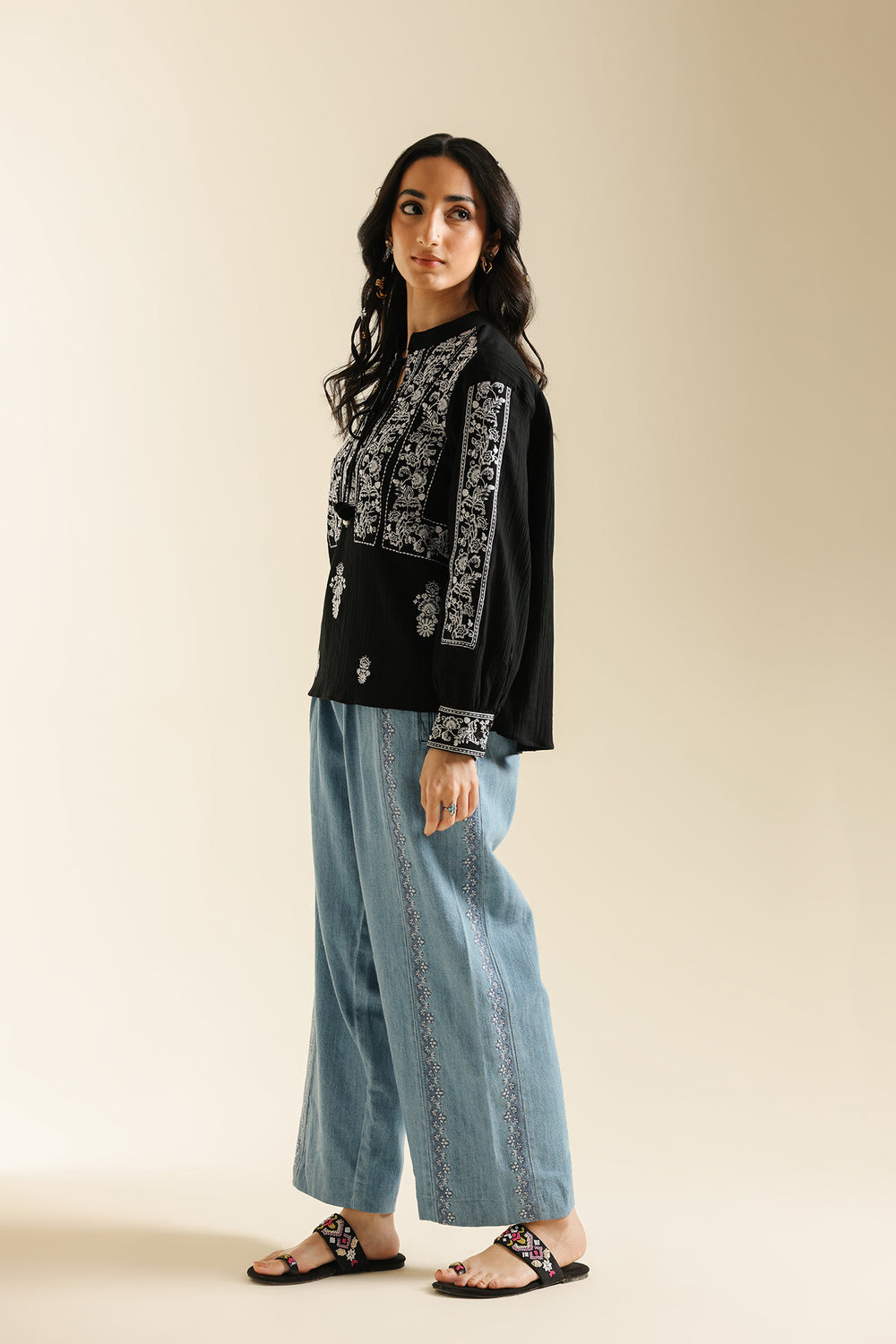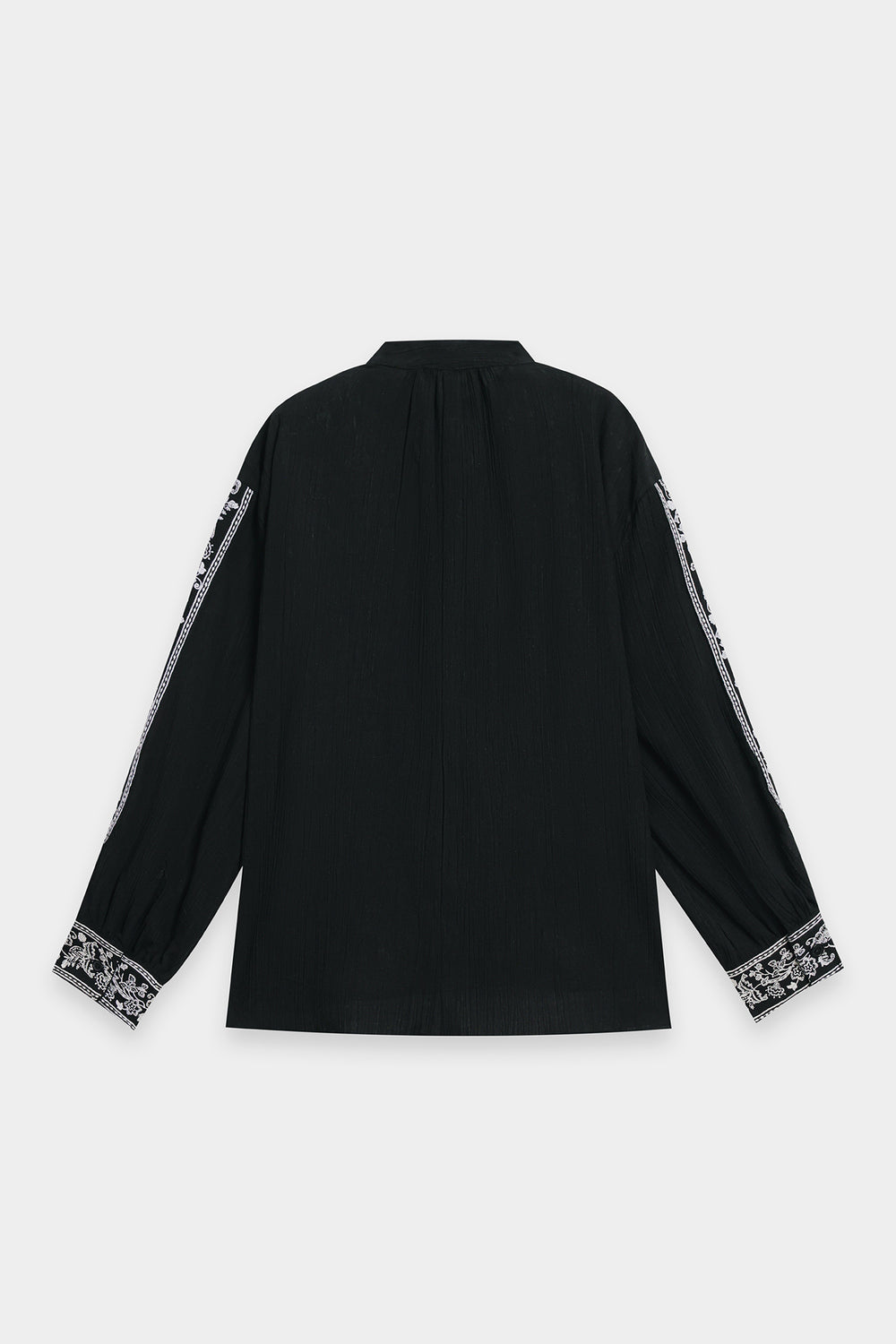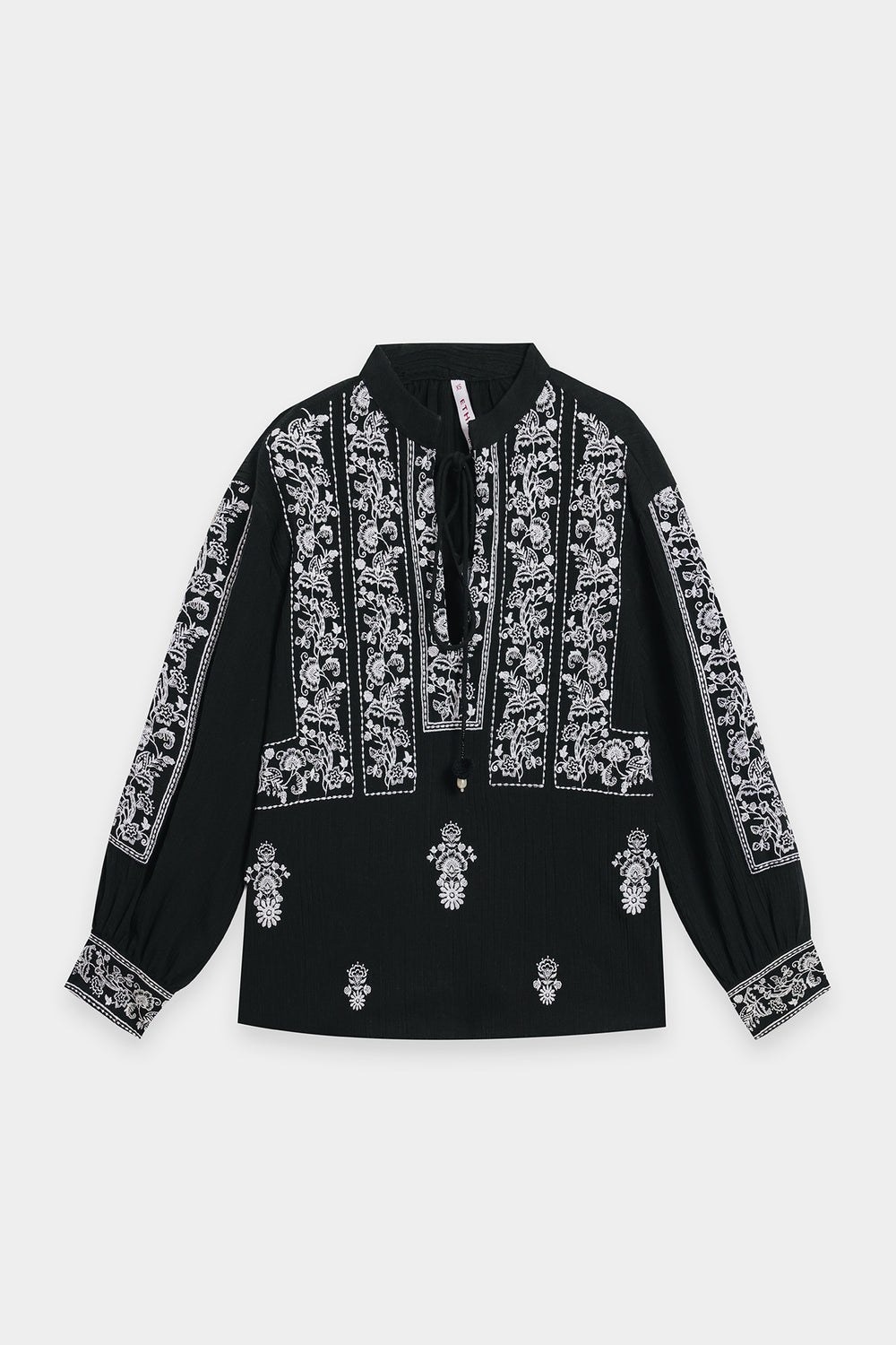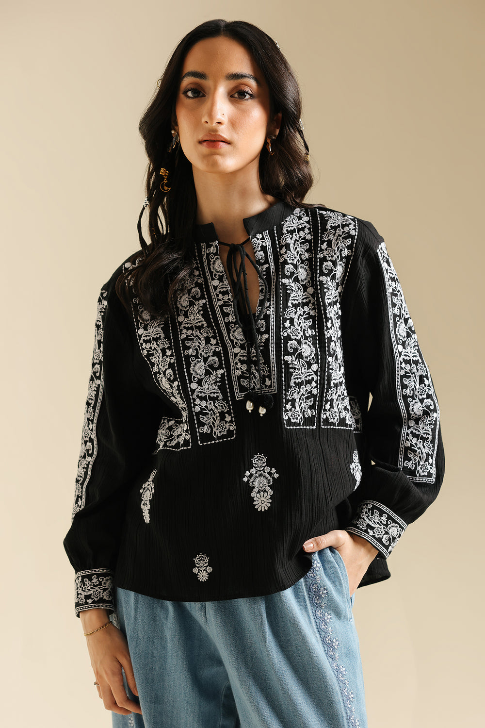 Wrap yourself in classic elegance with this sophisticated black and white embroidered kurti. This beautiful top features intricate white embroidery that creates a striking contrast against the dark fabric. The detailed floral patterns cover the chest and sleeves, and the tassel ties at the neckline add a touch of traditional charm. Perfect for a special occasion or a stylish day out, this kurti offers a blend of timeless style and modern comfort.