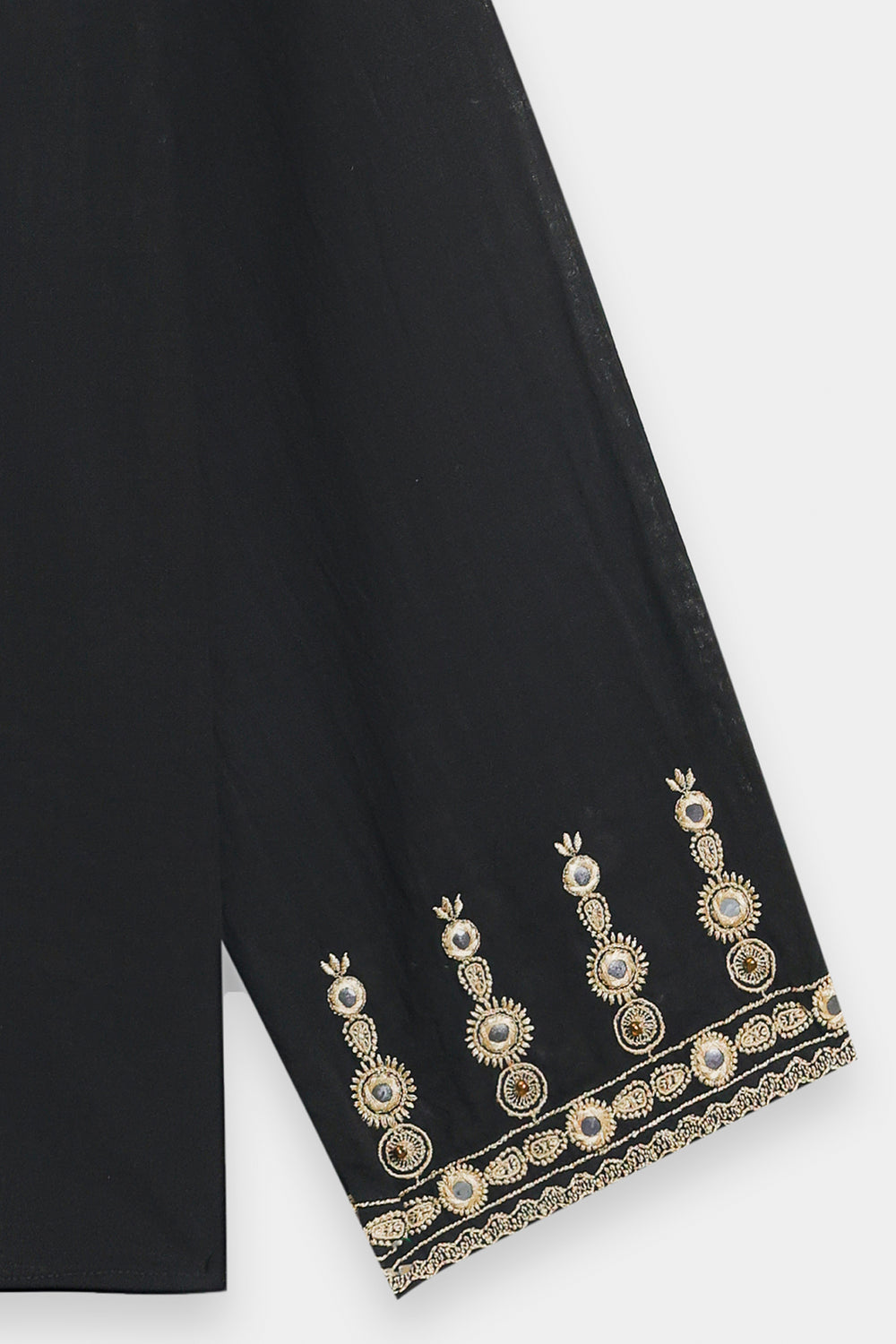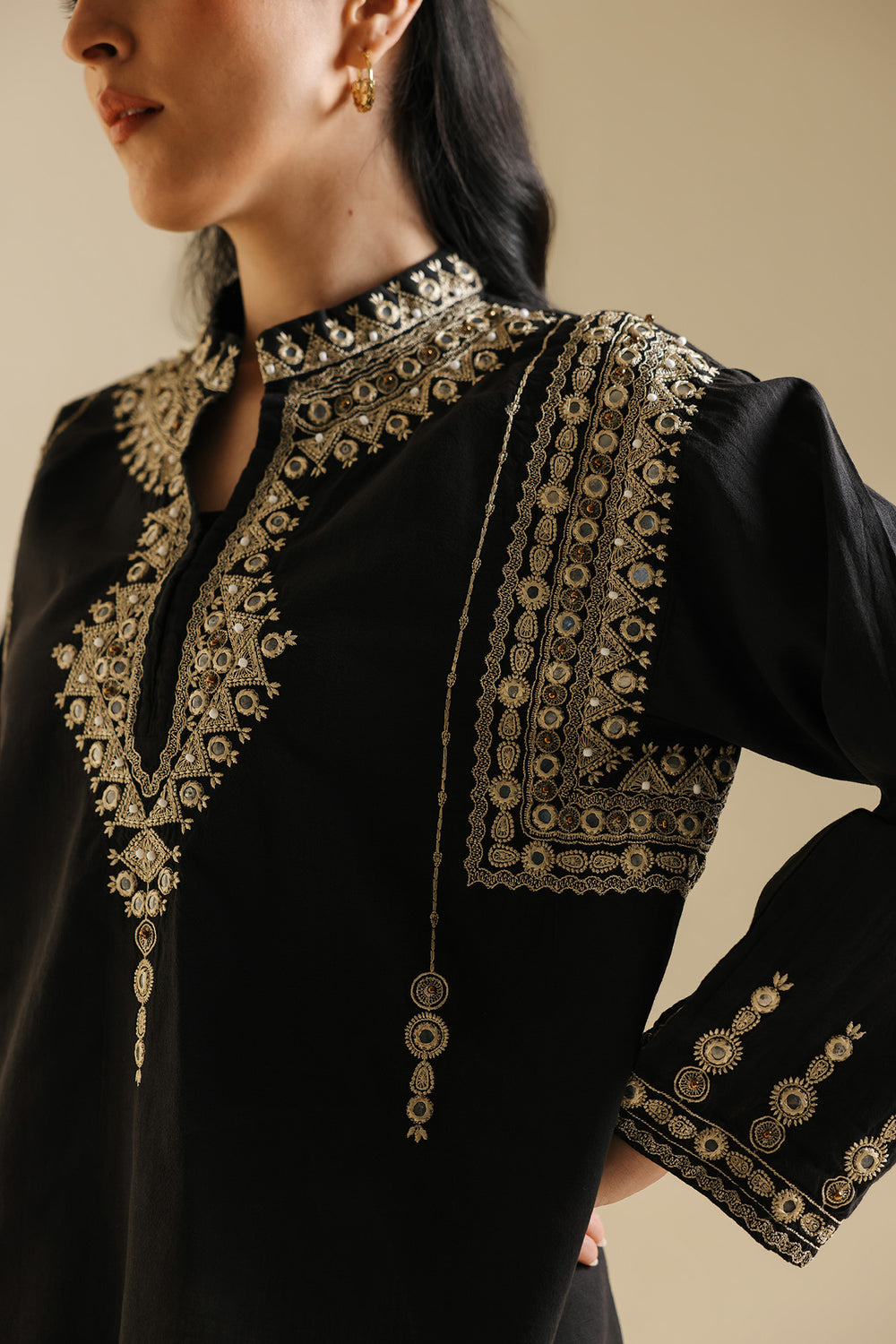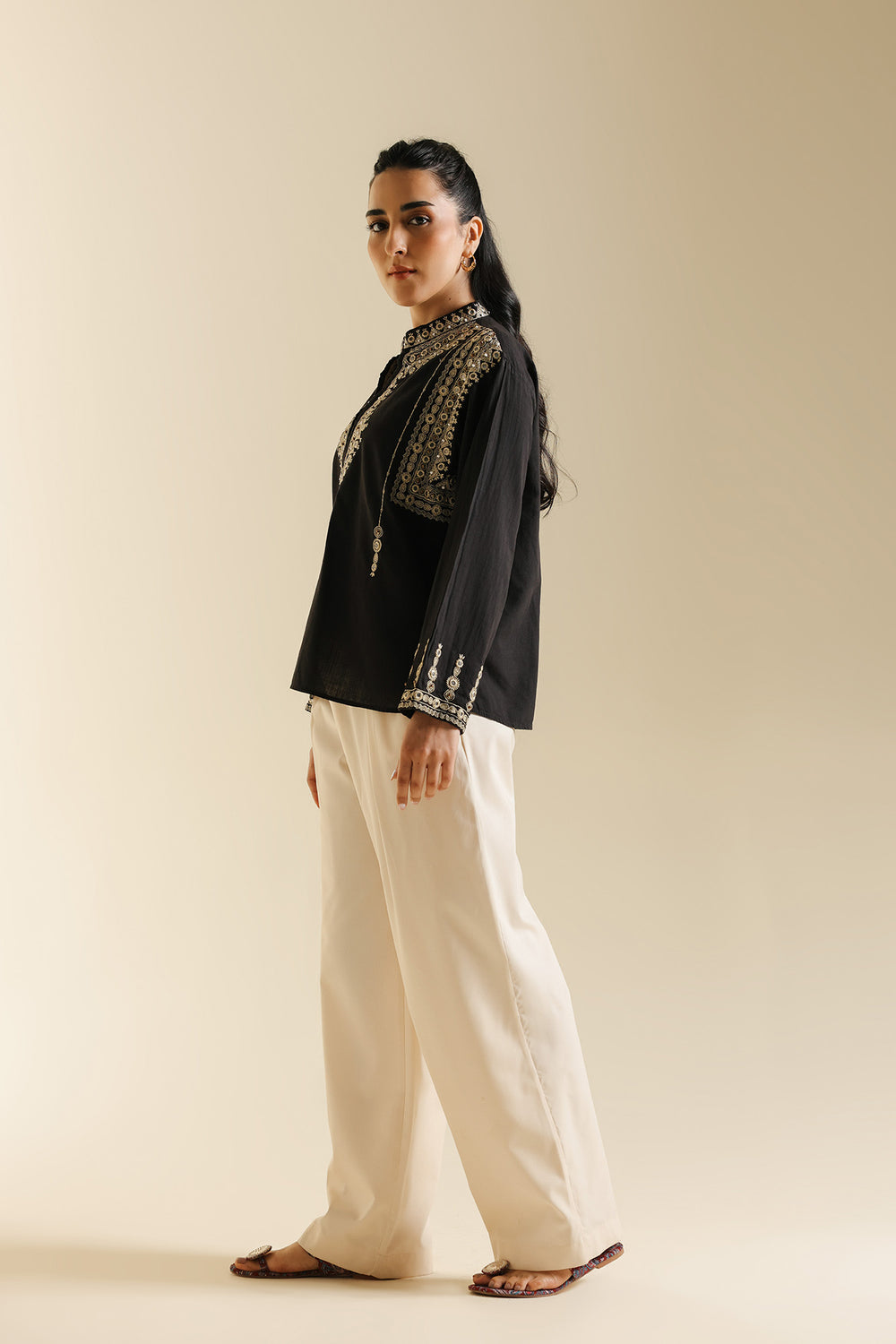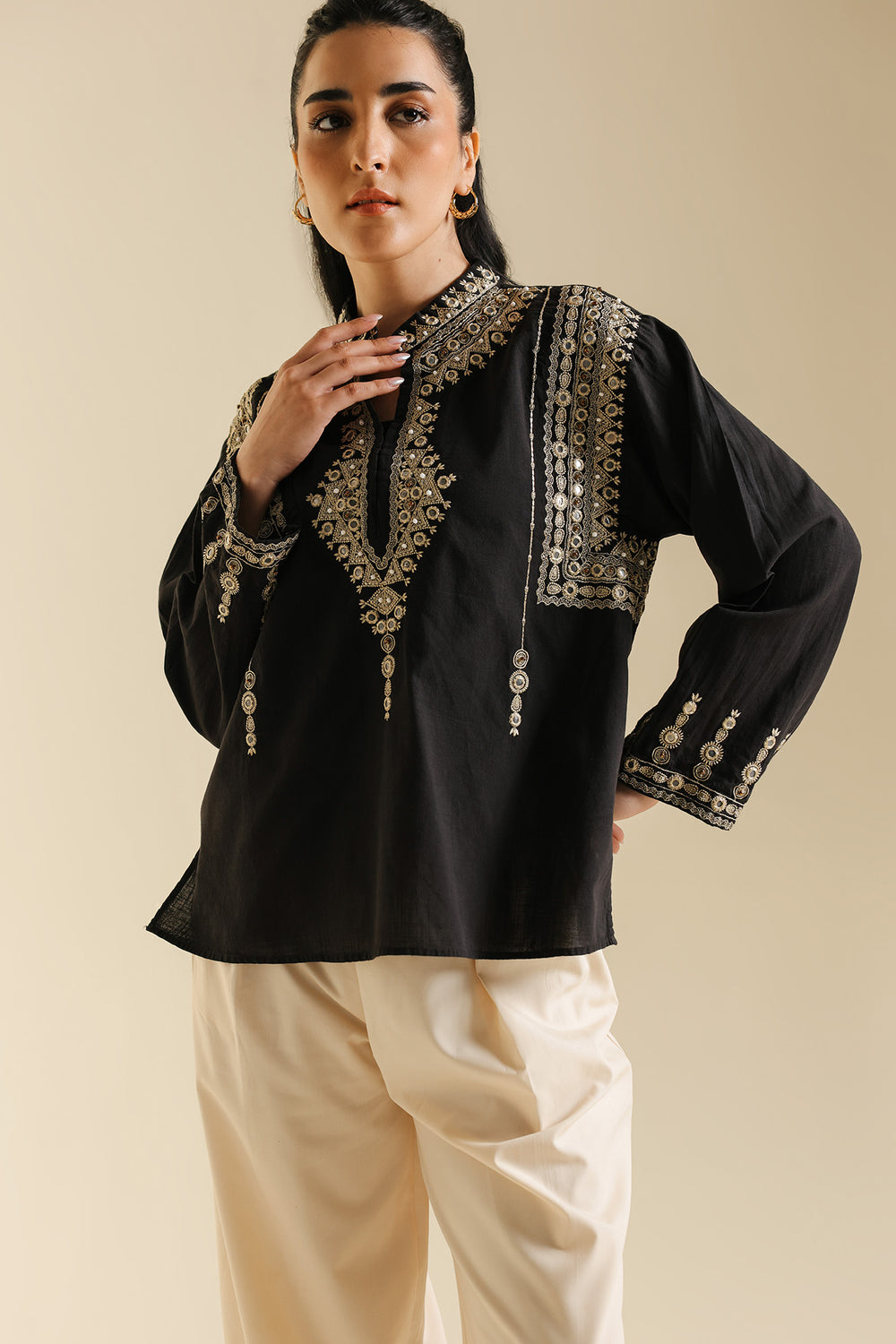 Exude understated chic in this black embroidered kurti. This short-length, long-sleeved kurti is crafted from a comfortable black fabric and features a band collar with a slit neckline. The silver and white thread embroidery forms beautiful traditional motifs across the yoke, neckline, and cuffs. The monochrome color scheme offers a versatile and sophisticated look. Pair this striking top with wide-leg beige or white trousers for a balanced and contemporary silhouette.