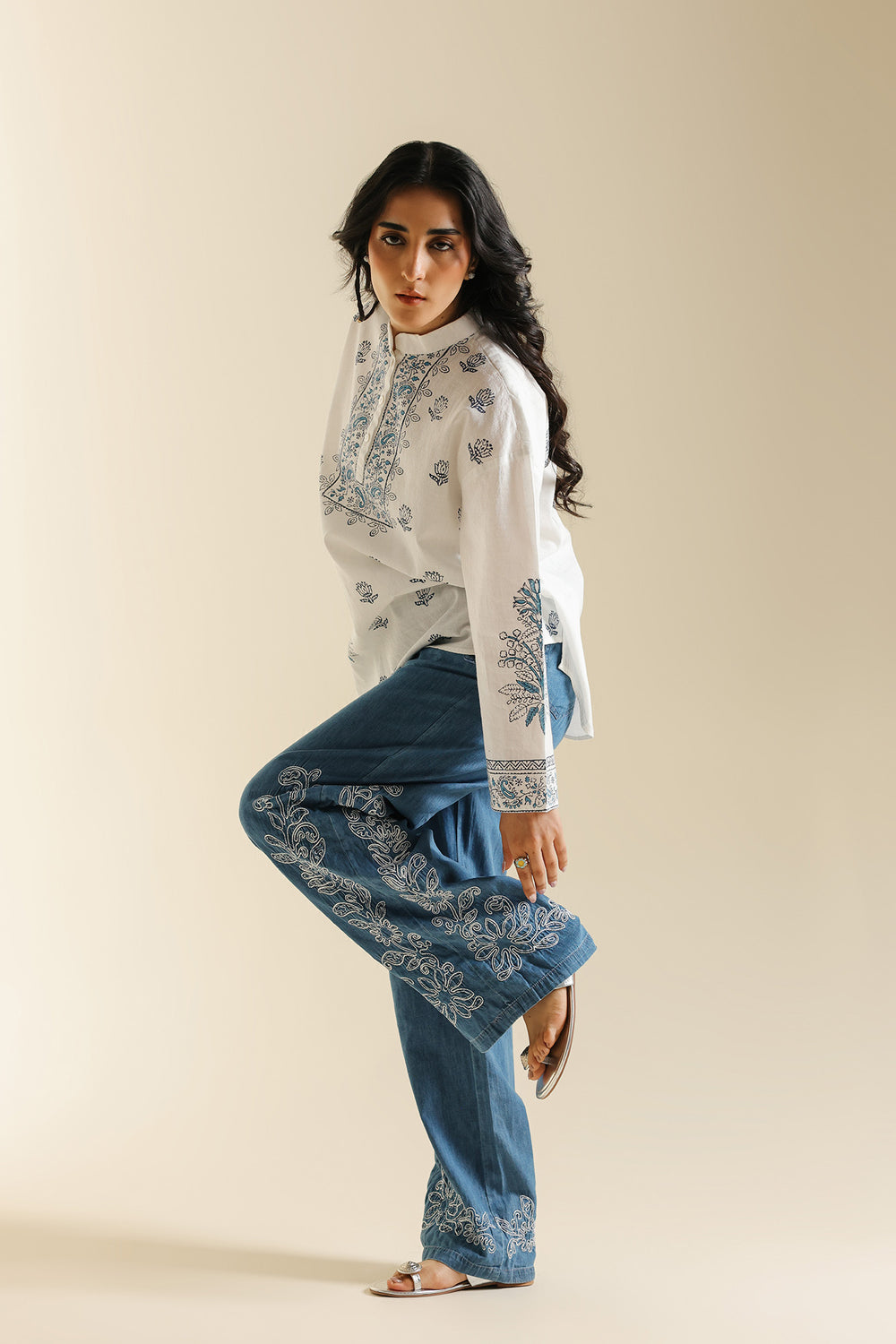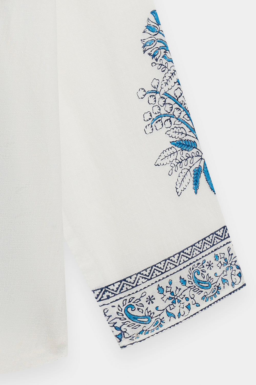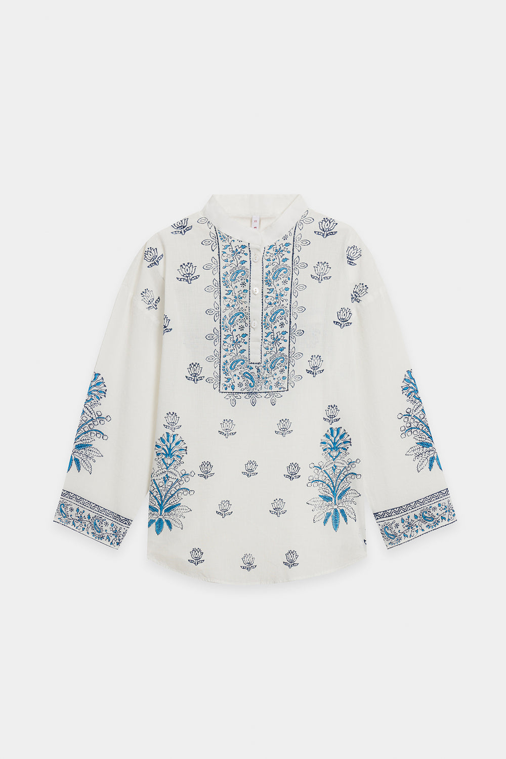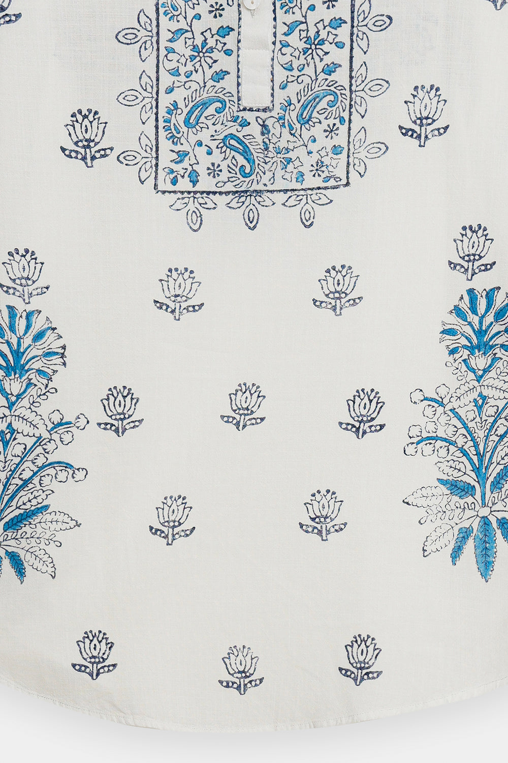Add a fresh, breezy feel to your wardrobe with this stylish white printed kurti. This relax fit shirt is made from a crisp white fabric and features a band collar with a slit neckline. The entire top is adorned with beautiful, contrasting indigo blue print in traditional floral and botanical motifs. The print is concentrated around the yoke, shoulders, and the long sleeves. This elegant kurti offers a contemporary take on classic folk patterns, perfect for pairing with denim or embroidered trousers.