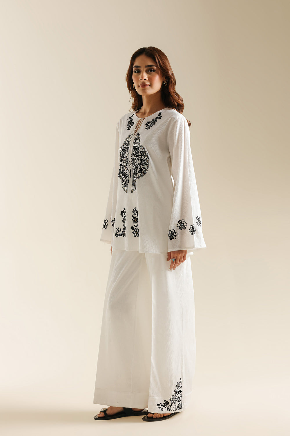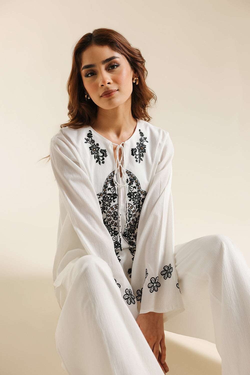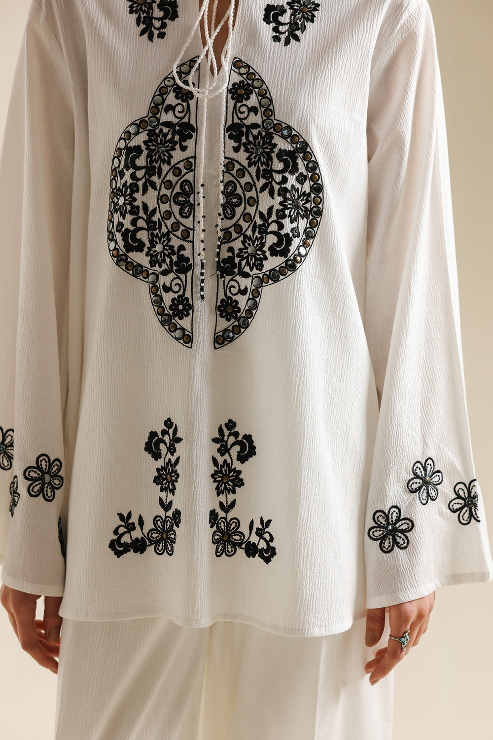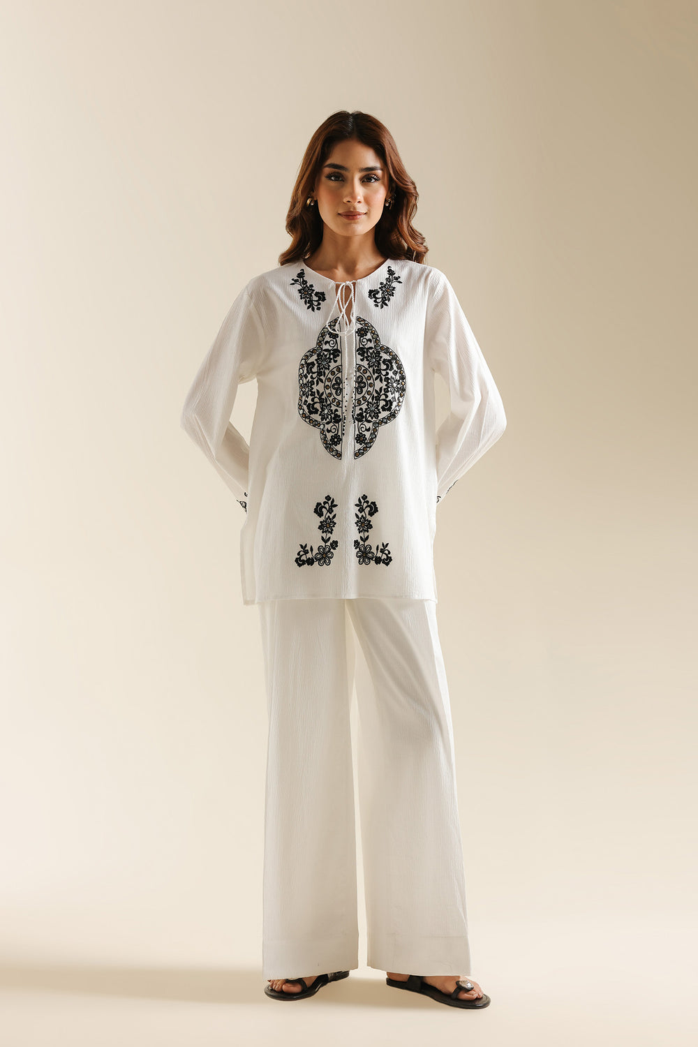 Achieve a look of modern serenity with this off-white two-piece suit, a sophisticated ensemble that celebrates clean lines and high-contrast detailing. The shirt is crafted from a premium textured fabric, providing a structured yet breathable silhouette. It features a minimalist round neckline with a delicate tie-up detail, serving as a canvas for the bold, black ethnic embroidery that anchors the front. The intricate central motif is mirrored by floral accents at the hem and cuffs, creating a balanced and striking visual. This contemporary tunic is paired with matching wide-leg off-white trousers, offering a seamless and elongated profile that exudes effortless elegance. Whether for a creative workspace or a refined daytime event, this set is a testament to understated luxury.