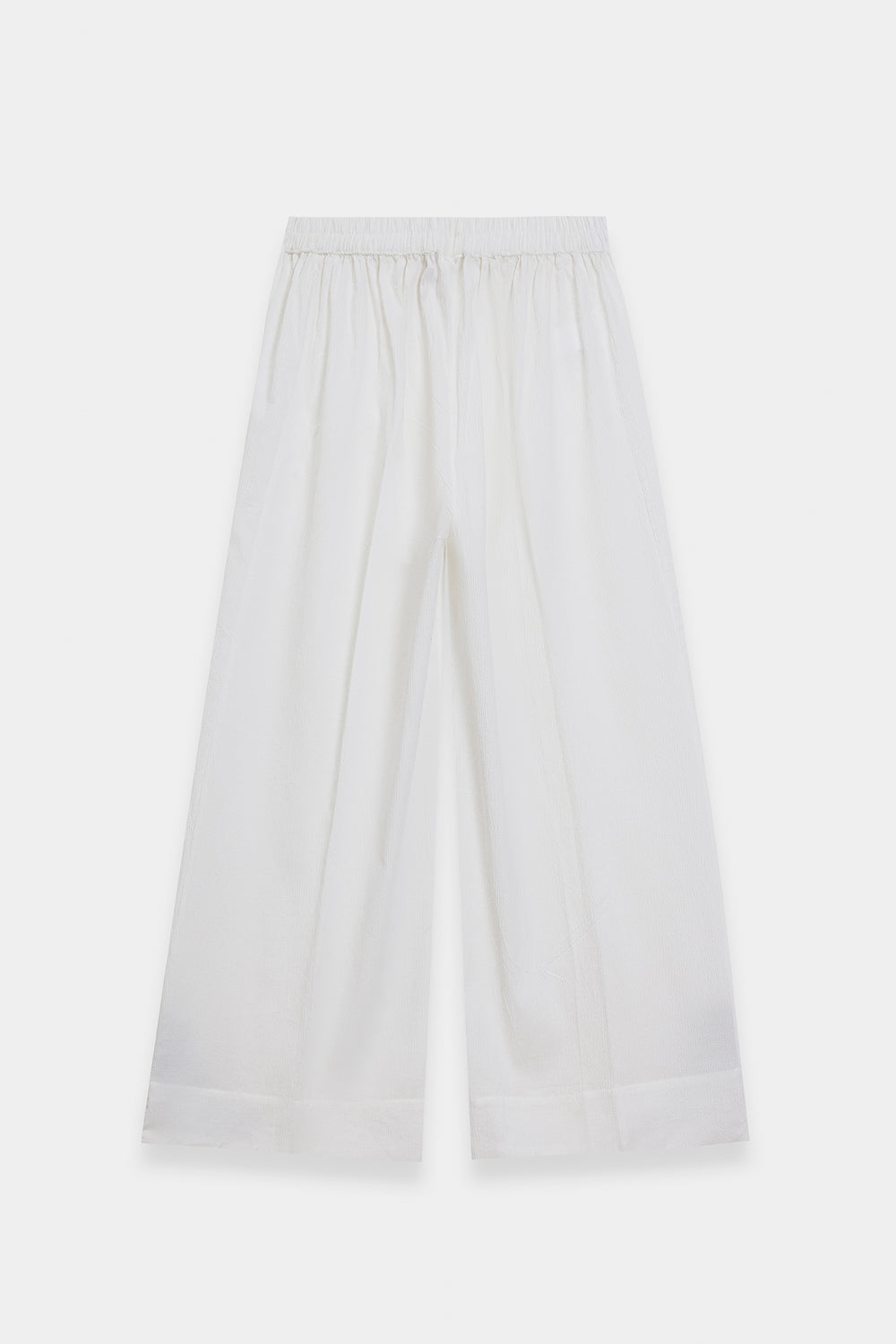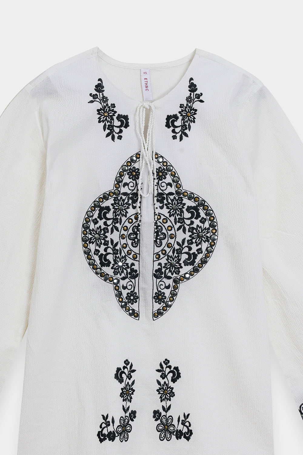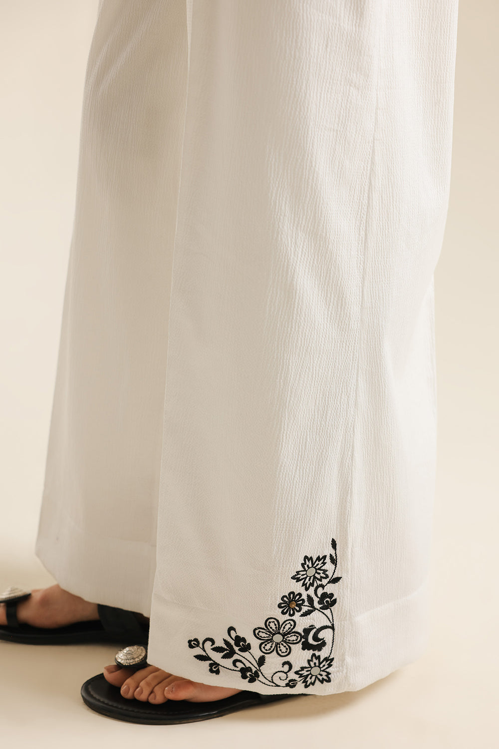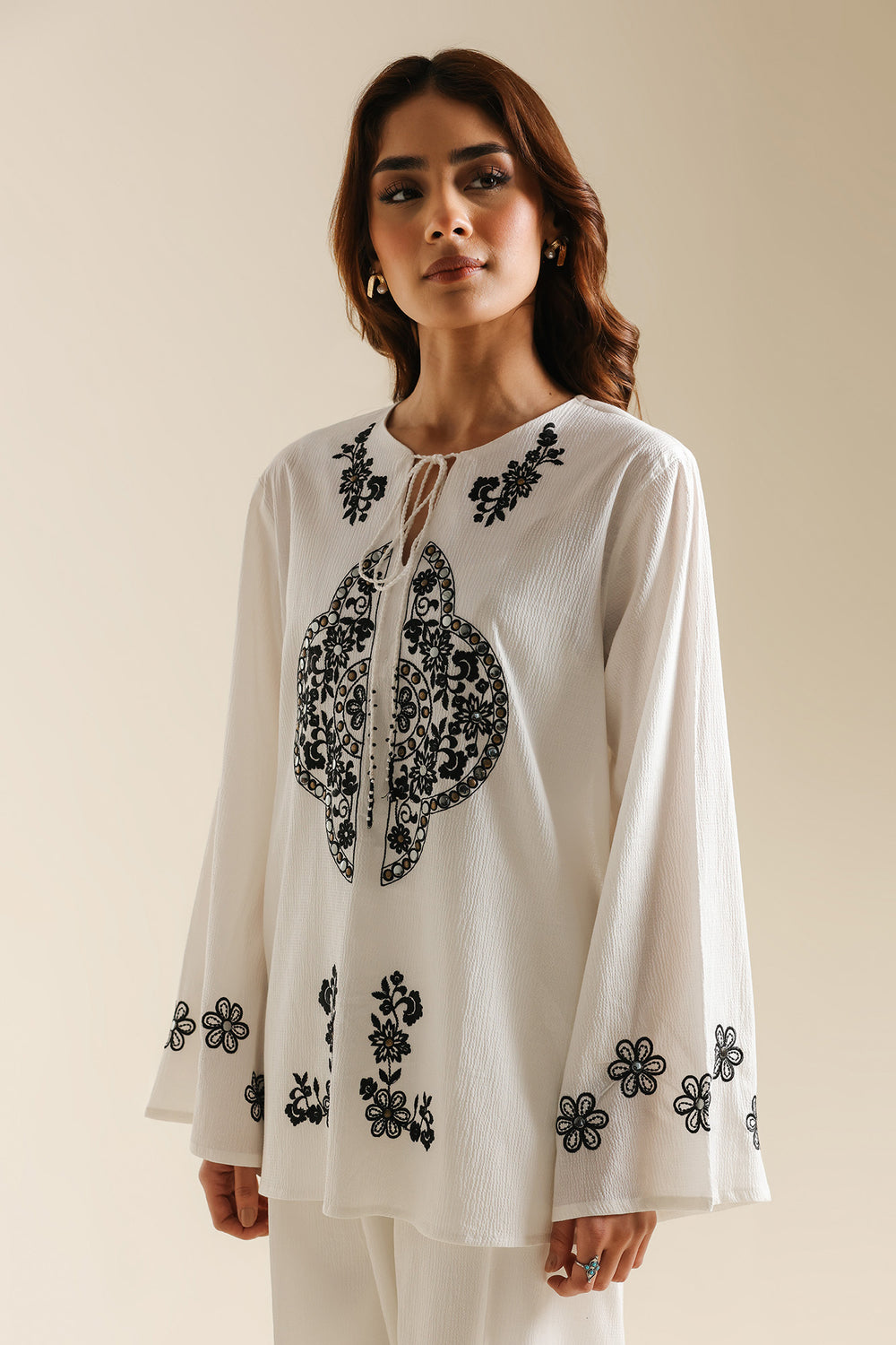 Achieve a look of modern serenity with this off-white two-piece suit, a sophisticated ensemble that celebrates clean lines and high-contrast detailing. The shirt is crafted from a premium textured fabric, providing a structured yet breathable silhouette. It features a minimalist round neckline with a delicate tie-up detail, serving as a canvas for the bold, black ethnic embroidery that anchors the front. The intricate central motif is mirrored by floral accents at the hem and cuffs, creating a balanced and striking visual. This contemporary tunic is paired with matching wide-leg off-white trousers, offering a seamless and elongated profile that exudes effortless elegance. Whether for a creative workspace or a refined daytime event, this set is a testament to understated luxury.