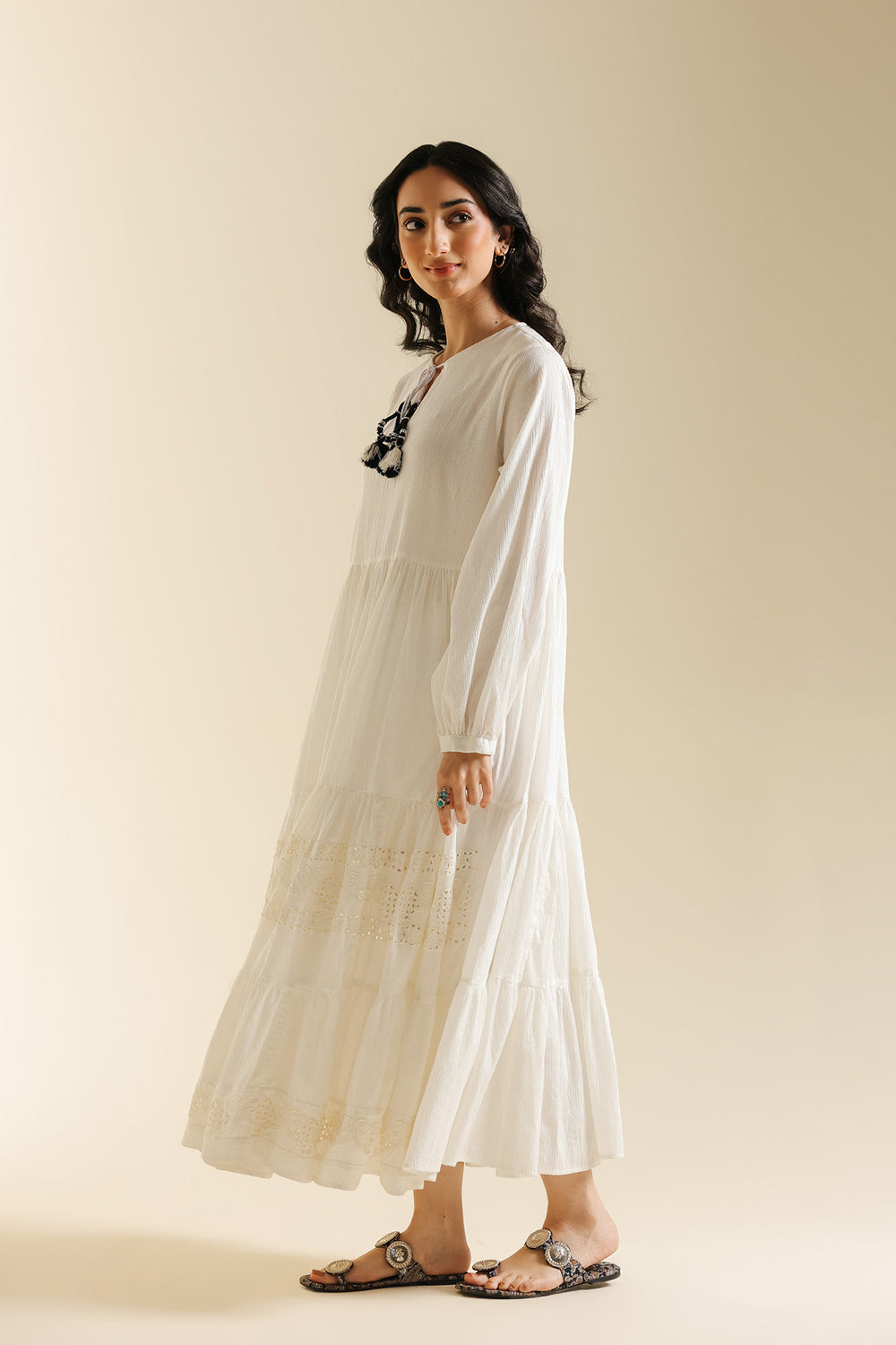 Embrace graceful simplicity with this beautiful white embroidered dress. This maxi-length dress is crafted from a comfortable white fabric with a subtle texture and features a flowing, tiered silhouette. The round neckline has a keyhole slit accented with playful black and white tassels. The lower tiers of the skirt are beautifully detailed with intricate cut-work and embroidery, adding a sophisticated, handcrafted touch. The full, gathered sleeves complete this effortless and elegant look, perfect for a relaxed yet chic style.
