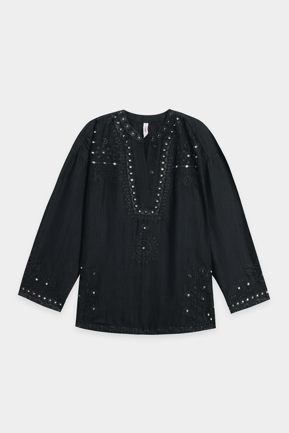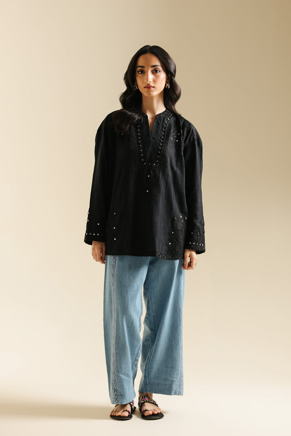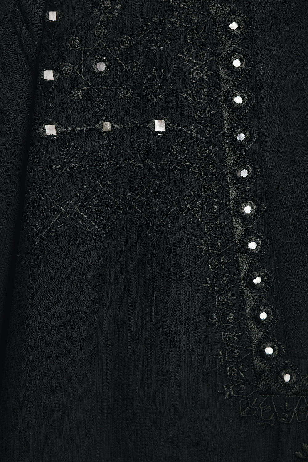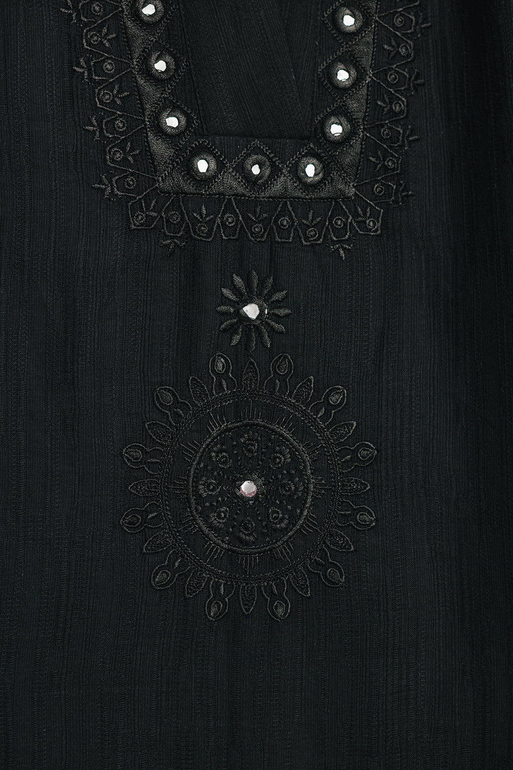 Adorn yourself in this striking black kurti, a perfect blend of modern style and traditional artistry. This top features intricate embroidery and shimmering mirror work around the neckline and on the sleeves, creating a captivating design. The relaxed fit ensures comfort while the elaborate detailing makes it a showstopper. Perfect for a festive occasion or a chic evening out, this kurti is sure to make a statement.