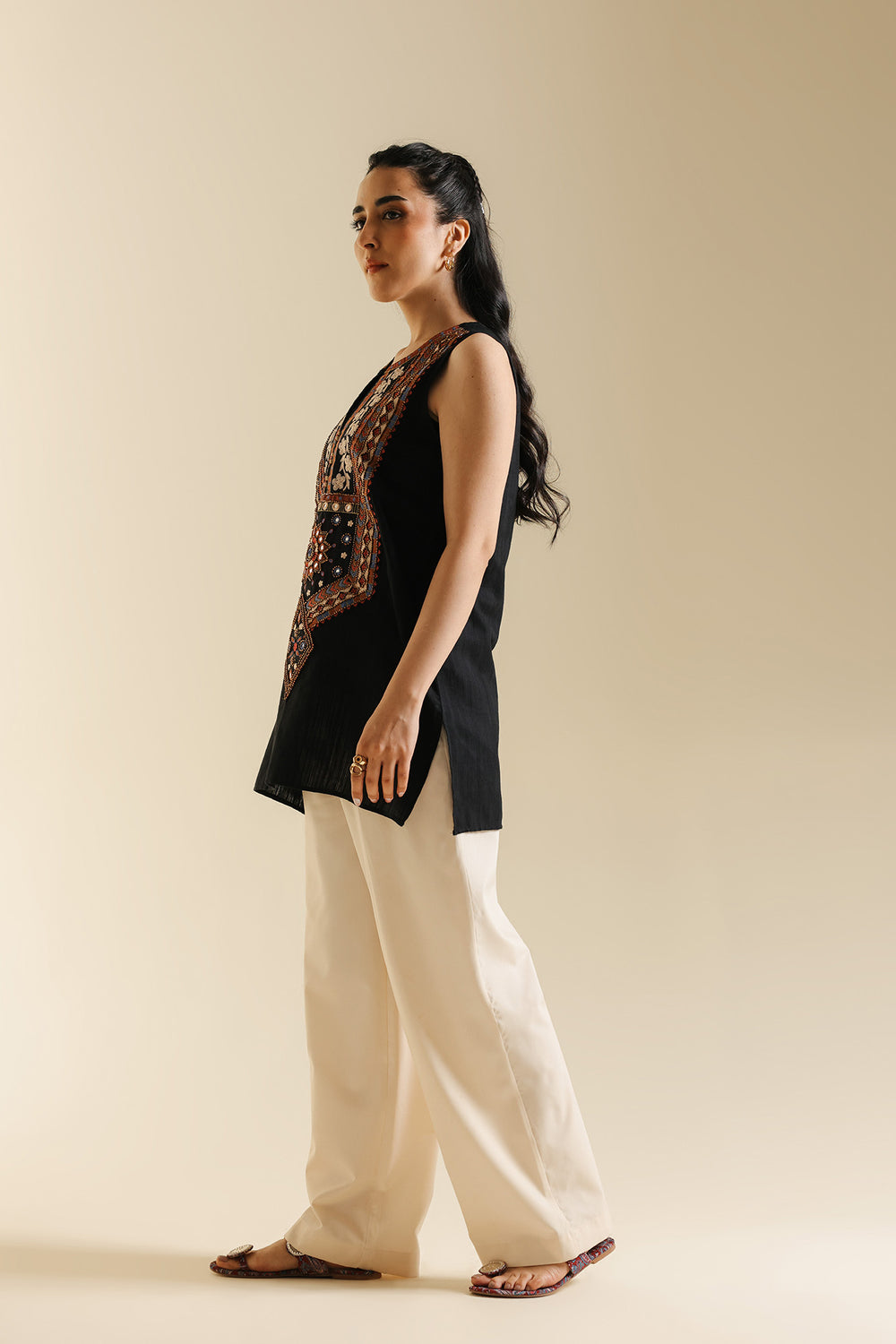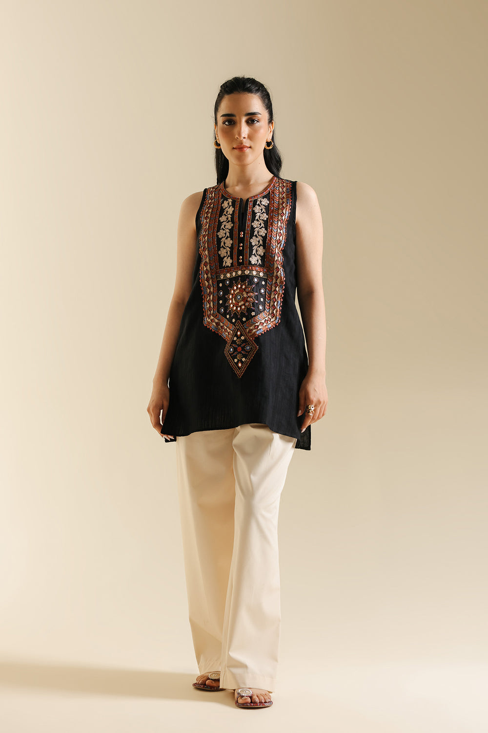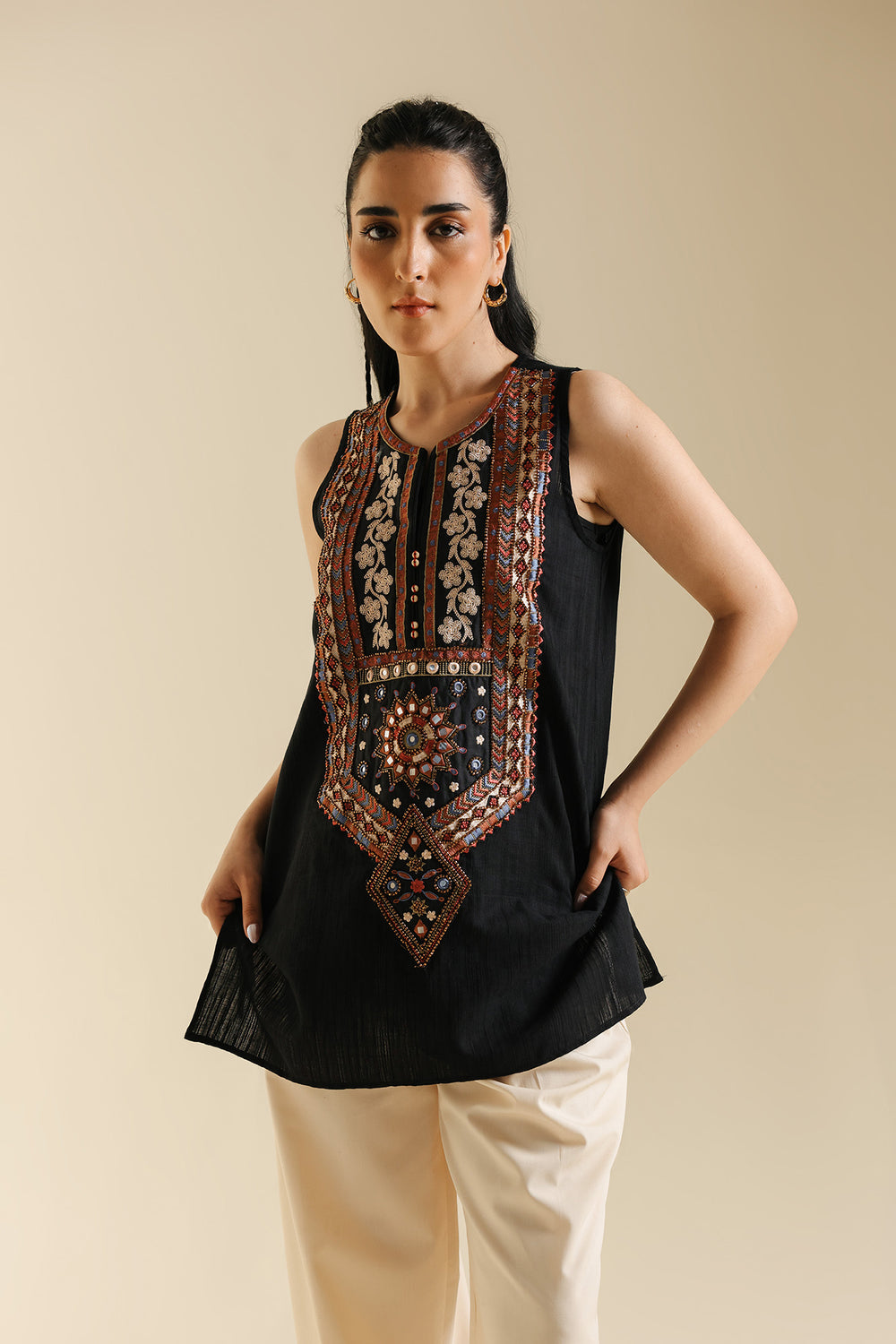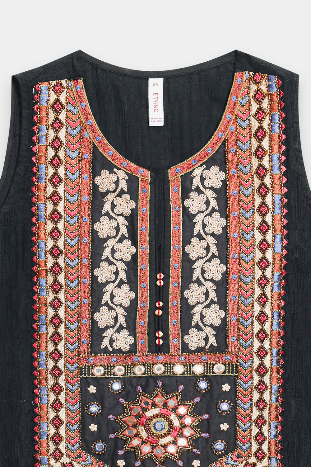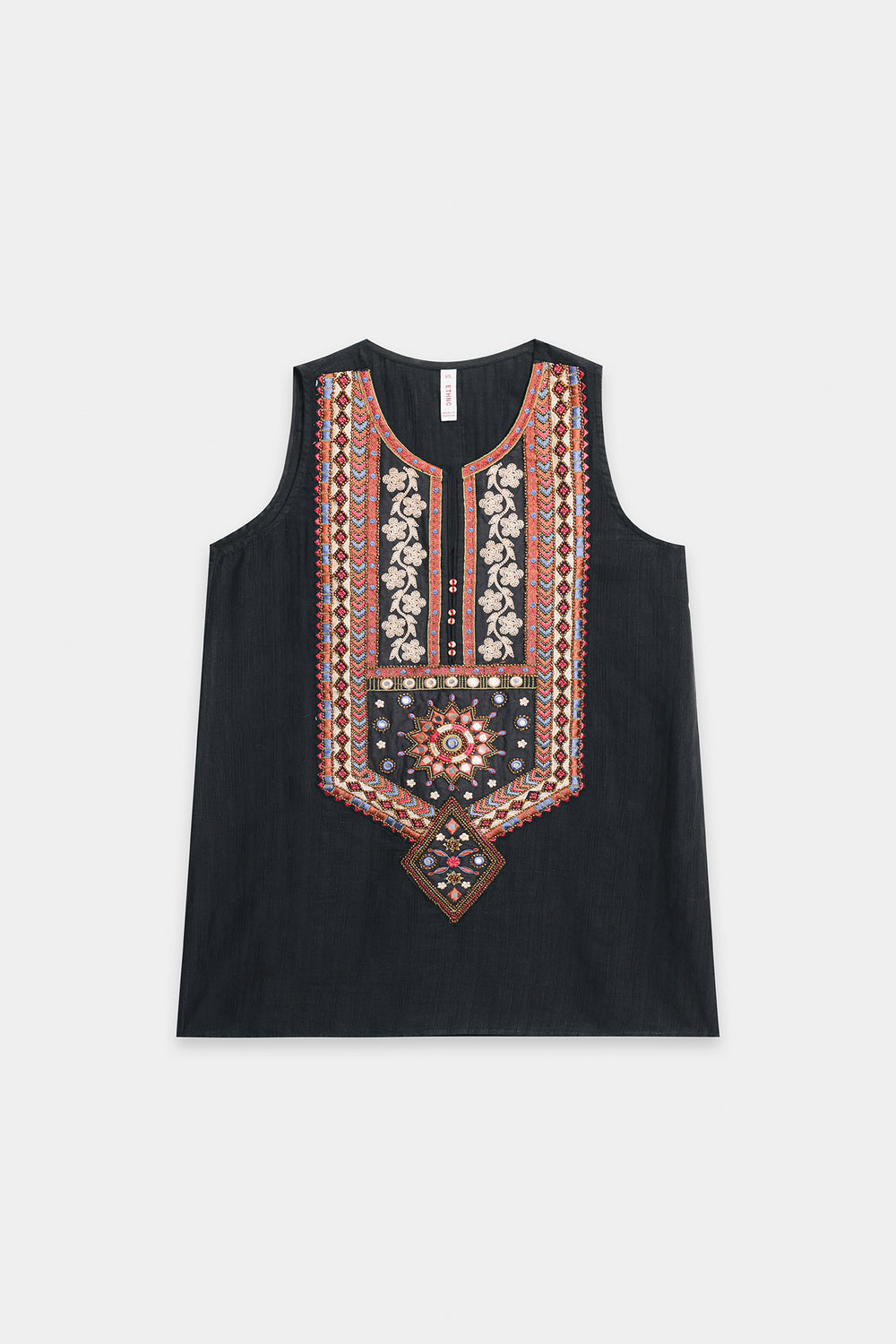 Bring an effortlessly bohemian edge to your wardrobe with this striking black embroidered kurti. This short, sleeveless kurti is crafted from a comfortable black fabric with a relaxed A-line silhouette. The yoke and chest are richly embellished with intricate, mirror work and bold multi-colored threadwork in geometric and folk-inspired patterns, incorporating accents of gold and silver. The contrast between the deep black base and the vibrant, textured embroidery makes this top a standout piece. Pair it with cream or white trousers for a perfectly balanced modern ethnic look.