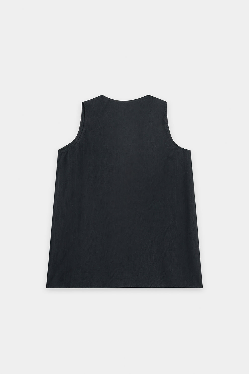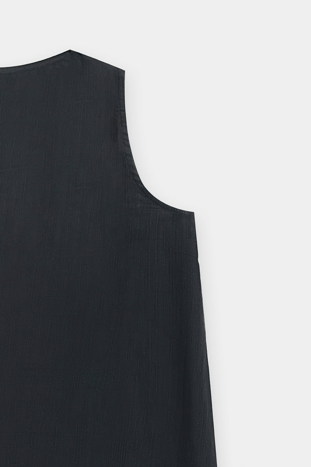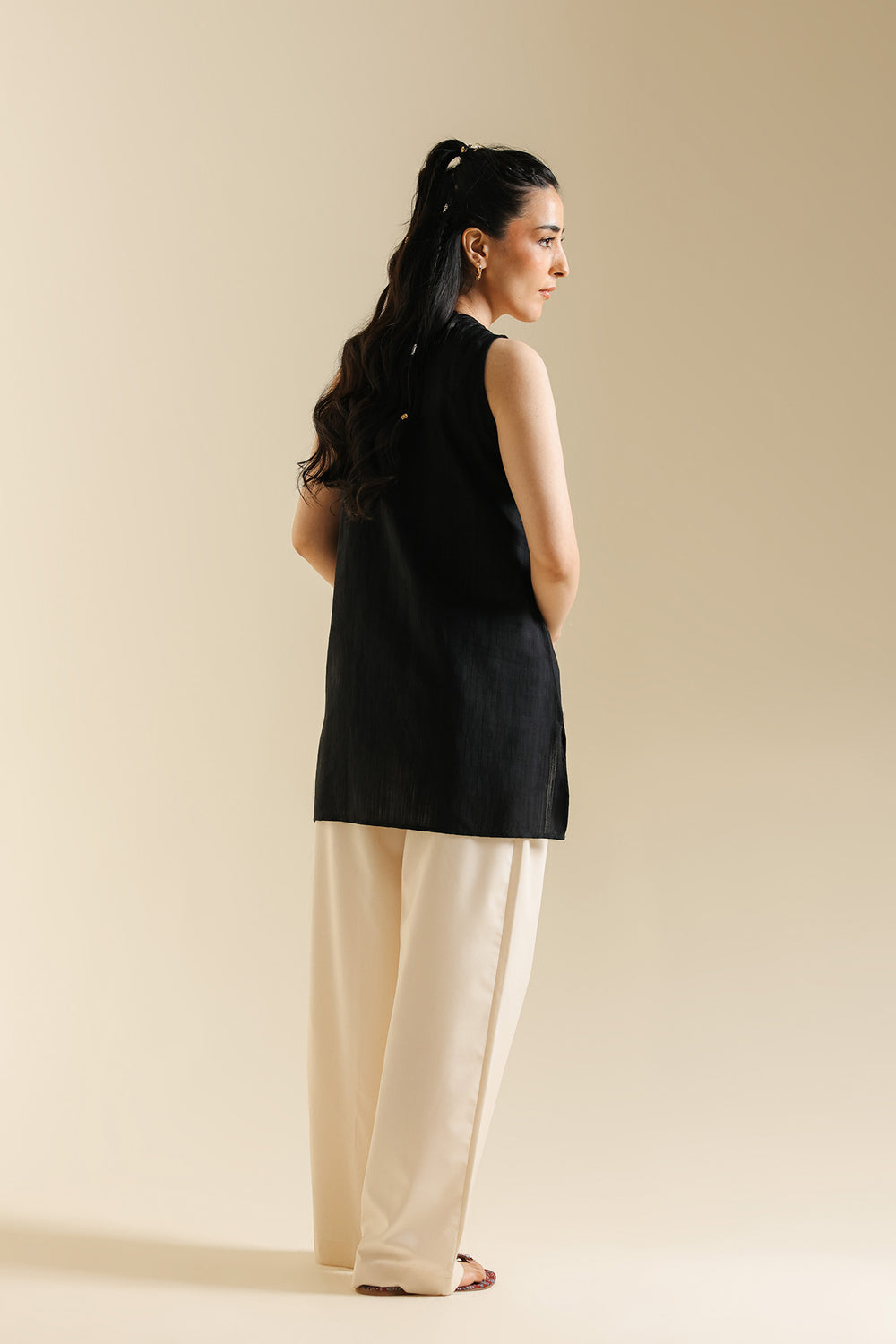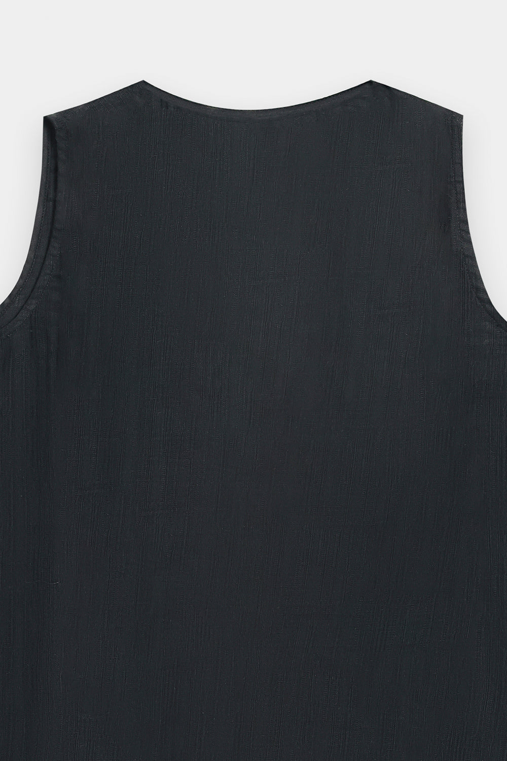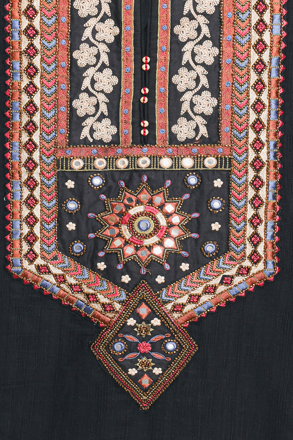 Bring an effortlessly bohemian edge to your wardrobe with this striking black embroidered kurti. This short, sleeveless kurti is crafted from a comfortable black fabric with a relaxed A-line silhouette. The yoke and chest are richly embellished with intricate, mirror work and bold multi-colored threadwork in geometric and folk-inspired patterns, incorporating accents of gold and silver. The contrast between the deep black base and the vibrant, textured embroidery makes this top a standout piece. Pair it with cream or white trousers for a perfectly balanced modern ethnic look.