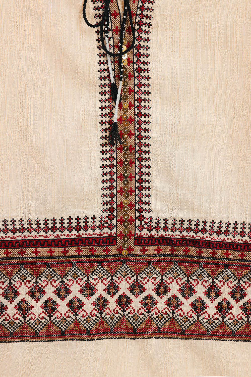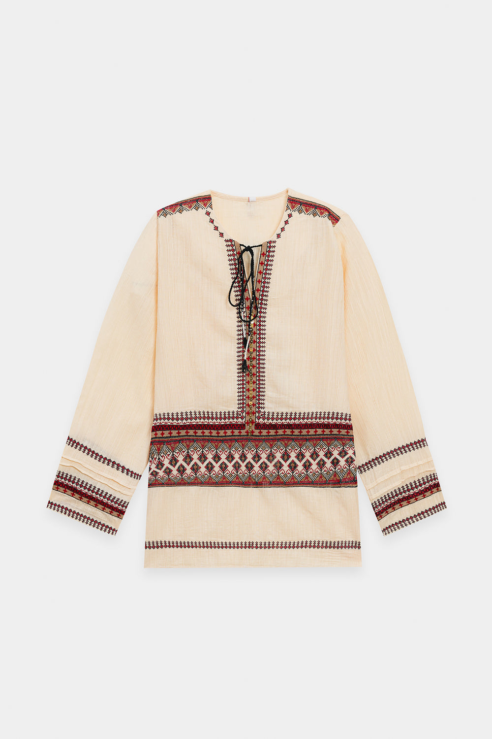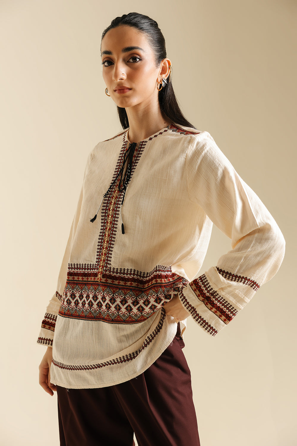 Inject an element of artisanal, bohemian flair into your look with this captivating cream kurti. This short, relaxed-fit kurti is crafted from a subtly textured, off-white fabric. It is striking due to its detailed embroidered banding in rich shades of maroon, deep orange, and black that adorns the yoke and cuffs of the long sleeves. The neckline features a charming drawstring and tassel detail. Shown paired with relaxed, dark-brown trousers, this kurti is a perfect piece for creating an effortlessly chic and grounded ensemble.