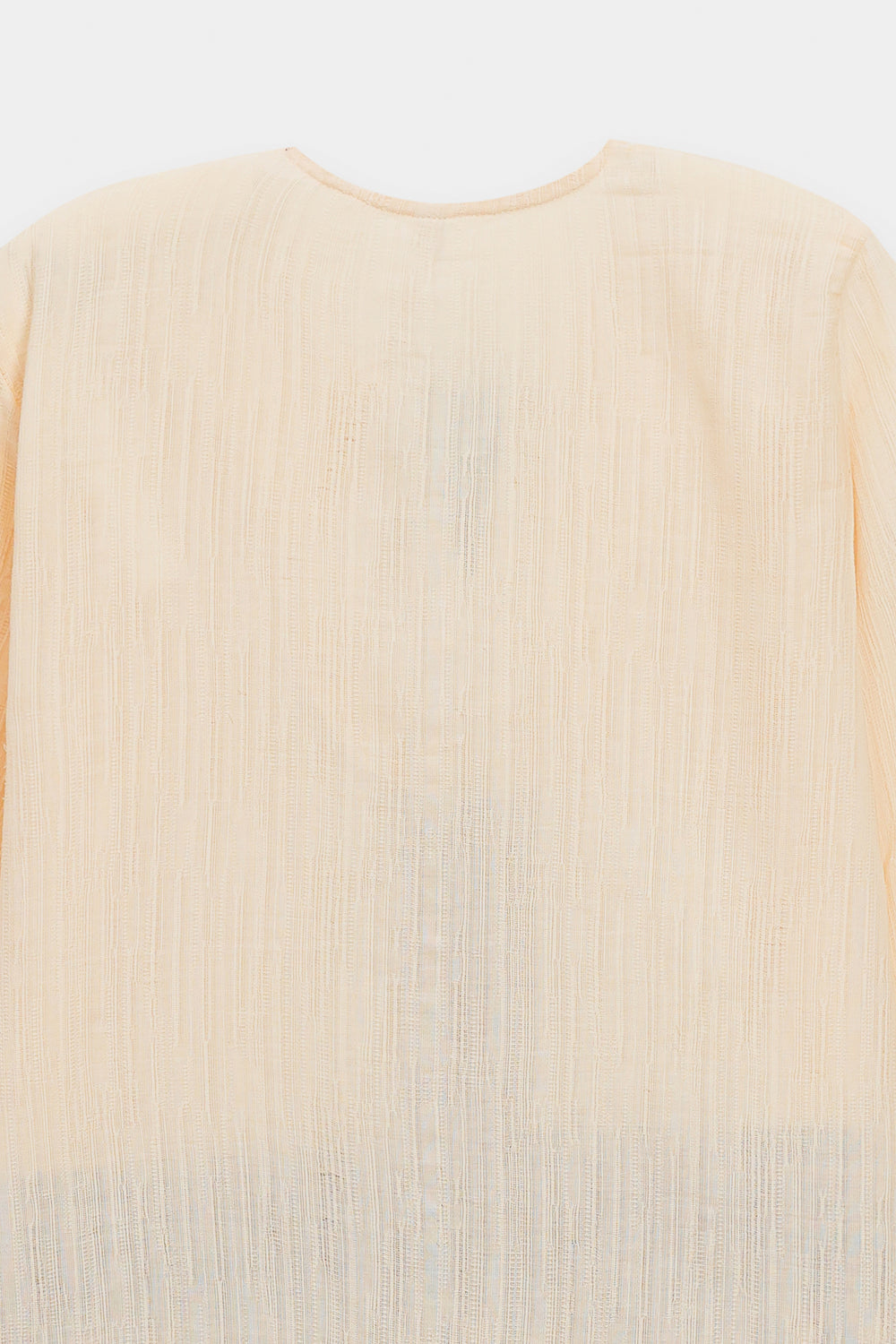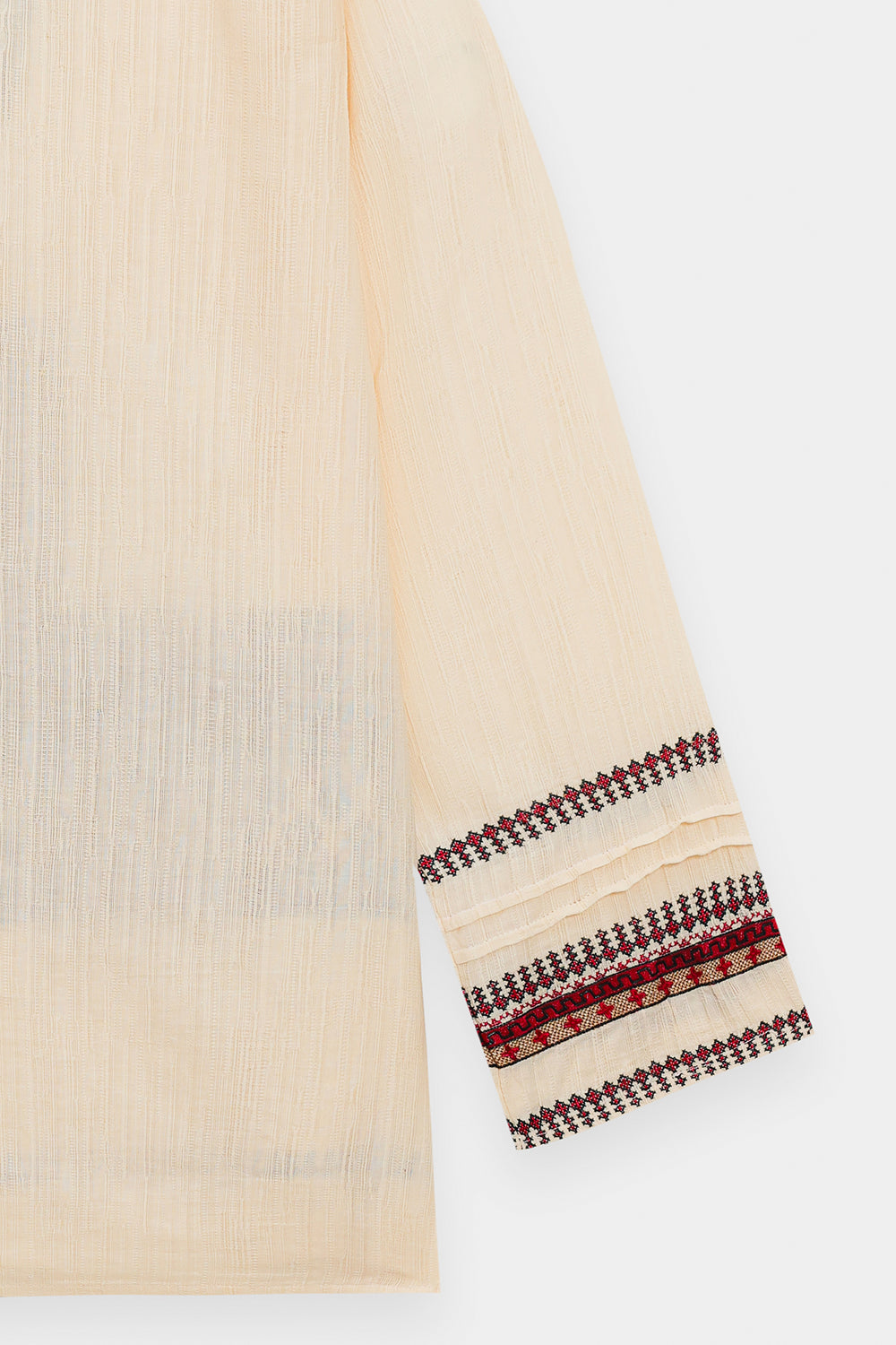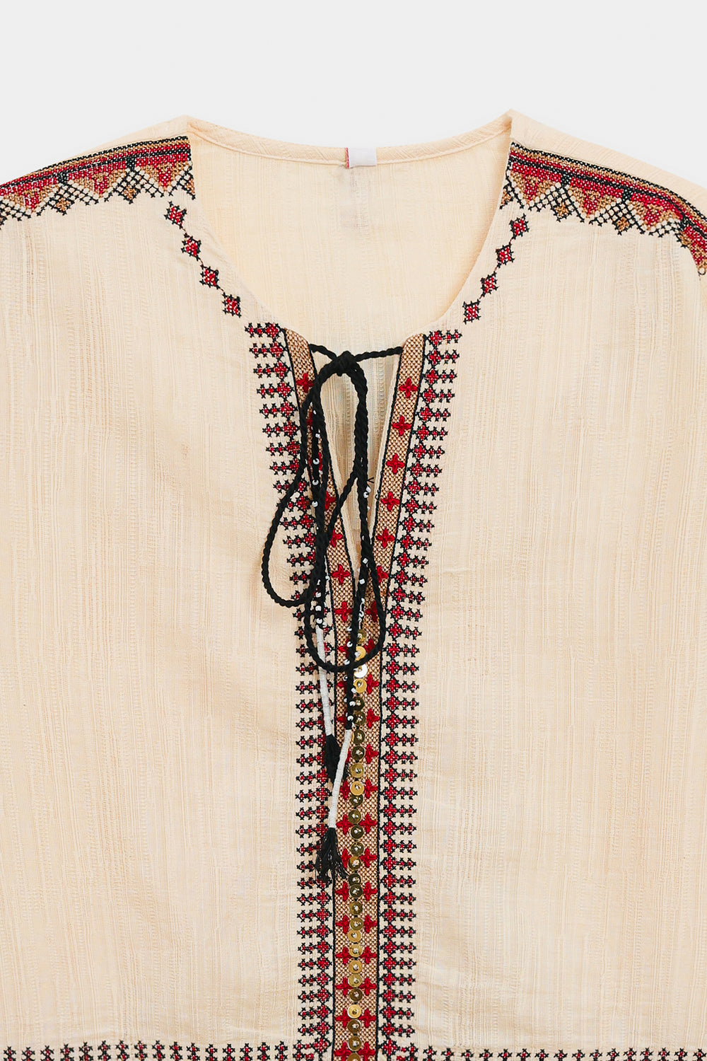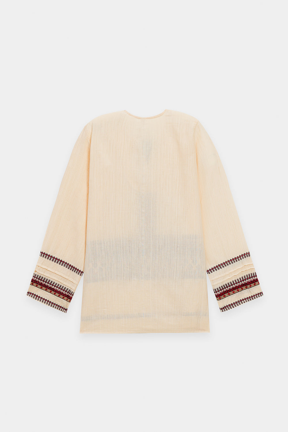Inject an element of artisanal, bohemian flair into your look with this captivating cream kurti. This short, relaxed-fit kurti is crafted from a subtly textured, off-white fabric. It is striking due to its detailed embroidered banding in rich shades of maroon, deep orange, and black that adorns the yoke and cuffs of the long sleeves. The neckline features a charming drawstring and tassel detail. Shown paired with relaxed, dark-brown trousers, this kurti is a perfect piece for creating an effortlessly chic and grounded ensemble.