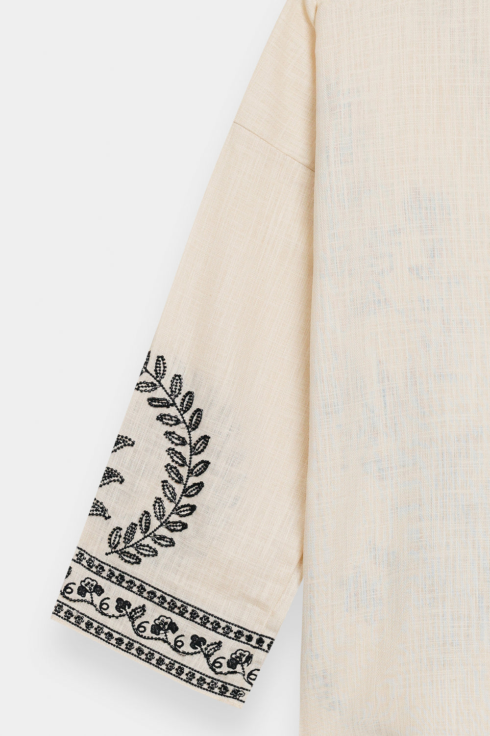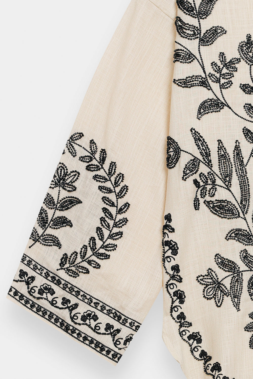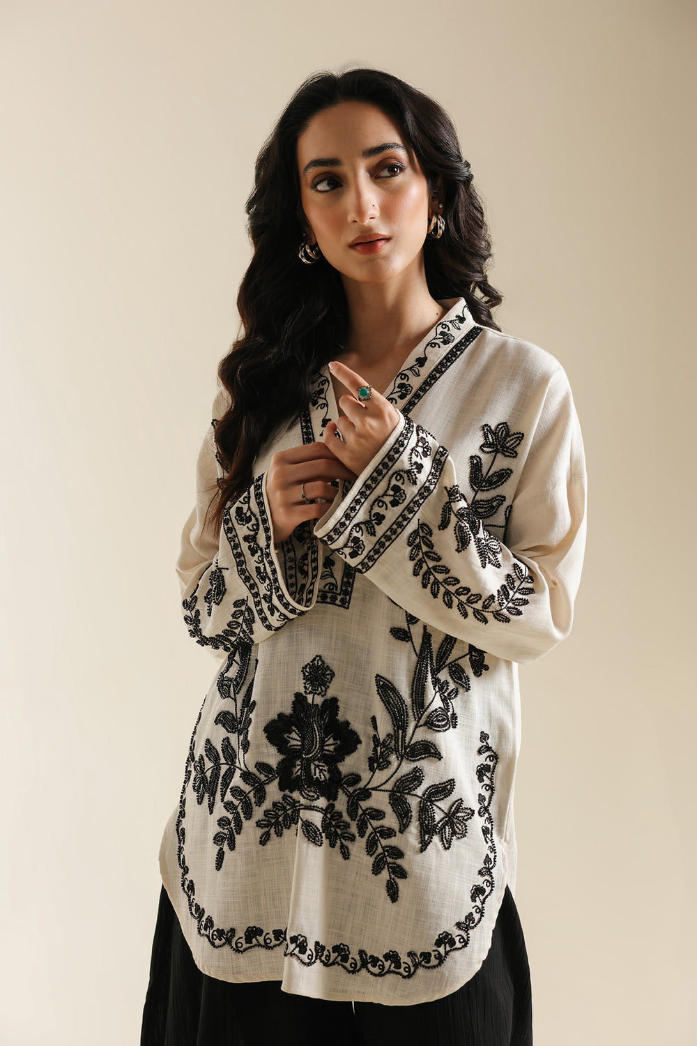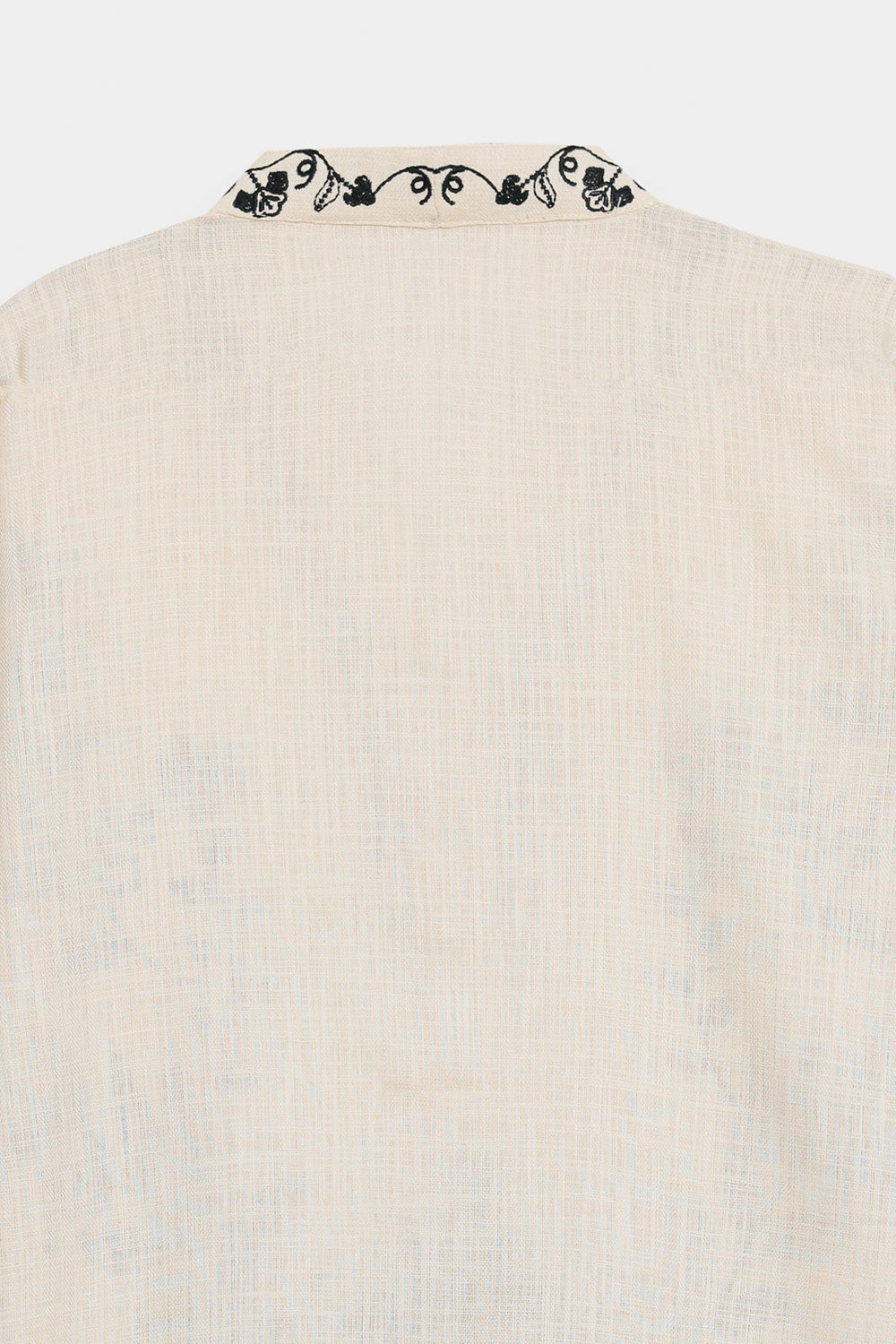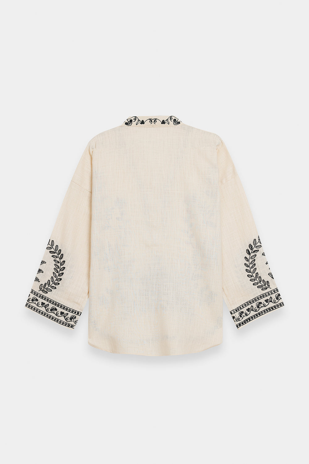 This sophisticated cream-colored shirt is a masterclass in monochromatic contrast, blending artisanal heritage with a contemporary, relaxed silhouette. The ivory-toned base provides a serene canvas for the bold black embroidery that adorns the V-neckline, bodice, and cuffs in intricate floral and botanical motifs. Designed with slightly flared sleeves and a round hemline, the piece offers a fluid movement that transitions effortlessly from day to evening. Its detailed threadwork is complemented by a structured placket, making it an ideal choice for pairing with flowing wide-leg trousers for a look that is both grounded and profoundly chic.
