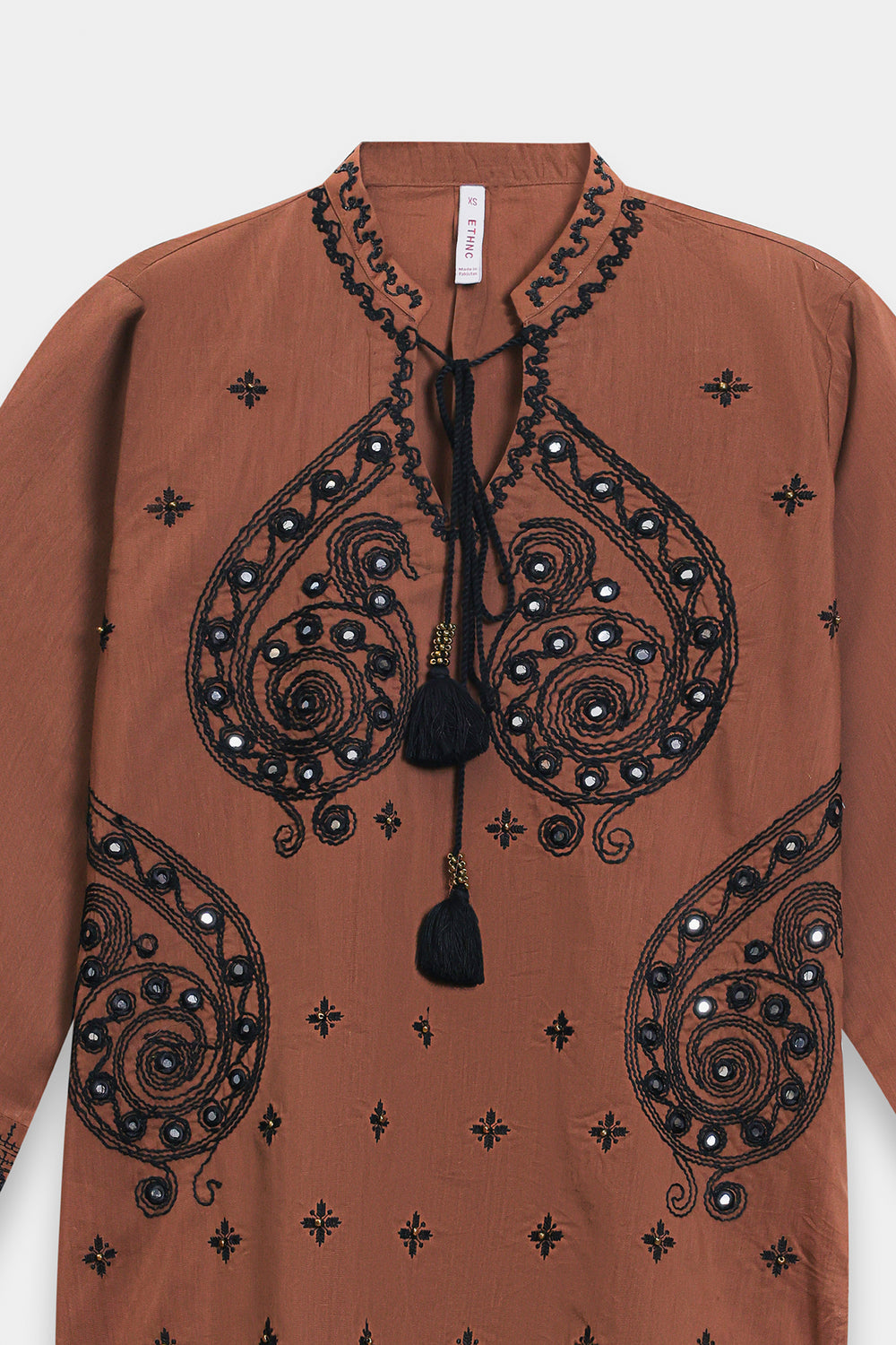 Embrace a fusion of rustic charm and sophisticated detail in this earth-toned brown shirt. The design features a modern split neckline with a delicate tie-front tassel, serving as a focal point for the striking black cord embroidery. The bodice is adorned with intricate swirling motifs, meticulously accented with shimmering mirror-work that catches the light. Small, geometric embroidered stars are scattered across the front, while the sleeves and hemline are finished with a bold, dark-patterned border. Pair it with sleek black trouser to complete the contemporary yet culturally rooted look.