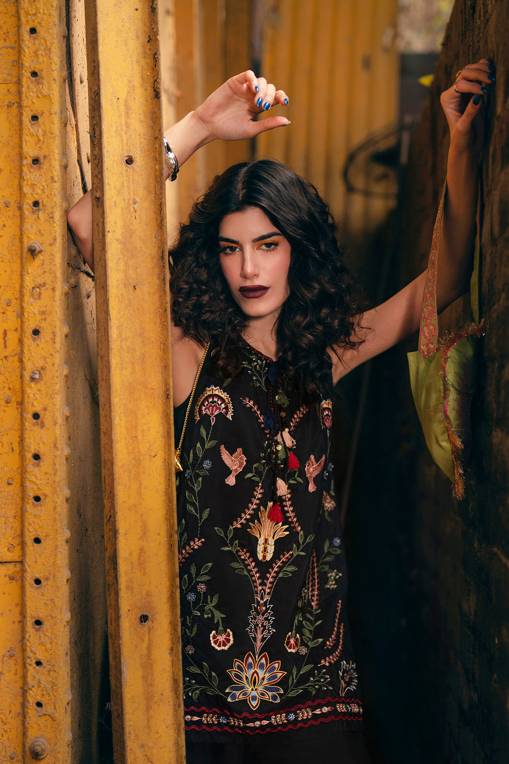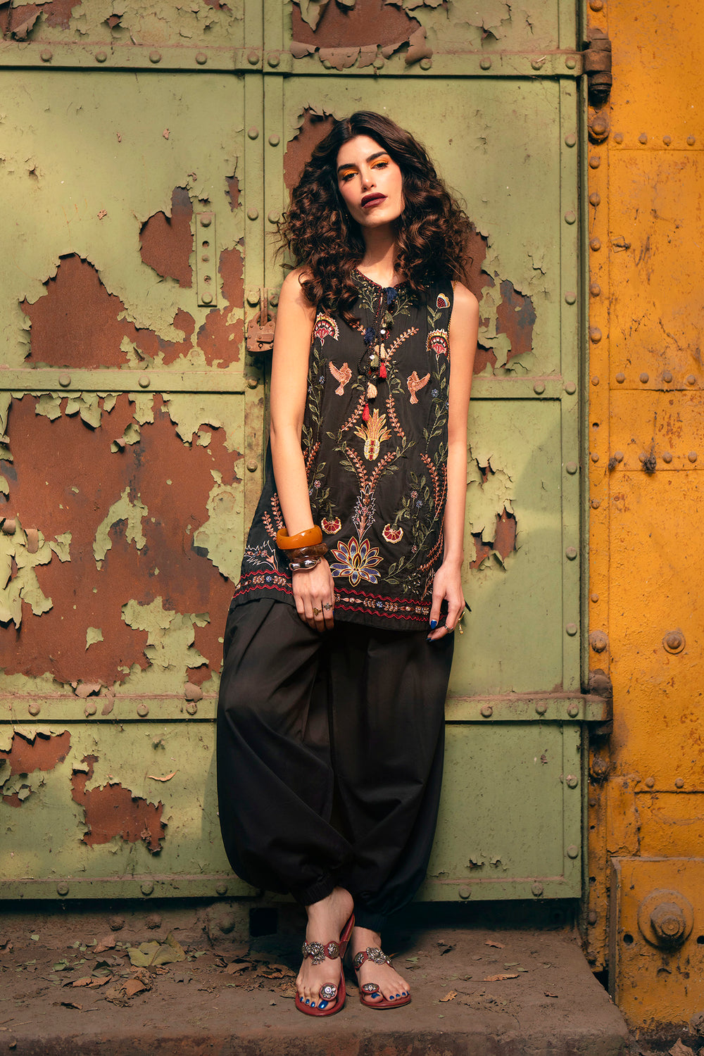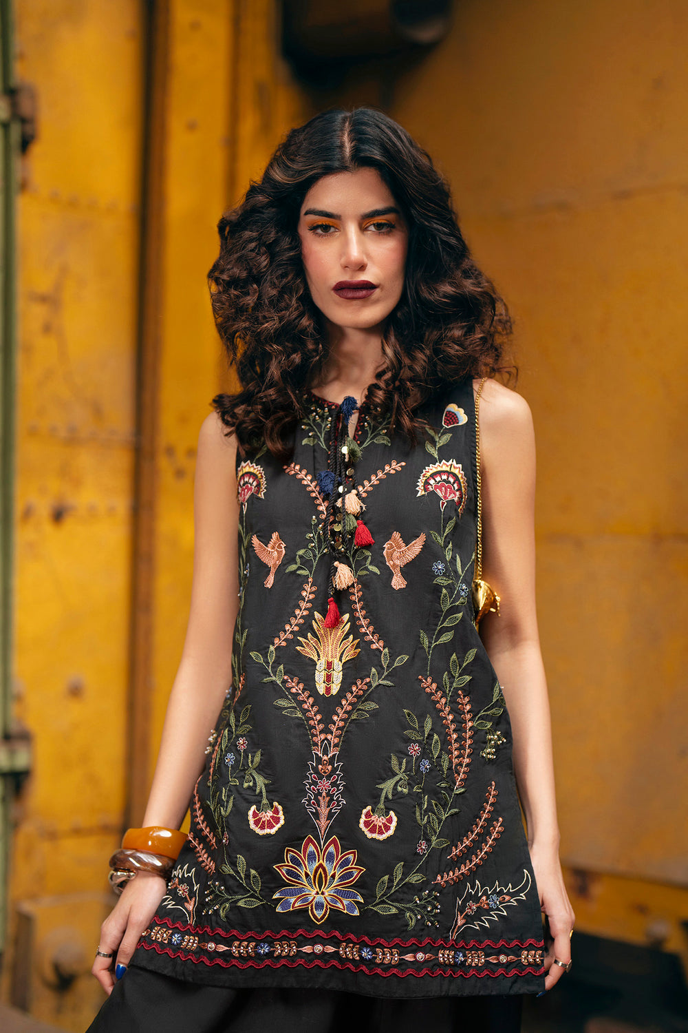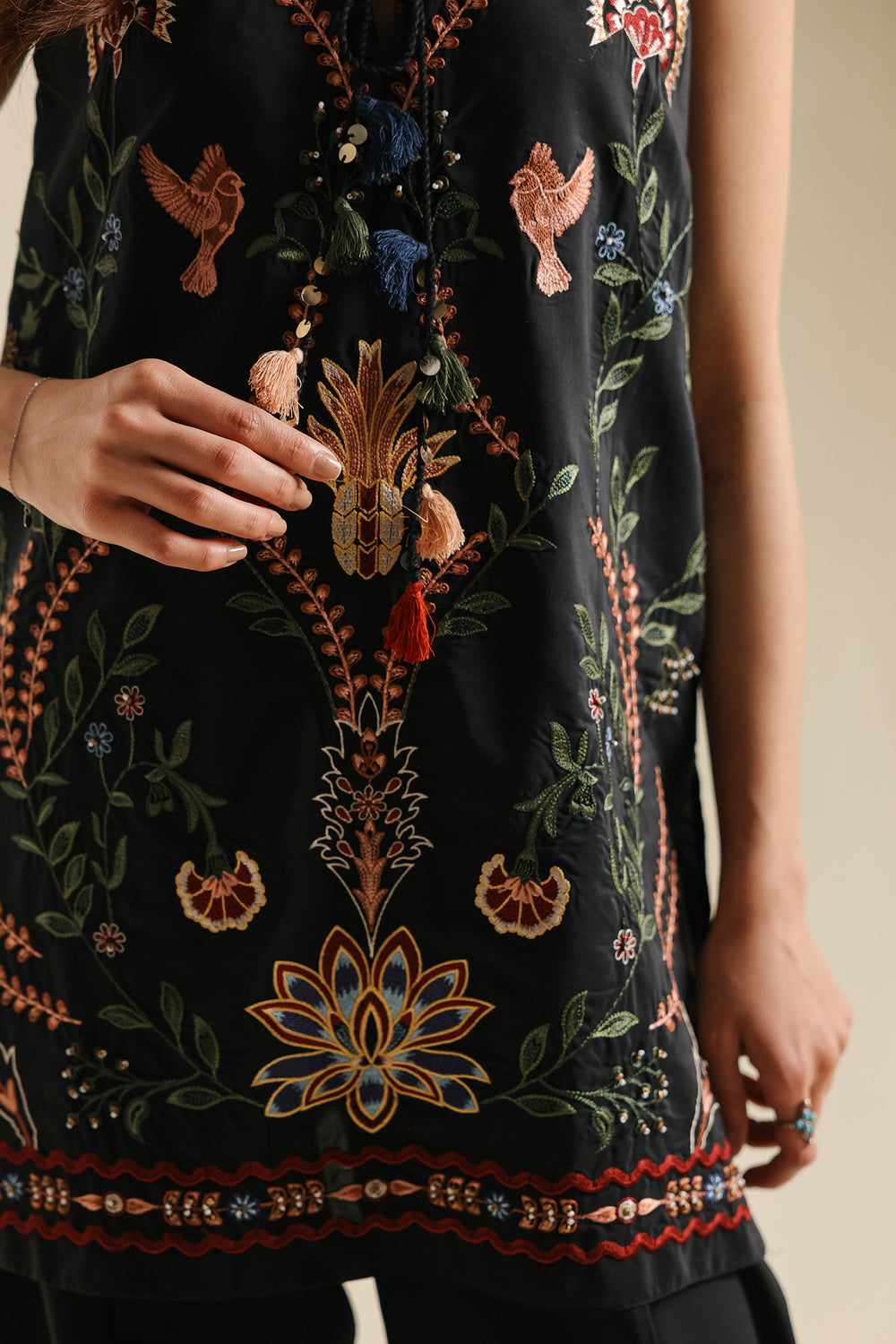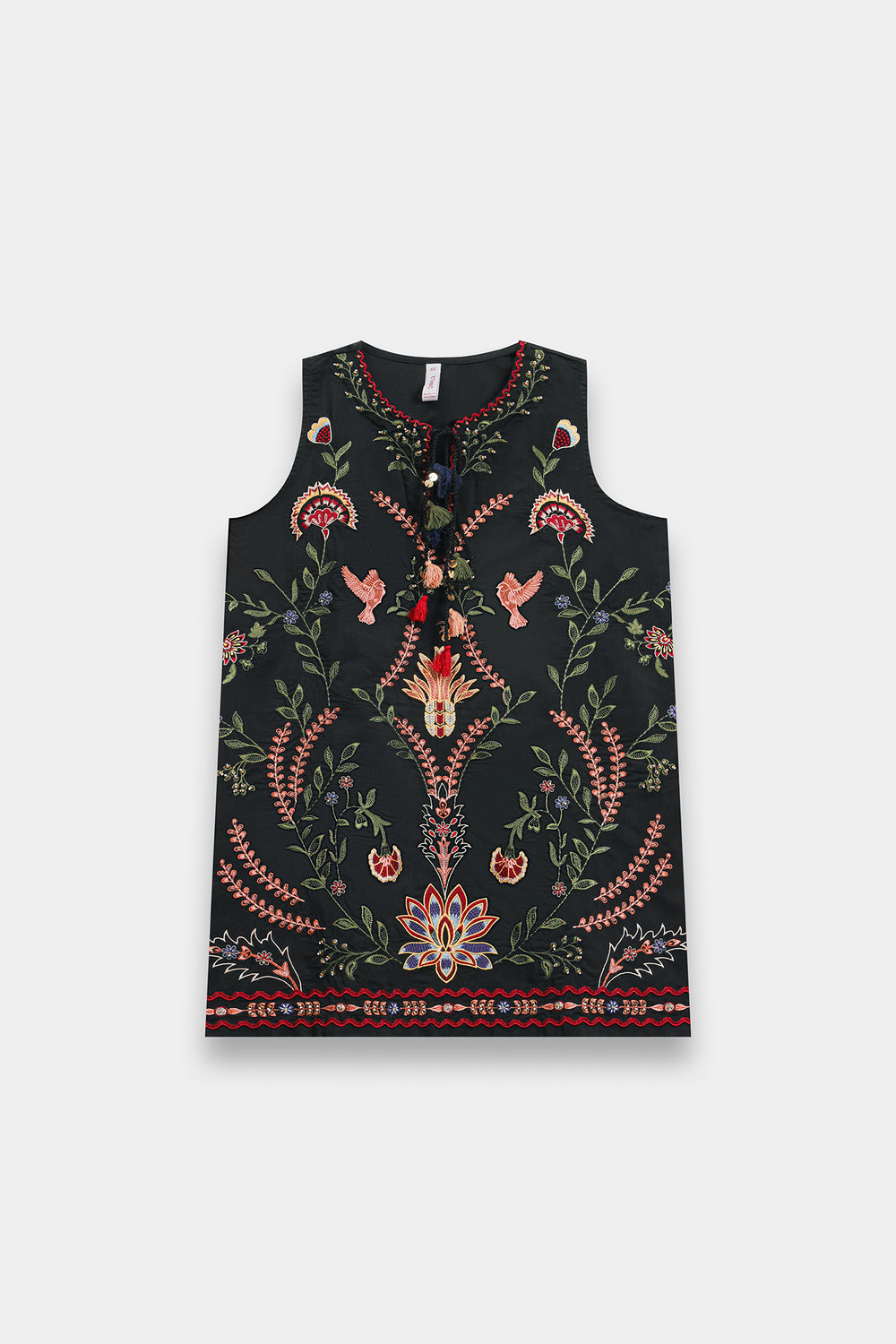 Make a whimsical and artistic statement in this sleeveless black embroidered shirt, featuring a nature-inspired tapestry. The piece is designed with a delicate round neckline and a split front accented by colorful tassels and beadwork. The shirt is lavishly adorned with intricate embroidery, showcasing playful birds in soft pink, blooming lotuses, and trailing floral vines in shades of terracotta and teal. Finished with a vibrant, multi-layered embroidered border at the hem, this shirt offers a perfect blend of modern silhouette and traditional craftsmanship.