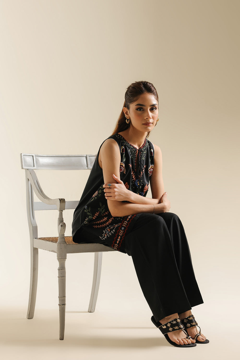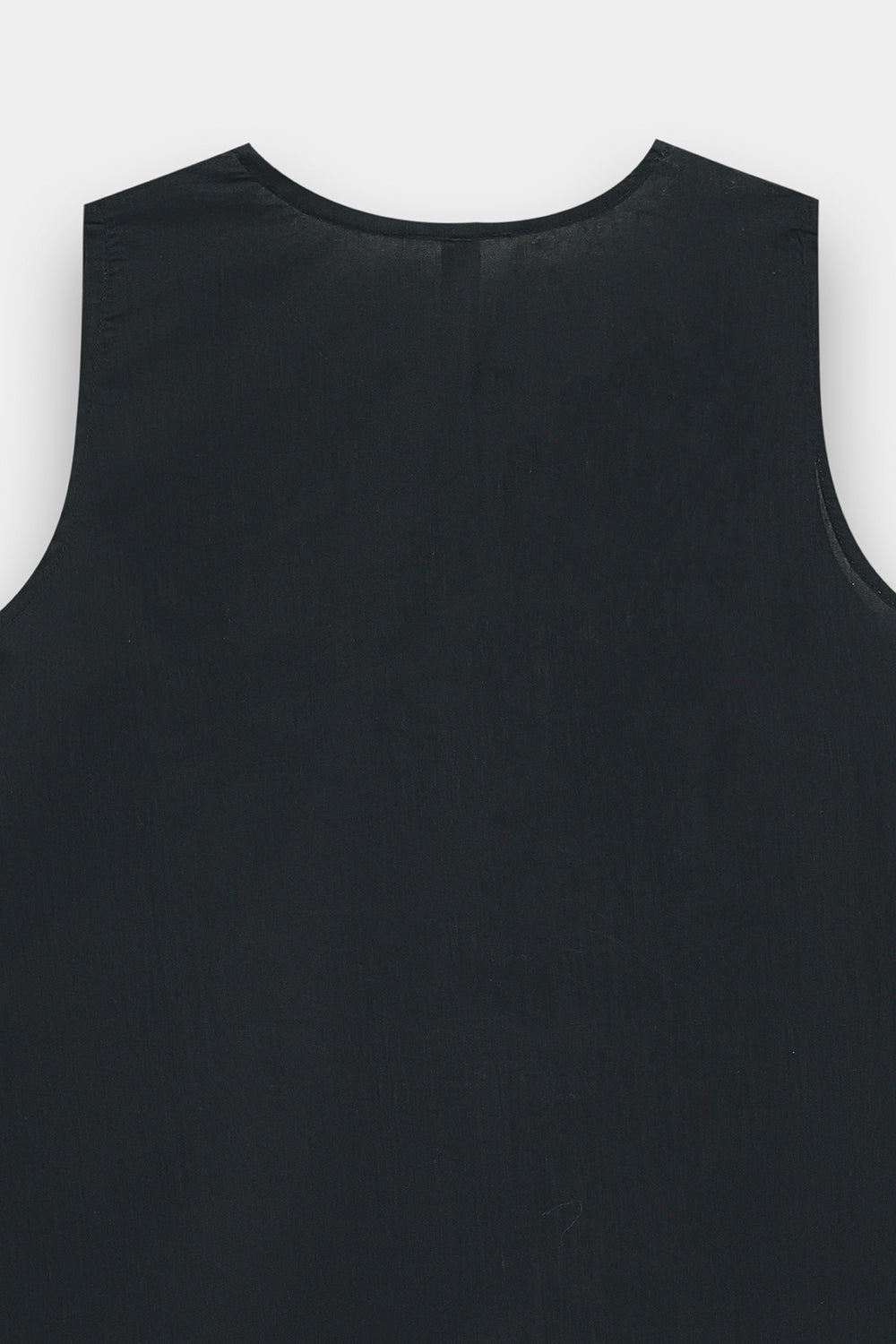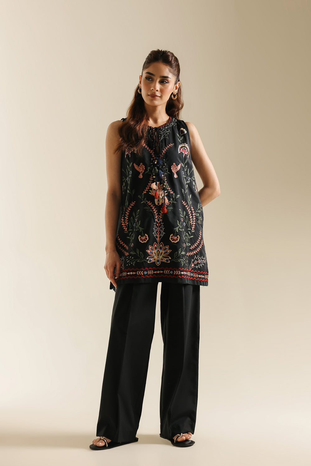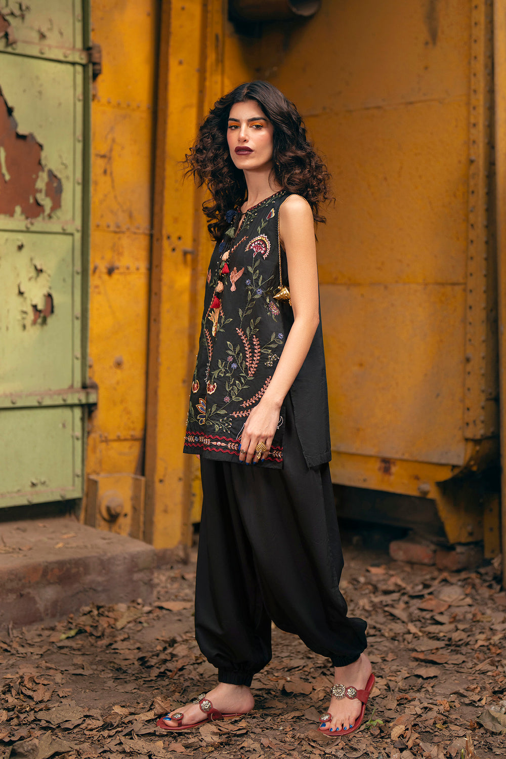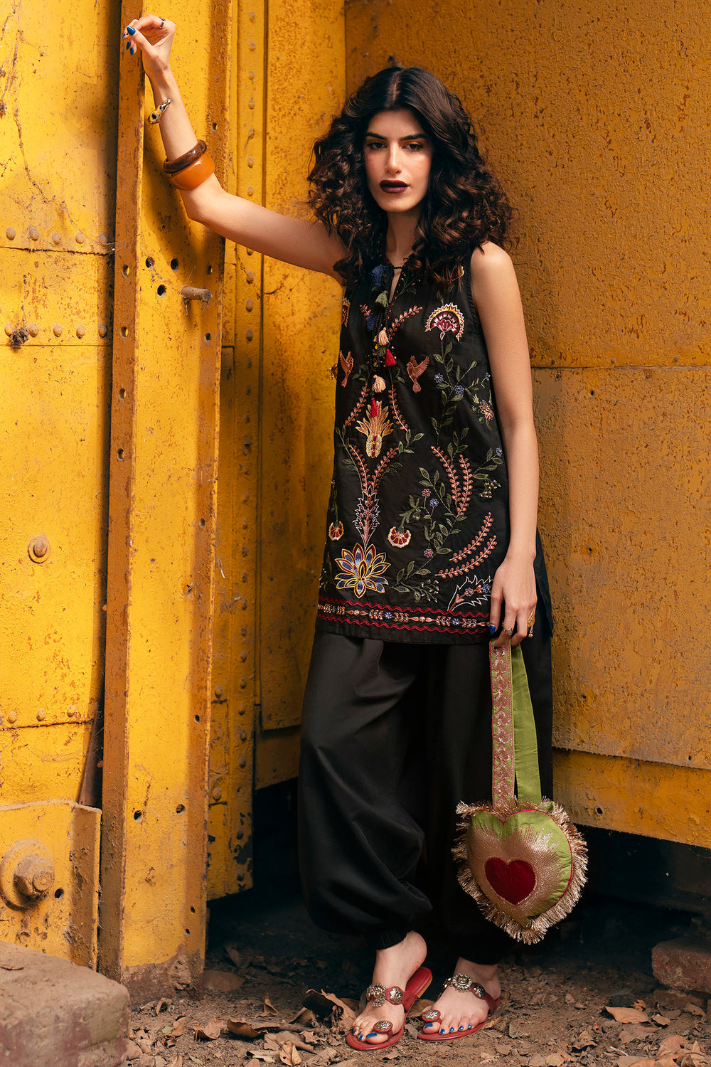 Make a whimsical and artistic statement in this sleeveless black embroidered shirt, featuring a nature-inspired tapestry. The piece is designed with a delicate round neckline and a split front accented by colorful tassels and beadwork. The shirt is lavishly adorned with intricate embroidery, showcasing playful birds in soft pink, blooming lotuses, and trailing floral vines in shades of terracotta and teal. Finished with a vibrant, multi-layered embroidered border at the hem, this shirt offers a perfect blend of modern silhouette and traditional craftsmanship.