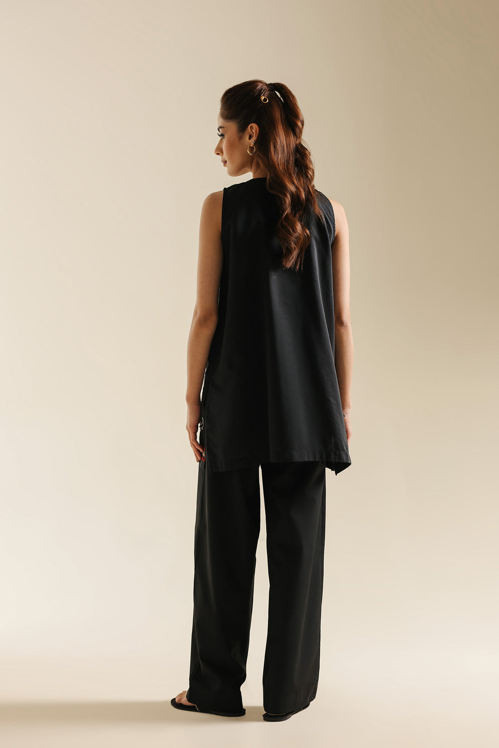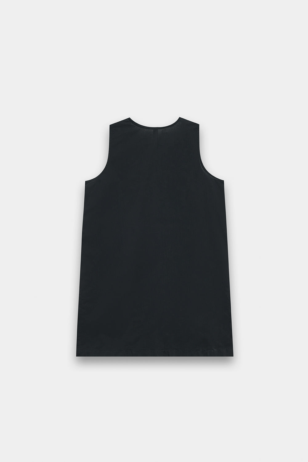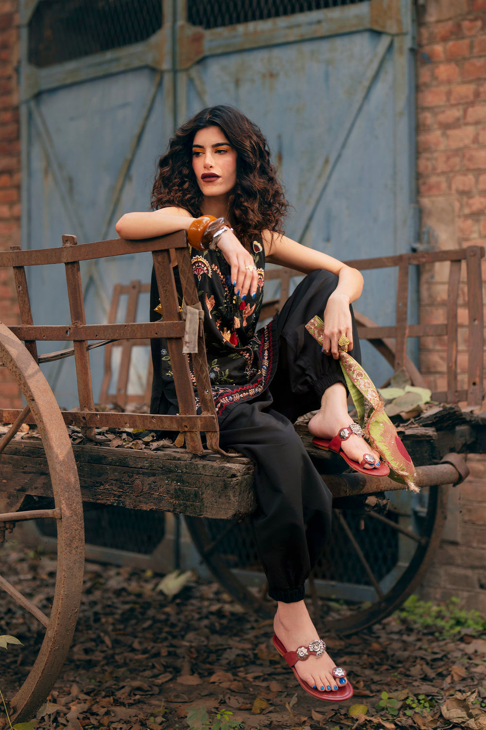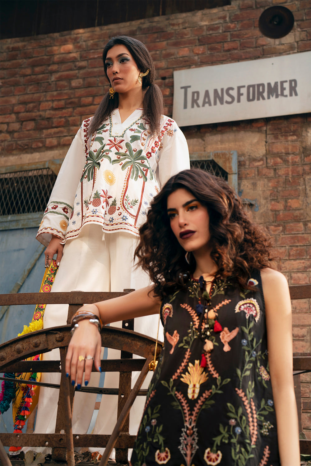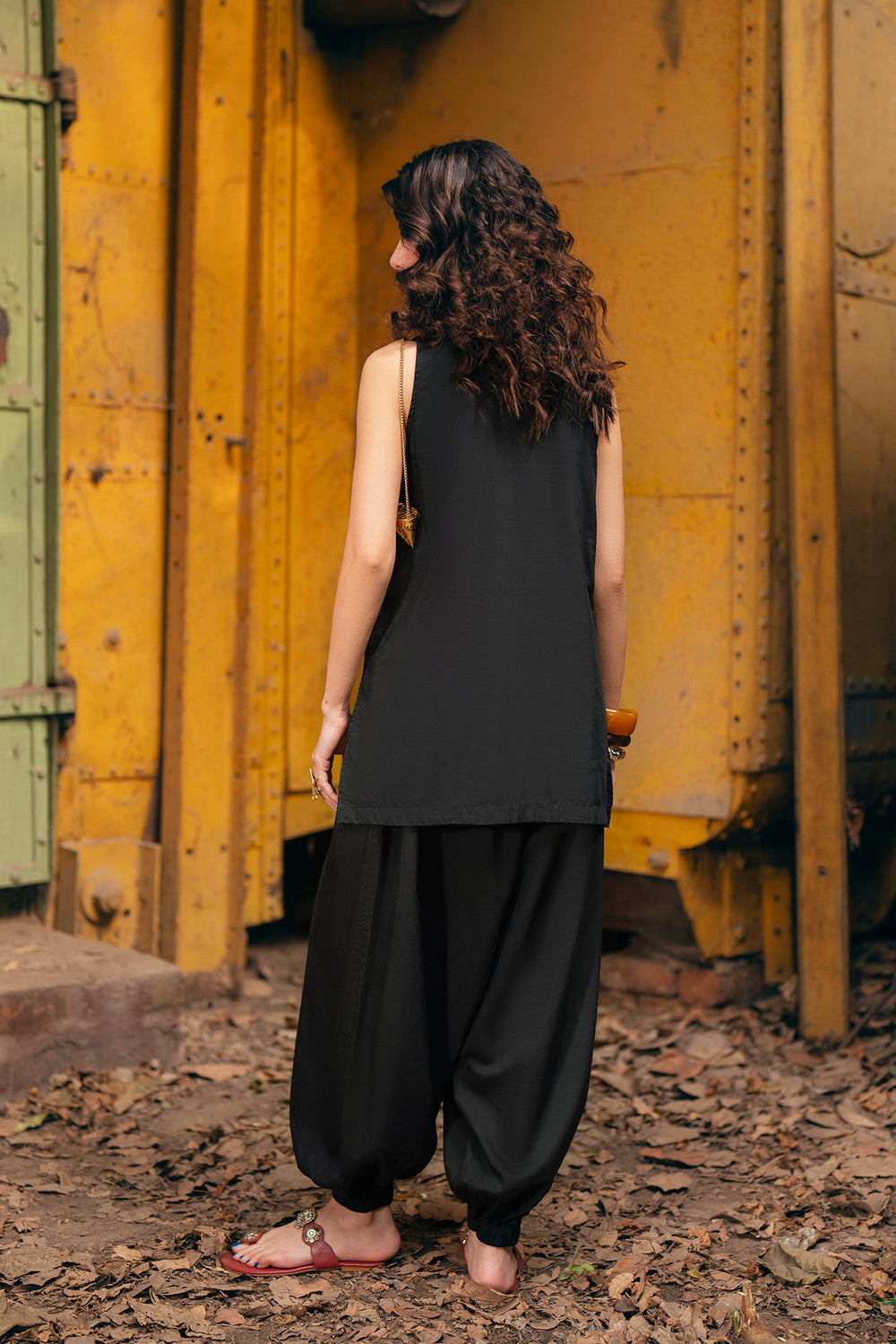 Make a whimsical and artistic statement in this sleeveless black embroidered shirt, featuring a nature-inspired tapestry. The piece is designed with a delicate round neckline and a split front accented by colorful tassels and beadwork. The shirt is lavishly adorned with intricate embroidery, showcasing playful birds in soft pink, blooming lotuses, and trailing floral vines in shades of terracotta and teal. Finished with a vibrant, multi-layered embroidered border at the hem, this shirt offers a perfect blend of modern silhouette and traditional craftsmanship.
