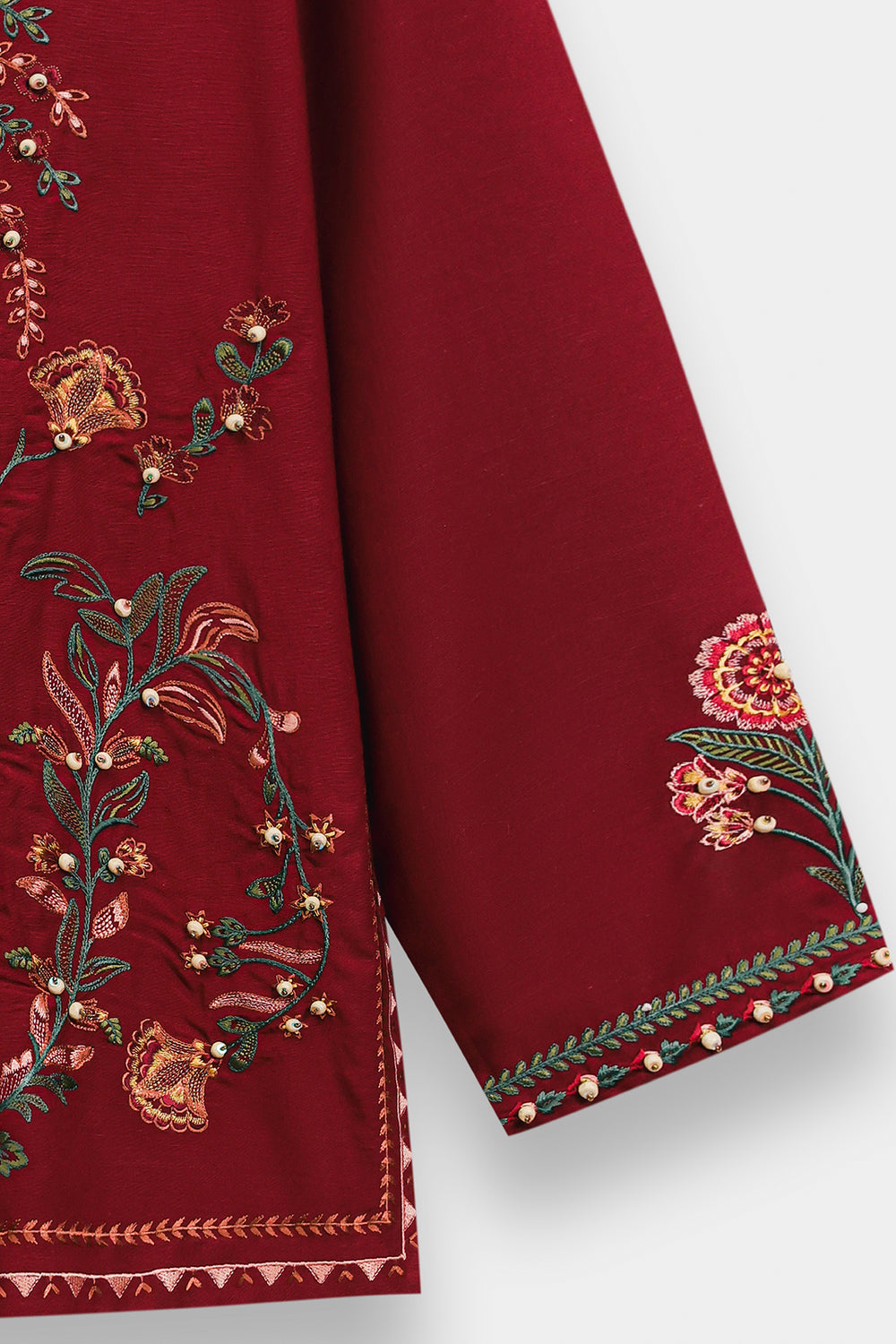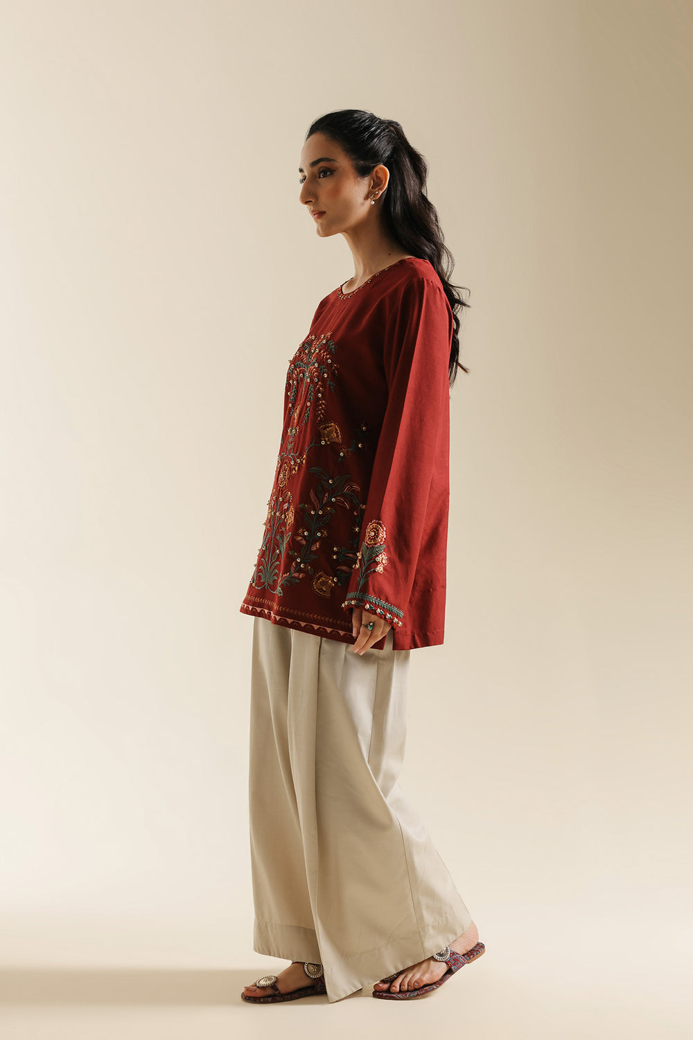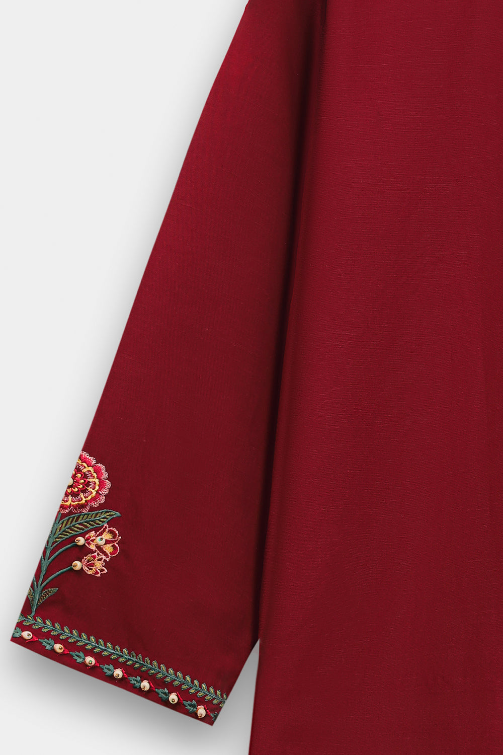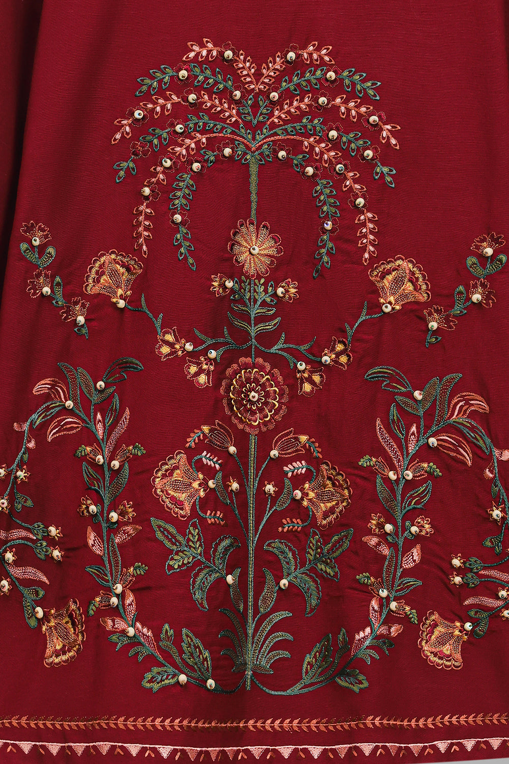 Make a sophisticated statement in this rich maroon embroidered shirt, featuring a classic straight silhouette. The piece is designed with a simple round neckline and is adorned with an intricate, nature-inspired embroidery layout in forest green, terracotta, and gold. The central motif features stylized floral vines and blooming patterns, further elevated by delicate pearl-like embellishments scattered across the design. Matching embroidered details grace the cuffs, while the shirt is paired with fluid, wide-leg beige trouser for a perfectly balanced and elegant ensemble.