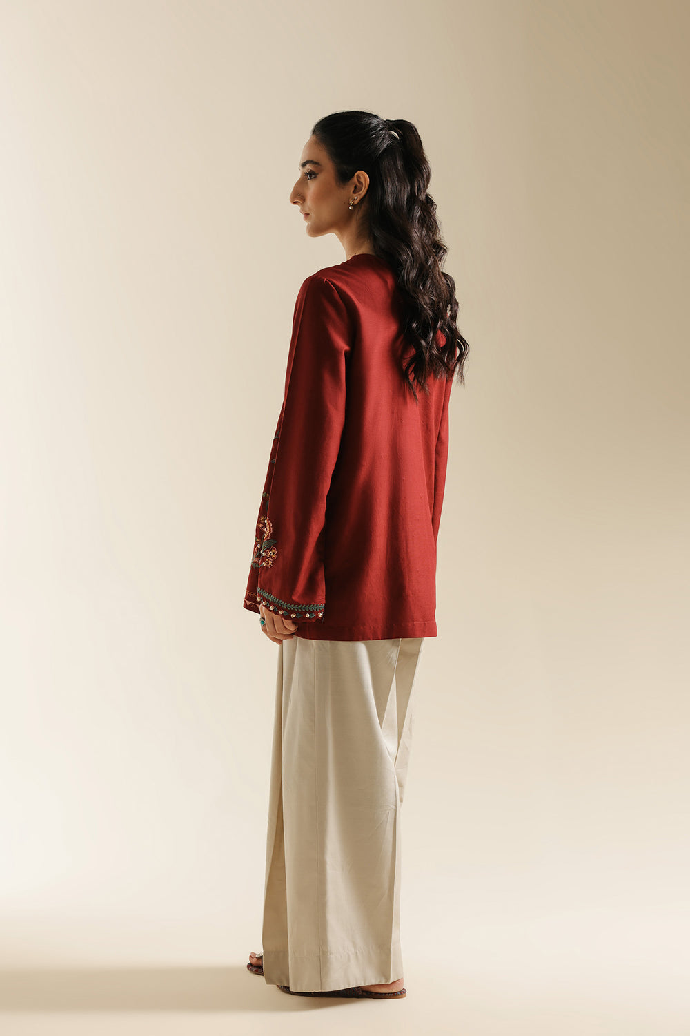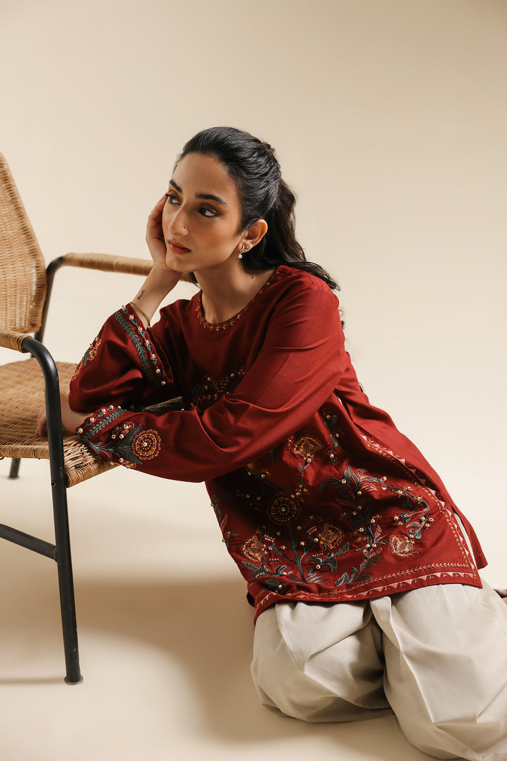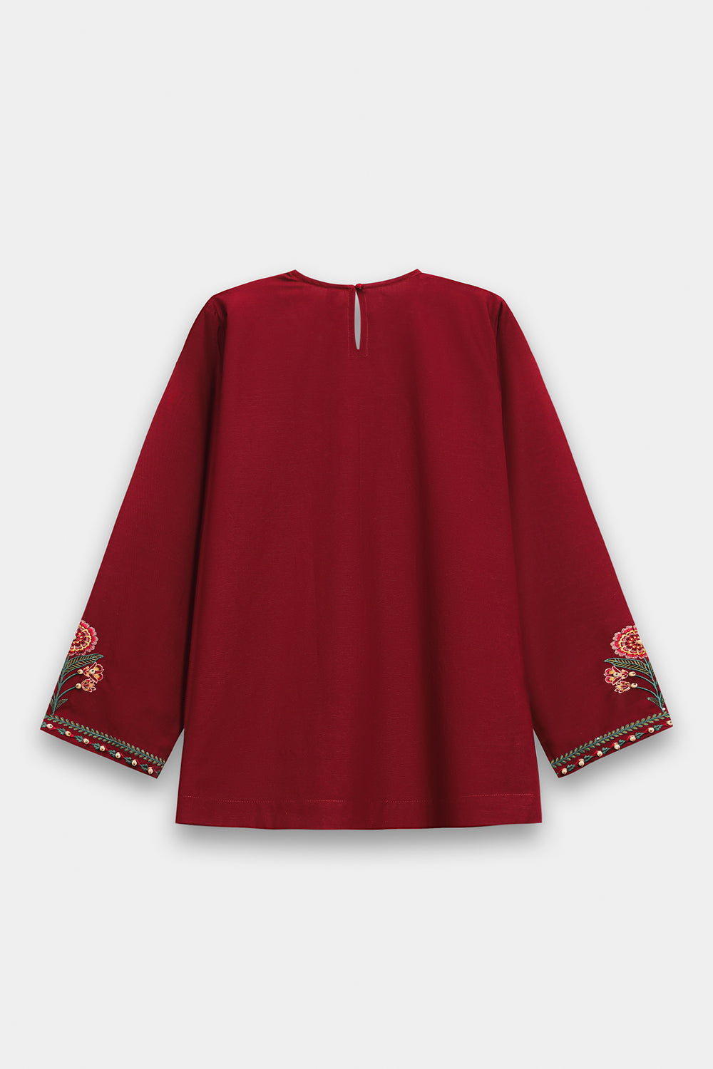 Make a sophisticated statement in this rich maroon embroidered shirt, featuring a classic straight silhouette. The piece is designed with a simple round neckline and is adorned with an intricate, nature-inspired embroidery layout in forest green, terracotta, and gold. The central motif features stylized floral vines and blooming patterns, further elevated by delicate pearl-like embellishments scattered across the design. Matching embroidered details grace the cuffs, while the shirt is paired with fluid, wide-leg beige trouser for a perfectly balanced and elegant ensemble.