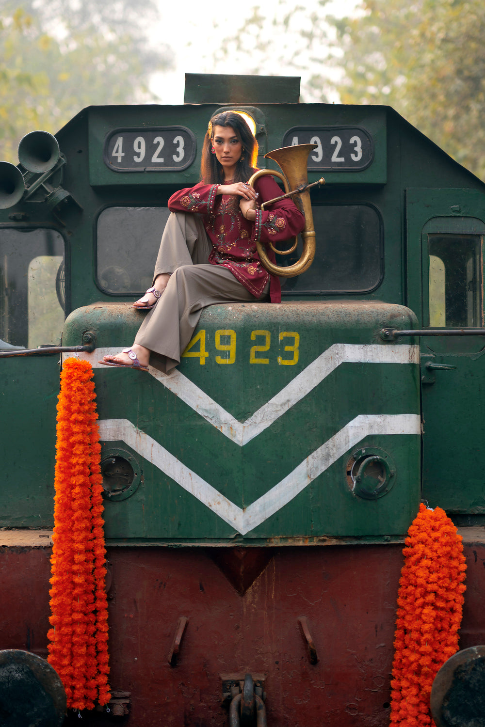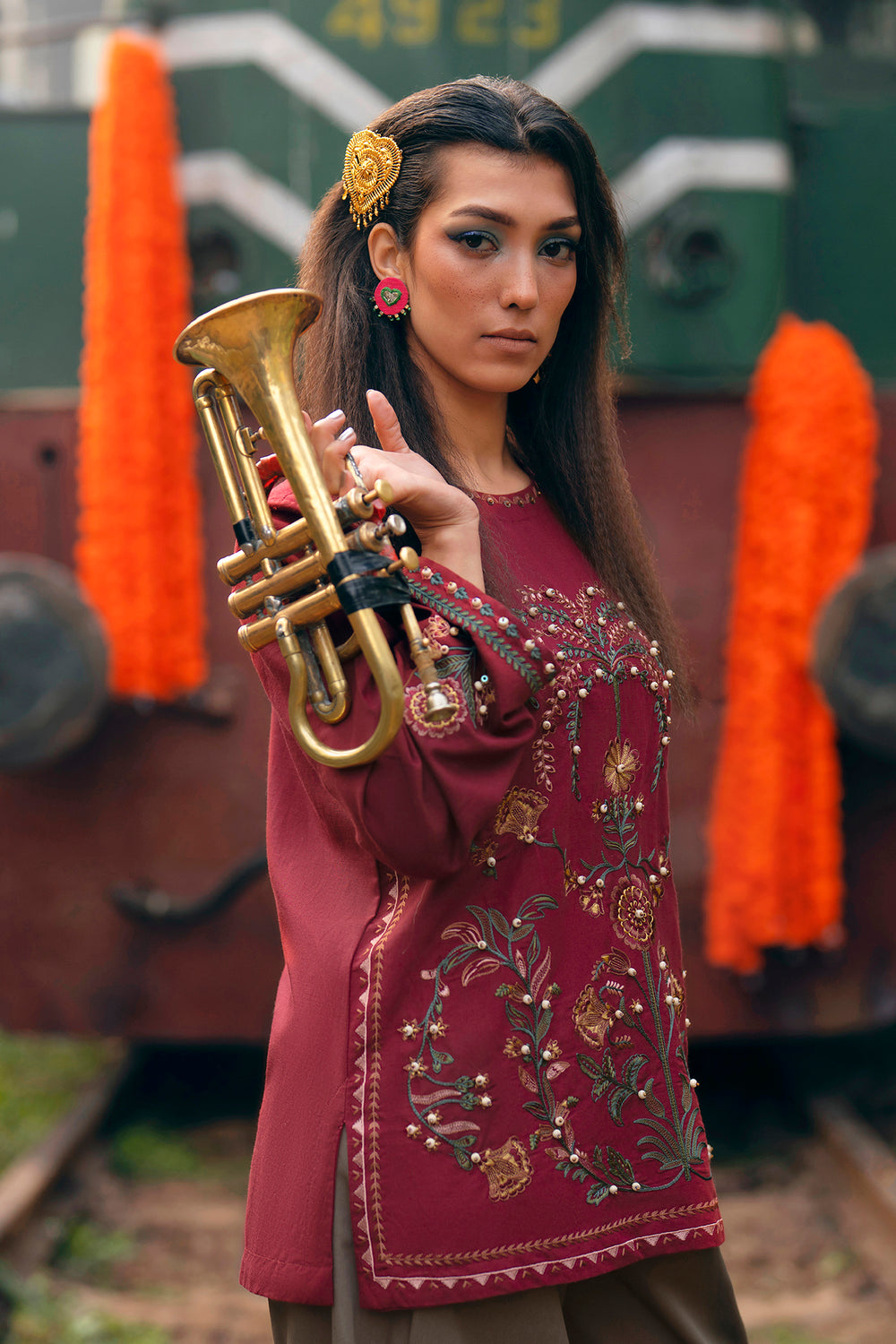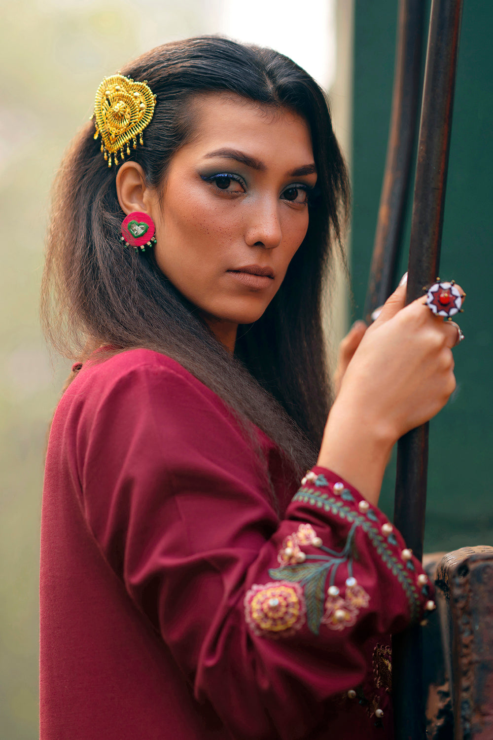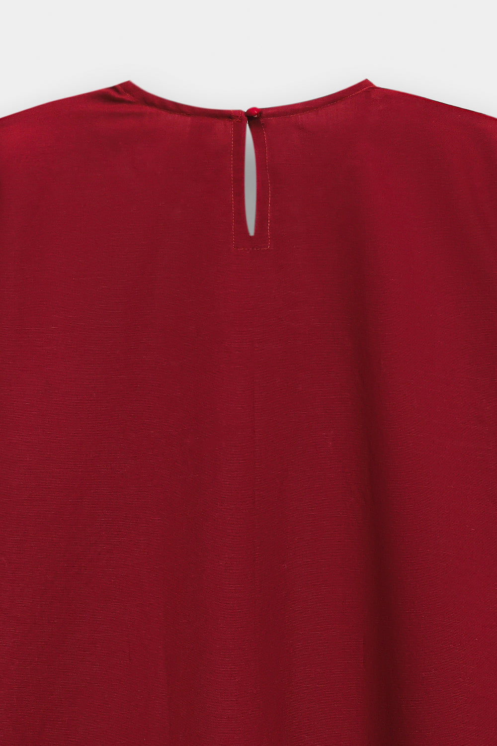 Make a sophisticated statement in this rich maroon embroidered shirt, featuring a classic straight silhouette. The piece is designed with a simple round neckline and is adorned with an intricate, nature-inspired embroidery layout in forest green, terracotta, and gold. The central motif features stylized floral vines and blooming patterns, further elevated by delicate pearl-like embellishments scattered across the design. Matching embroidered details grace the cuffs, while the shirt is paired with fluid, wide-leg beige trouser for a perfectly balanced and elegant ensemble.