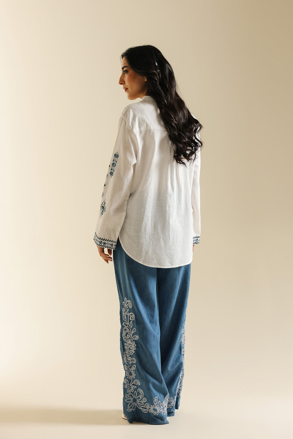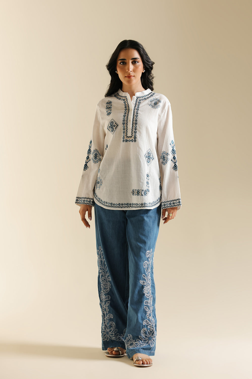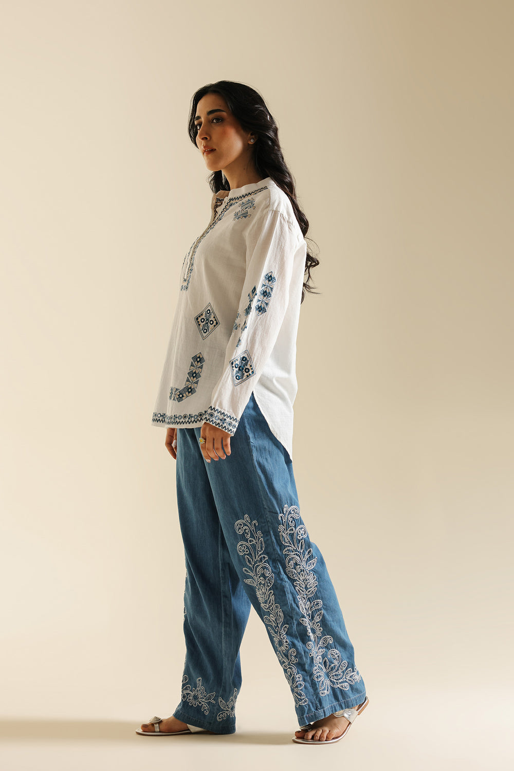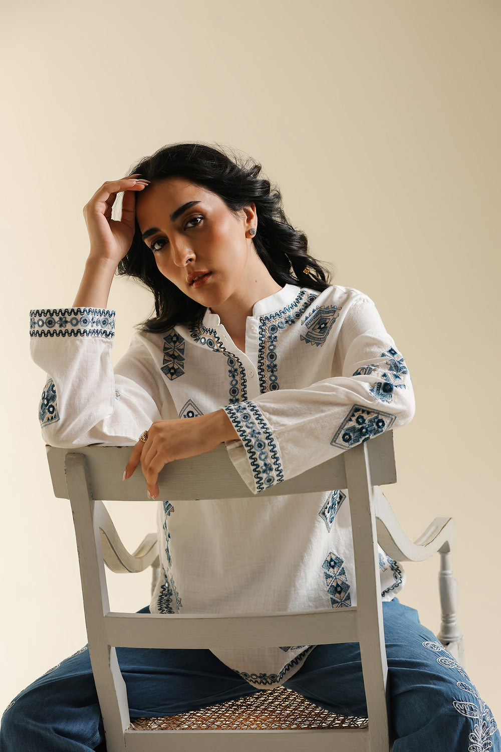 Bring an effortless, artisanal charm to your casual wardrobe with this crisp white embroidered shirt. This straight-cut kurti is made from a breathable white fabric and features beautiful, intricate blue thread embroidery in a traditional geometric pattern across the yoke, neckline, and full-length sleeves. The contrasting blue embroidery creates a striking visual appeal against the clean white base. Pair it with distressed denim or flowy indigo trousers for a chic, contemporary look.