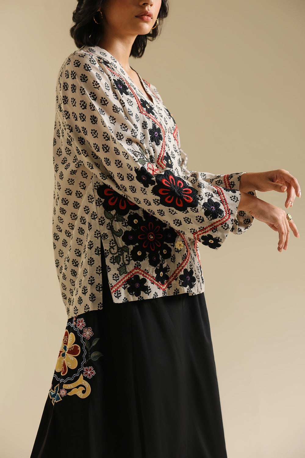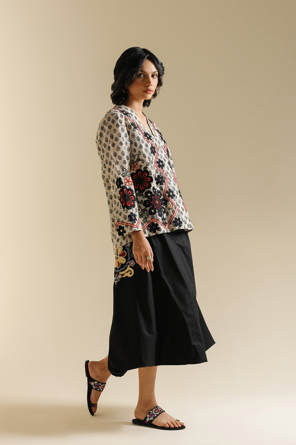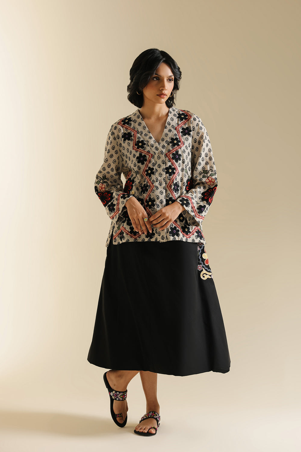 Elevate your everyday style with this versatile black A-line skirt, crafted for both comfort and elegance. Designed with a flattering mid-calf length, the skirt flows effortlessly, creating a graceful silhouette that transitions seamlessly from casual to semi-formal looks. The clean black base is beautifully highlighted with subtle embroidered accents on one side, adding a touch of artisanal charm. Pair it with vibrant printed tops or minimal solids to make it your go-to piece for chic, effortless dressing.