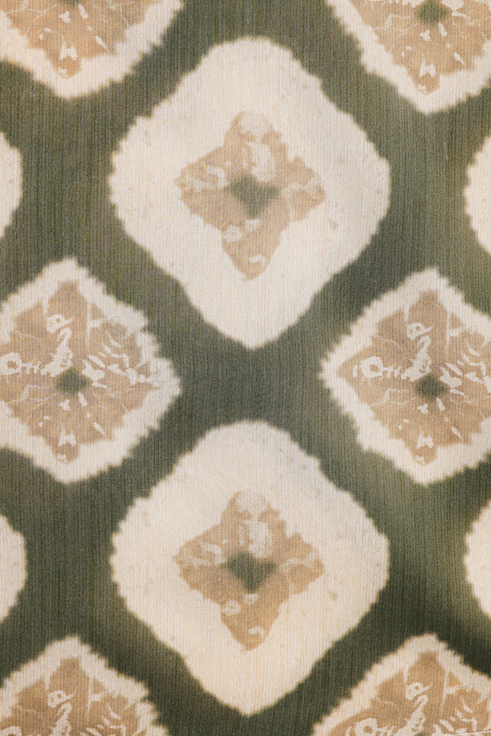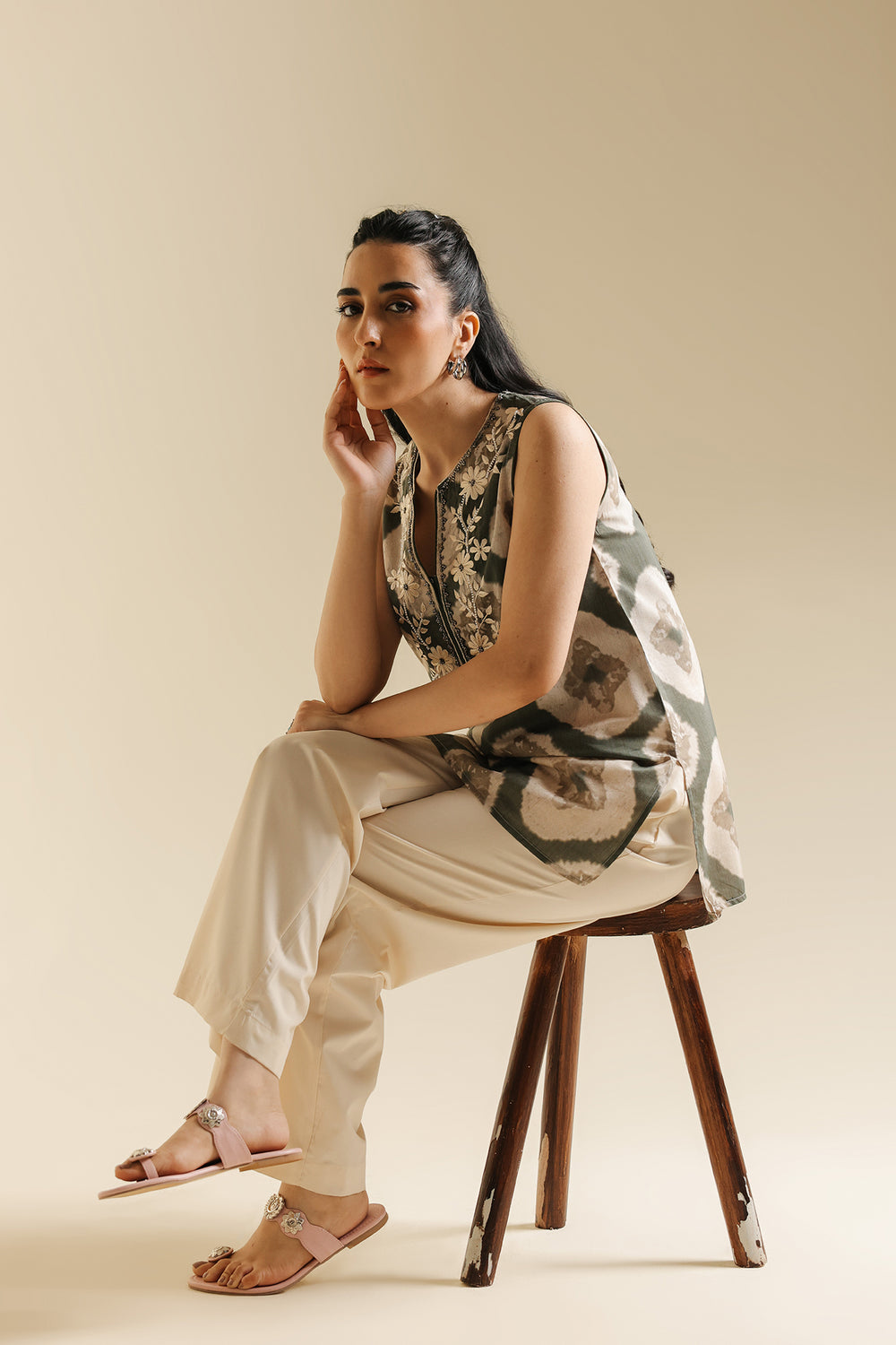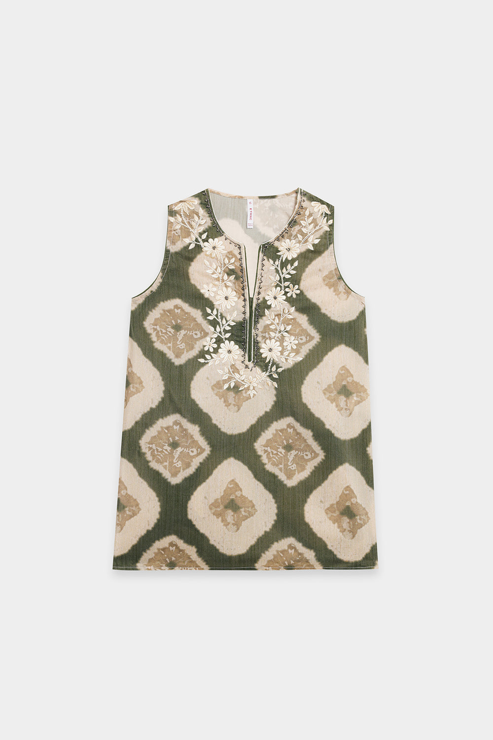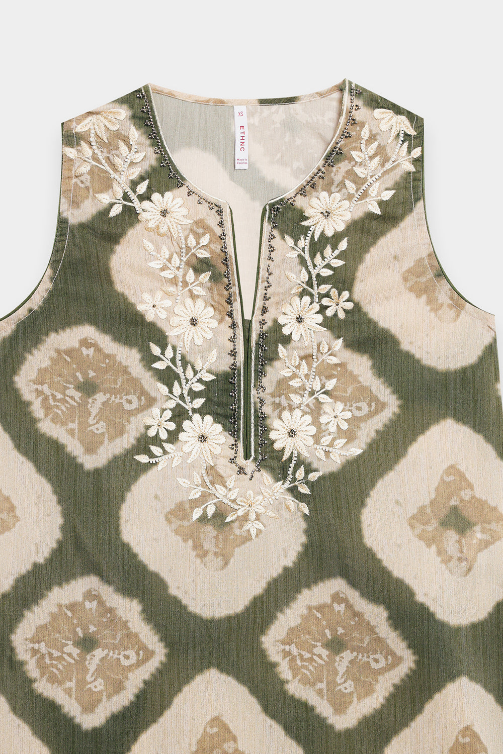 Project modern artistry with this chic embroidered top. The top is crafted from a fabric in a light, earthy-green hue and features a striking all-over print pattern in muted tones. The design is elegantly balanced by delicate tonal and white thread embroidery concentrated around the neckline and yoke.