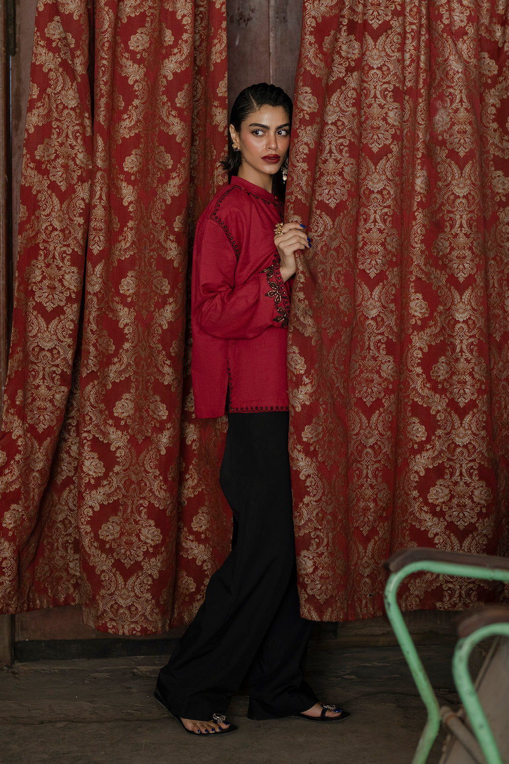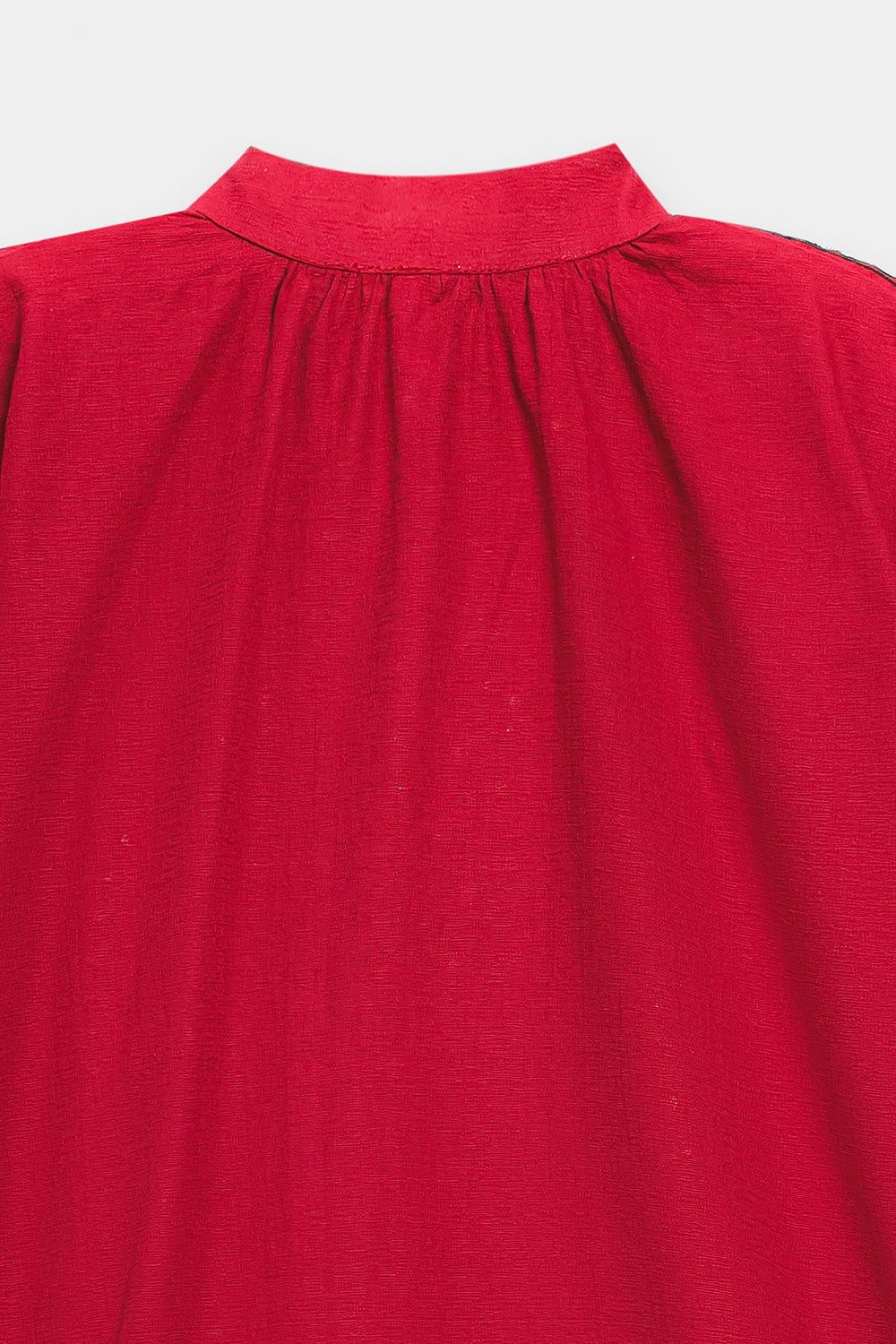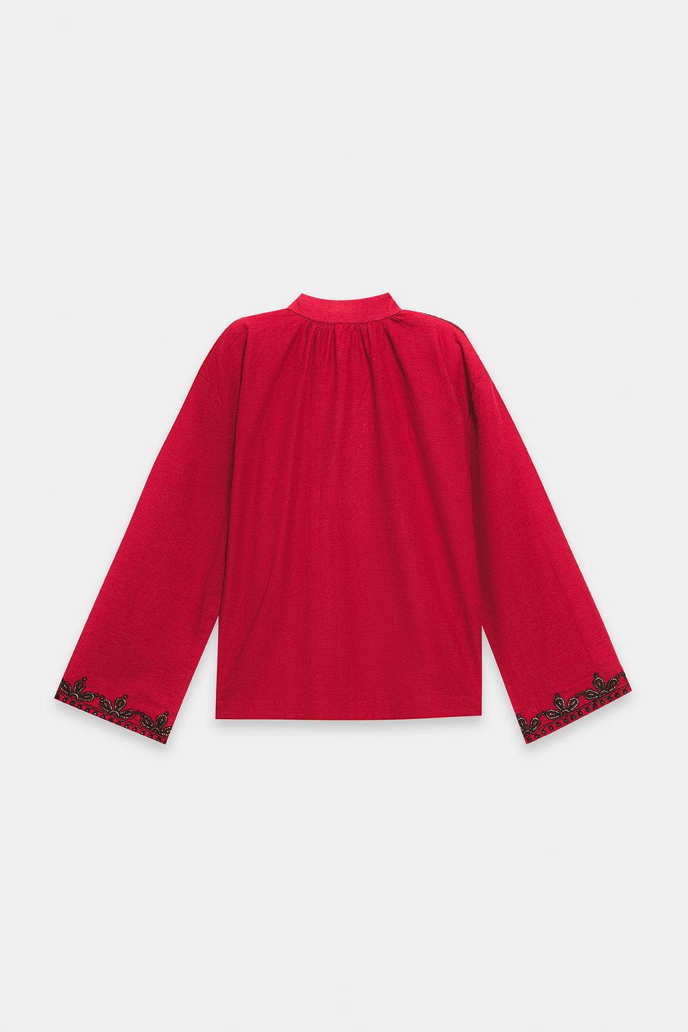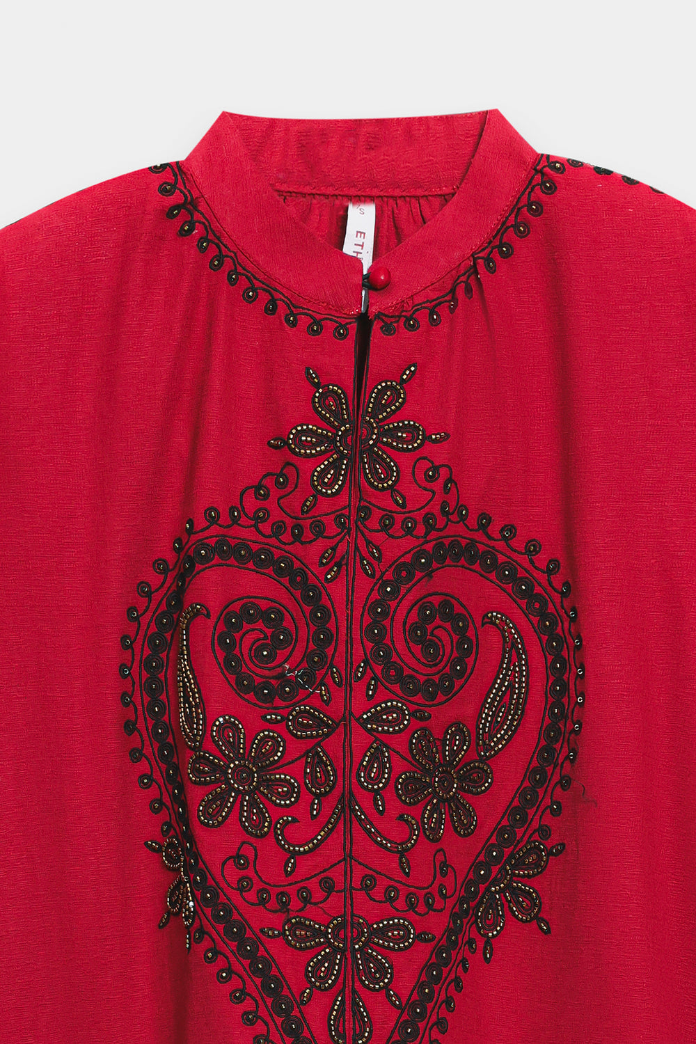Make a vibrant statement in this rich crimson embroidered shirt, featuring a striking heart-shaped artisanal motif as its centerpiece. The intricate black threadwork flows along the neckline, shoulders, and cuffs, offering a bold contrast against the fiery fabric. Its relaxed silhouette and band collar ensure a perfect blend of tradition and modern flair.